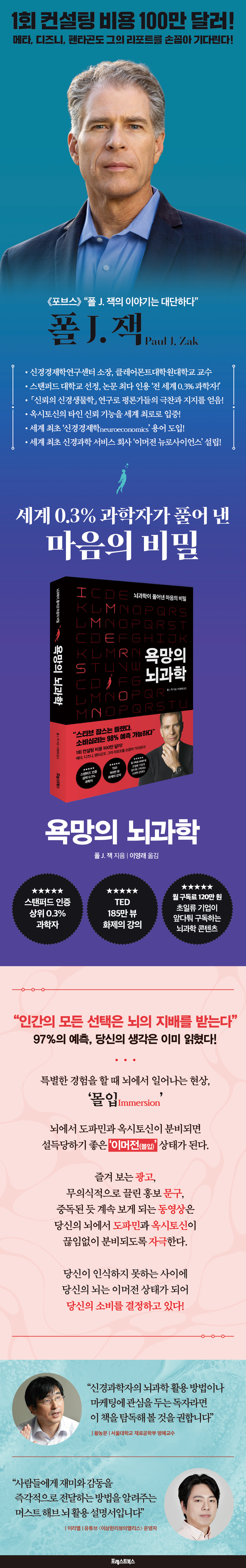 논문 인용 전세계 상위 0.3% 뇌과학자가 풀어낸 마음의 비밀 『욕망의 뇌과학』(원제: 『Immersion』) 저자이자 펜타곤, 메타(페이스북), 파라마운트 등 굵직한 초일류기업이 먼저 찾는 폴 J. 잭 박사는 뇌 영상(brain imaging)을 연구하여 옥시토신이 어떻게 낯선 사람들 간의 신뢰 행동을 가능하게 하는지 처음으로 밝혔고, 이후 180편 이상의 논문을 발표했다. 그가 제출한 논문의 인용 수는 2만 회(2023년 4월 기준)를 웃돌고 있으며, 스탠퍼드 대학교 연구진은 그를 세계에서 논문이 가장 많이 인용된 ‘상위 0.3%에 속하는 과학자’로 선정하기도 했다. 폴 J. 잭 박사에 의하면 우리가 특별한 경험을 할 때 뇌에는 고유한 일련의 신호, 즉 도파민과 옥시토신이 분비된다. 그는 이 현상을 ‘몰입(immersion)’이라고 이름 붙였다. 도파민은 코르티솔과 같은 각성 호르몬의 증가를 유발하여 가치 있는 것에 대한 관심도(주의)를 높인다. 옥시토신은 사회 활동을 하며 상대방을 신뢰하게 되었을 때 분비되는데, 옥시토신이 분비되면 공감력이 높아지고 분비량이 증가하면 행동에까지 영향을 미친다. 바꿔 말하면 ‘몰입’은 어떤 경험을 특별하다고 여기고 그 특별함을 지속하기 위해 행동하기로 설득된 상태라고 할 수 있다. 우리는 몰입을 이해함으로써 나 자신의 소비 기준과 패턴을 다시 정립할 수 있고, 역으로 누군가를 몰입하게 만들려면 무엇이 필요한지도 깨닫게 될 것이다. “인간의 모든 선택은 뇌의 지배를 받는다” 97%의 예측, 당신의 생각은 이미 읽혔다! 860억 개에 이르는 뉴런의 건초더미 속에서 ‘몰입’ 신호라는 바늘을 찾아야 했던 폴 J. 잭 박사는 신호 탐지 방법을 개발하기 위해 연구를 거듭했다. 지난 20년간의 연구로 사람들이 특별한 경험으로 인지하는 알고리즘을 파악했다. 사람들의 신경학적 몰입을 알게 되자 특별한 것을 만드는 과정을 역으로 설계할 수 있게 되었다. 폴 박사는 이 접근법을 통해 다양한 분야에 ‘몰입’ 개념을 적용했고 83~97%의 확률로 결과를 예측할 수 있었다. 그는 자신의 연구 과정과 몰입 적용 성공 사례를 8개의 장으로 나누어 설명하고 있다. 『욕망의 뇌과학』 1장에서는 몰입과 관련한 신경과학적 이론부터 차근차근 설명한다. 사람들이 좋다고 평가한 것과 사람들의 기억에 오래 남는 것은 다르며 여기에는 몰입이 관여한다. 미국 슈퍼볼과 공익 광고 분석을 통해 그 이유를 알아본다. 2장에서는 사람들의 몰입을 끌어내어 인식을 전환하거나 순조롭게 판매까지 끌어낸 대박 광고와 망한 광고를 비교 분석한다. 그리고 광고에서 기업의 제품을 효과적으로 각인시킬 방법을 구체적으로 제시한다. 3장에서는 엔터테인먼트 콘텐츠에 몰입을 적용하는 방법을 알아본다. 흥행하는 영화 예고편의 특징, 몰입도를 높이는 편집 방법, 시나리오를 흥미롭게 만들고 음원 스트리밍 수를 높이는 데 필요한 요소와 인기 TV 프로그램의 특징을 알려준다. 4장에서는 심리적 안전과 심리적 좌절의 개념, 20-20-20 규칙 등을 활용하여 청중이나 학생이 정보를 효과적으로 흡수하고 단기 기억에서 장기 기억으로 쉽게 이동시키는 방법을 안내한다. 5장에서는 온라인으로 무제한 엔터테인먼트를 즐길 수 있는 21세기에 사람들을 집 밖으로 나서게 만드는 방법을 설명한다. 디즈니랜드, 명품 쇼핑이 사람들을 끌어당기는 뇌과학적 이유와 현시대에서 소매업체가 나아가야 할 방향성, 길거리 광고판을 유용하게 사용하는 방법을 말한다. 6장에서는 효율을 높일 수 있는 기업 문화 조성과 직원 교육 방법을 알아본다. 직원이 자신의 능력을 최대치로 끌어낼 수 있도록 개인의 강점과 과업을 연결하여 업무를 분담하고, 몰입할 수 있는 환경 조성을 위해 기업과 관리자가 해야 할 일을 제안한다. 7장에서는 기호나 취향이 정해져 있는 사람을 의도에 맞게 설득하는 방법을 다룬다. 과연 다른 사람에게 자신의 의견을 제안하는 것이 윤리적인 행위인지, 정치적 선호도는 어떻게 변화시킬 수 있는지 알아본다. 그리고 선호를 변화시킬 저자만의 공식을 소개한다. 마지막으로 8장에서는 몰입이 필요한 인구집단을 분석하여 제품이나 서비스에 적용하고, 몰입이 인생에 어떤 가치를 가져오는지 살펴본다. “몰입은 당신의 소비를 춤추게 한다” 몰입은 당신의 소비를 조장하거나 가장 강력한 홍보 수단이 된다 뇌가 ‘몰입’ 상태일 때는 30초가 넘어가는 광고도 끝까지 보게 되고, 1시간이 넘는 동영상도 재미있게 감상하며 3시간 넘게 반복되는 회의도 짧게 느껴진다. 우리가 즐겨보는 광고, 무의식적으로 구매하는 상품의 홍보 문구, 중독된 듯 계속 보게 되는 동영상은 뇌에서 도파민과 옥시토신이 끊임없이 분비되도록 자극한다. 인식하지 못하는 사이에 뇌는 우리의 소비까지 결정한다. 폴 J. 박사는 인간의 욕망을 뇌과학적으로 증명하고 어떻게 하면 사람들이 열광하는 콘텐츠를 생산할 수 있는지 명확한 방법을 사례별로 제시하고 있다. 책에서 제시하는 성공 사례들을 통해 특별한 경험이 어떻게 ‘만들어지는지’ 살펴보고, 지침으로 삼는다면 머지않아 독자들도 자신만의 특별한 경험을 만들어 낼 수 있을 것이다.