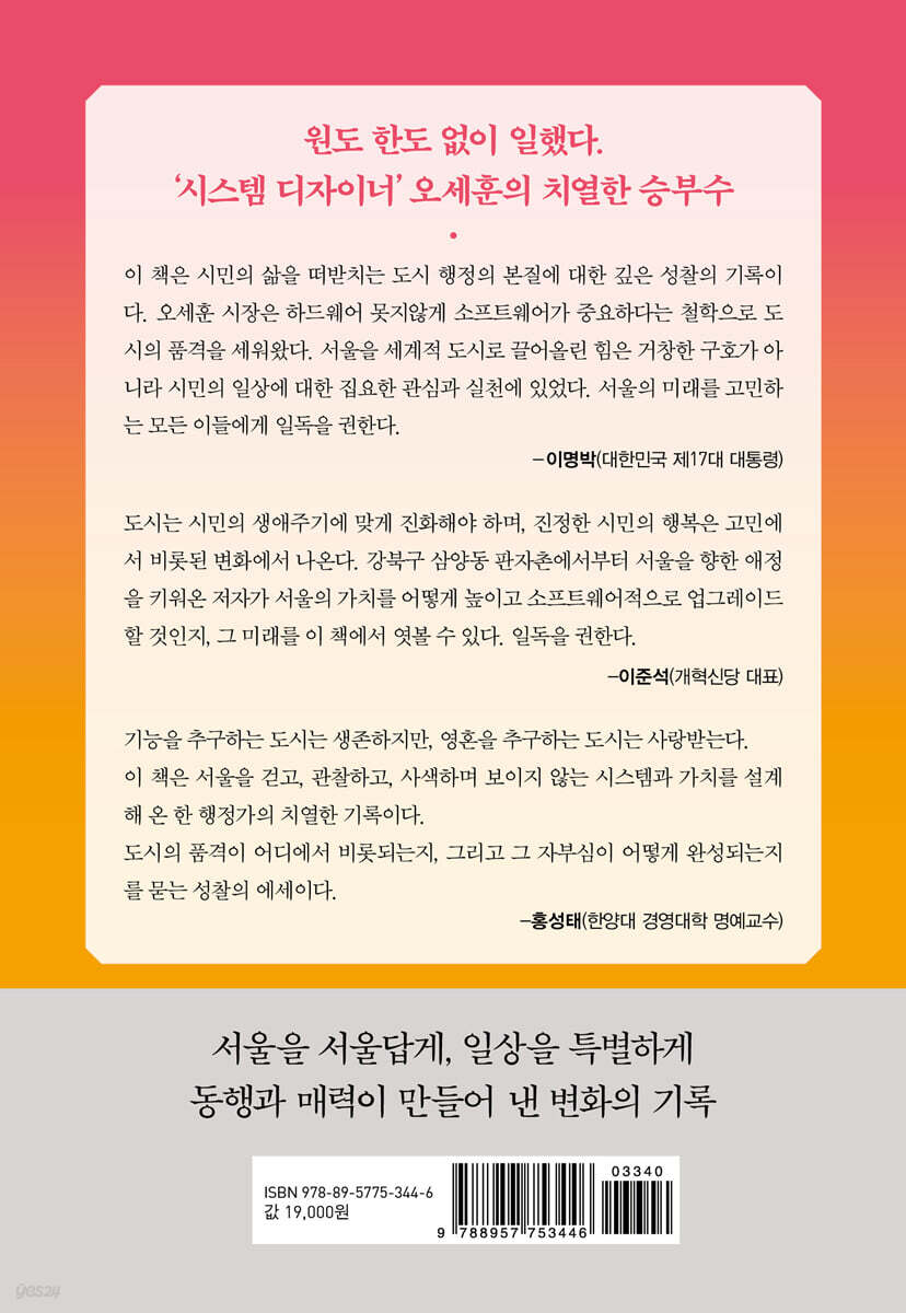 이 책은 시민의 삶을 떠받치는 도시 행정의 본질에 대한 깊은 성찰의 기록이다. 오세훈 시장은 하드웨어 못지않게 소프트웨어가 중요하다는 철학으로 도시의 품격을 세워왔다. 서울을 세계적 도시로 끌어올린 힘은 거창한 구호가 아니라 시민의 일상에 대한 집요한 관심과 실천에 있었다. 서울의 미래를 고민하는 모든 이들에게 일독을 권한다. - 이명박 (대한민국 제17대 대통령)