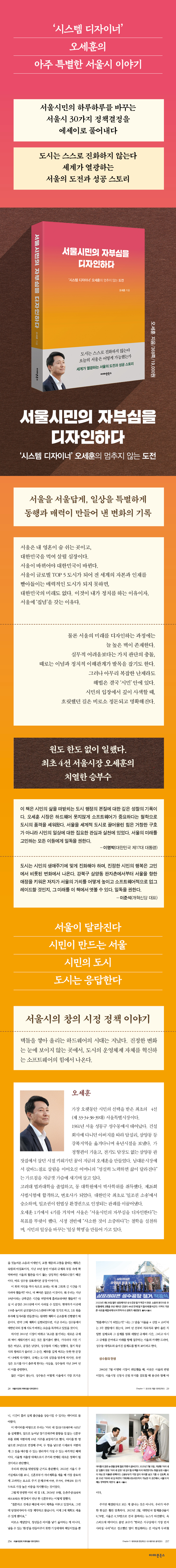 -한류의 배경이 아닌 주인공, 글로벌 콘텐츠가 선택한 ‘서울의 일상’ -도시 브랜드는 환상이 아니다…감각의 축적이 경쟁력이 되는 순간 -성수동의 반전이 증명한 것, 규제를 설계하자 미래가 움직였다 오세훈 시장은 2006년 7월 1일 민선 4기 서울특별시장으로 임기를 시작했다. 현재 민선 8기를 이끄는 4선 서울특별시장이다. ‘디자인 서울’, ‘한강르네상스’, ‘디딤돌소득’, ‘서울런’, ‘미리 내 집’, ‘정원도시박람회’에 이르기까지, 그는 임기 내내 정책을 통해 도시의 방향을 설계해 왔다. 유행을 좇기보다, 도시의 체질을 바꾸는 선택들이었다. 단기 성과보다, 지속 가능한 시스템을 구축한 결정의 연속이었다. 그런 의미에서 저자에게 가장 적합한 수식어는 바로 ‘시스템 디자이너’다. 그는 단기적인 성과에 급급해 보여주기식 행정을 펼치는 것을 경계했다. 대신 무너진 계층 이동의 사다리를 복원하고, 기후 위기에 대응하는 지속 가능한 교통망을 구축하는 등 ‘지속 가능한 시스템’을 만드는 데 천착했다. 그런 의미에서 저자에게 가장 적합한 수식어는 ‘정치인’이나 ‘행정가’를 넘어 바로 ‘시스템 디자이너’다. 도시는 거대한 하드웨어가 아니라, 그 안에서 살아가는 시민들의 삶을 담아내는 소프트웨어, 즉 운영체제(OS)의 혁신을 통해서만 진정으로 변할 수 있다고 믿기 때문이다. 저자는 13대째 명륜동 등지에서 살아온 서울 토박이다. 어린 시절은 한강변에서 자랐고 청년기 내내 남산을 바라보며 성장했다. 서울은 그에게 행정의 대상이 아니라 삶의 무대이자 정신의 좌표다. 매일 아침 남산을 오르며 그는 생각한다. ‘이 도시가 시민들에게 자부심이 되려면 무엇이 필요한가?’ 이 책 『서울시민의 자부심을 디자인하다』는 서울을 ‘관리한 기록’이 아니라, 도시의 자존을 다시 세우려 한 행정가의 분투기다. 그 결정들이 시민의 일상과 감각을 어떻게 바꿔놨는지, 그리고 그 변화가 어떻게 서울이라는 도시의 격(格)을 높였는지 집요하게 추적한 생생한 보고서다. -보이지 않던 도시 서울, 세계 지도에서 지워진 자존을 묻다 저자는 2008년의 어느 아침 풍경을 회상하며 이야기를 시작한다. 늘 익숙하게 보아 오던 CNN 일기예보 시간의 동아시아 지도 위. 그날도 서울은 없었다. 도쿄·베이징·상하이는 선명하게 표시되어 있는데, 서울의 자리는 비어 있었다. 우리가 그토록 자부하던 ‘한강의 기적’, 88 올림픽의 감동과 2002 월드컵의 붉은 함성도 세계인의 냉정한 시선에서는 지도 밖의 이야기였다. 서울은 그저 거대 도시 도쿄와 베이징 사이에 낀, 굳이 주목할 필요가 없는 무채색의 도시에 불과했다. DDP를 지어 디자인의 거점을 만들고, 회색빛 한강을 다듬어 시민의 쉼터로 돌려주고, 도시 곳곳의 디자인을 혁신하는 일. 그것은 단순한 미화 작업이 아니라, 세계 속에서 서울시민의 자부심을 지키기 위한 절체절명의 과제였다. -글로벌 콘텐츠가 선택한 도시, 서울의 일상이 무대가 되다 그리고 17년이 지난 2025년, 한 편의 애니메이션이 전 세계를 사로잡는다. 넷플릭스 글로벌 흥행작 〈케이팝 데몬 헌터스(이하 케데헌)〉. 소니 픽처스가 제작하고 넷플릭스가 배급한 이 글로벌 대작의 배경은 뉴욕도, 도쿄도 아닌 바로 서울이다. 루미와 진우가 교감하는 장소는 낙산공원 성곽길이었고, 뚝섬한강공원은 사자보이즈가 휴식을 즐기거나 안무 연습을 하는 공간으로 그려진다. 북촌 한옥마을의 기와지붕 위를 날아다니는 장면에서 전 세계 시청자들은 열광했다. 과거 헐리우드 영화 속 서울이 전쟁의 폐허나 회색빛 아파트 숲으로 그려졌다면, ‘케데헌’ 속 서울은 달랐다. 전통과 첨단이 공존하는 가장 힙한 도시, 영감을 주는 매력적인 공간으로 그려졌다. 20년 전, 낡고 허물어져 가던 성곽을 복원하고 조명을 설치할 때 ‘세금 낭비’의 결과물 따위로 취급되던 그곳이, 이제는 전 세계 2억 6천만 명이 열광하는 이야기의 무대가 되었다. 서울의 이름값은 곧 대한민국의 가격이다. 그리고 그것은 결국 서울시민 한 사람 한 사람의 자부심으로 돌아온다. 이 책은 그 변화가 우연이 아니라는 사실을 집요하게 증명한다. -성수동 빅뱅, 규제를 걷자 미래의 가능성이 열렸다 성수동의 변신은 이 책에서 가장 입체적으로 다뤄지는 사례다. 2002년 7월 이명박 시장 취임 당시, 성수동은 서울시청 신청사 건립부지를 검토할 때 용산과 함께 마지막까지 경쟁하던 전략적 요충지였다. 이와 동시에 낡은 공장들이 매연과 소음을 뿜어내던, 산업의 그늘이 짙게 드리운 공간이기도 했다. 이명박 시장은 이 자리에 뉴욕의 센트럴파크와 같은 휴식공간을 만들기로 했고, 그 결과 2005년 6월 35만 평 규모의 서울숲이 시민 앞에 모습을 드러냈다. 2006년, 바통을 이어받아 서울시장이 된 저자는 이 거대한 숲의 에너지가 도시 전체로 퍼져나가야 한다고 생각했다. 2007년 서울시는 뚝섬 특별계획구역에 대한 세부 개발계획을 결정했다. 오늘날 성수동을 상징하는 갤러리아포레(1구역), 아크로서울포레스트(3구역) 등 랜드마크들이 이때 정해졌다. 서울숲과 한강을 동시에 조망할 수 있는 입지, 그리고 성수대교만 