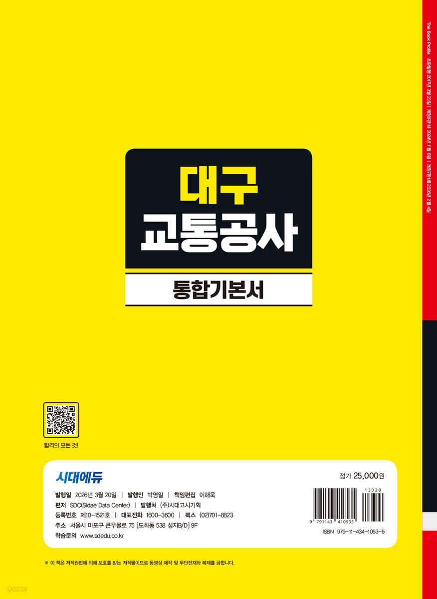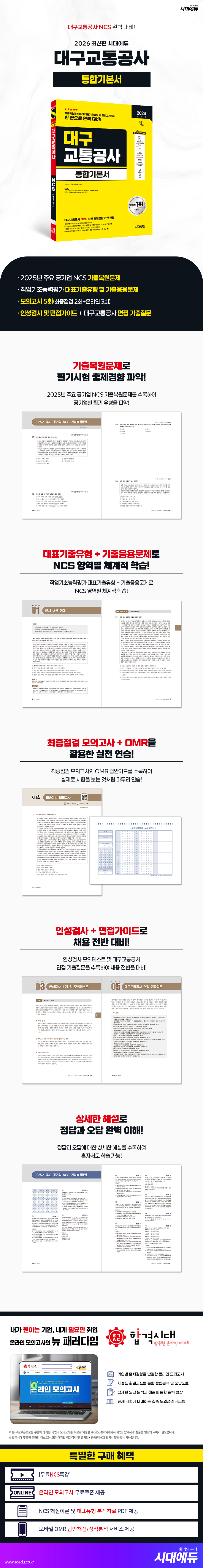 대구교통공사는 2026년에 신입사원을 채용할 예정이다. 채용절차는 「원서접수 → 필기시험 → 서류접수 및 심사 → 인성검사 → 면접시험 → 최종합격자 발표」 순서로 이뤄진다. 필기시험의 경우 NCS는 공통으로 의사소통능력, 문제해결능력, 대인관계능력, 수리능력, 정보능력 5개의 영역을 평가한다. 또한 전공은 분야별ㆍ직종별로 내용이 상이하며, 필기시험에서 채용예정인원의 2배수를 선발하므로 합격을 위해서는 필기시험의 고득점이 필요하다. 아울러 2026년부터 대구교통공사 응시자 지역제한이 재도입되었다. 이에 대구교통공사의 필기시험 합격을 위해 시대에듀에서는 대구교통공사 판매량 1위의 출간 경험을 토대로 한 온라인 모의고사를 무료로 응시할 수 있는 쿠폰을 발급하여 대구교통공사 문제 유형에 대한 연습과 함께 자신의 실력을 최종 점검할 수 있도록 하였다. |
