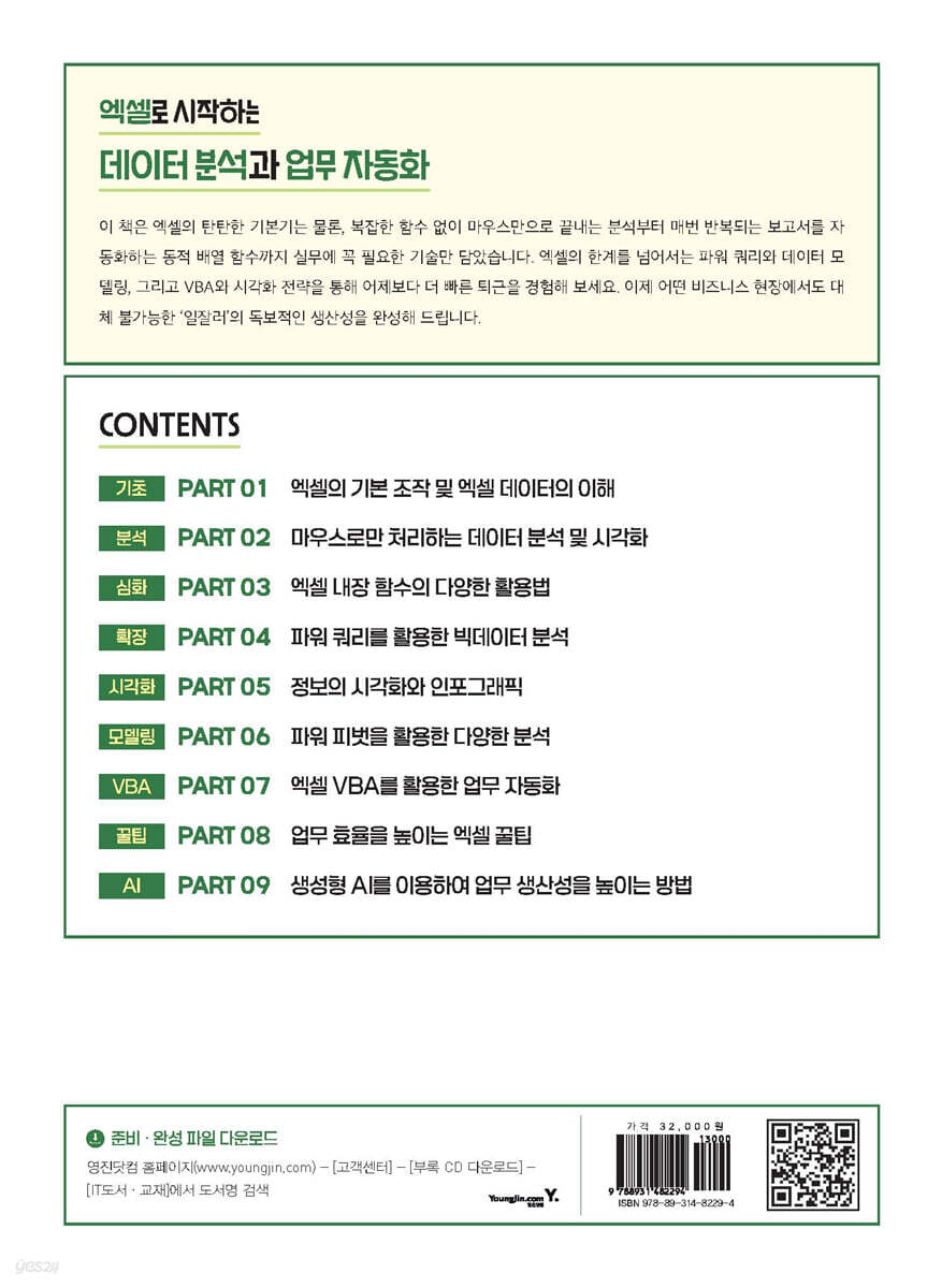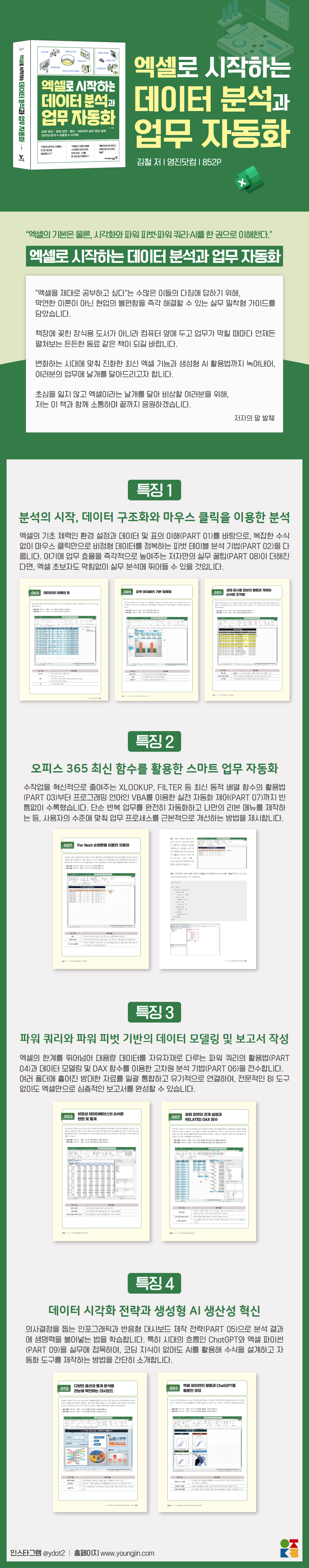 001 엑셀의 화면 구성과 명칭 002 환경 설정과 빠른 실행 도구 모음 003 데이터의 이해와 표 004 다양한 현업 활용 사례와 팁 PART 02 마우스로만 처리하는 데이터 분석 및 시각화 001 피벗 테이블의 기본 활용법 002 특정 기간의 매출 분석 및 정렬, 비율 표시법 003 매출과 매출 비율, 전년 대비 매출과 비율, 전월 대비 매출과 비율 나타내기 004 시스템 다운로드 자료의 문제점 해결 및 분석 005 다양한 조합의 결과를 한눈에 확인 가능한 대시보드 작성법 006 함수 없이 만드는 반응형 보고서(보고서 형식이 피벗과 다른 경우) 007 비정형 기간 반응형 보고서 008 문자로 입력된 시간을 포함한 날짜 시계열 데이터의 변환 009 데이터 형식을 변환해도 그룹이 되지 않거나, 통계가 되지 않는 데이터의 해결 방법 PART 03 엑셀 내장 함수의 다양한 활용법 001 Hash Sign(#)과 트리밍 참조 002 좀 더 자동화된 반응형 보고서 003 행과 열의 데이터 정리를 한 번에 처리하는 BYROW, BYCOL 함수 004 FILTER 함수의 다양한 활용 사례와 자동화 005 VLOOKUP, HLOOKUP, INDEX-MATCH, IFERROR 수식은 XLOOKUP 함수 하나로 해결 006 여러 시트 데이터도 처리 가능한 VSTACK, HSTACK 함수 007 여러 가지 통계량을 손쉽게 처리하는 GROUPBY 함수 008 피벗 테이블이 하는 일을 함수로도 처리 가능한 PIVOTBY 함수 009 문자열의 분리, 결합 분석하는 TEXTSPLIT, TEXTJOIN 함수 010 TEXTSPLIT 함수를 활용한 비정상 데이터의 통계 011 검색 가능한 FILTER 함수 012 검색 가능한 데이터 유효성 검사와 자동 통계량 013 변동하는 단가의 최근 단가 적용 및 자동화 거래 명세서 014 면접관 상하위 점수 2개씩 제외한 신규 입사자의 면접점수 처리 결과 PART 04 파워 쿼리를 활용한 빅데이터 분석 001 파워 쿼리 데이터 형식과 날짜의 변환 002 비정상 데이터베이스의 손쉬운 변환 및 통계 003 머리글이 병합된 보고서의 데이터베이스 변환 및 통계 004 다중 시트(2개 이상)의 일괄 통계 분석 및 자동화 005 다중 시트의 다른 필드명 자료 일괄 통계 분석 006 다중 시트의 이름을 일괄 변경하고 통계 분석하기 007 병합을 활용한 효율적 데이터 관리 및 분석 008 다중 시트의 반응형 보고서 009 다중 시트의 자동 변환 전월 대비 보고서 010 네이버 주식 자료의 크롤링 및 손쉬운 시각화 011 사용자 정의 함수를 이용한 네이버 주식 자료의 자동 크롤링 012 특정 기간의 통계 및 세부 내역 013 폴더 내 파일(36개) 일괄 통계 분석 014 폴더 내 다른 필드명 파일 일괄 통계 분석 PART 05 정보의 시각화와 인포그래픽 001 셀에서 표시하는 추이 곡선 및 차트 효과 002 스파크라인을 활용한 목표 관리 003 조건부 서식을 이용한 다양한 시각화 기법 004 조건부 서식을 활용하는 자동화 휴가 계획표 005 목표 대비 실적 분석을 위한 이중 축 차트 006 가로 막대 차트와 와플 차트를 활용한 진행 상황 시각화 007 원형 차트를 활용한 목표 대비 실적 시각화 008 성별 제품 만족도 표시 인포그래픽 기법 009 슬라이서와 표를 이용한 대륙별 지도 차트 010 확인란을 이용한 선택 데이터의 대비 분석 차트 011 세부 디테일을 표시하는 원형 대 원형 차트 012 다양한 옵션과 다양한 통계 분석을 한눈에 확인하는 대시보드 013 Sankey Diagam 작성하기 PART 06 파워 피벗을 활용한 다양한 분석 001 추가 기능으로 파워 피벗을 메뉴 탭에 표시하는 방법 002 파워 피벗으로 데이터를 로딩하는 방법 003 데이터 모델의 통계량을 활용한 통계 오류 처리 004 계산 필드의 오류를 수정하는 SUMX DAX 함수 005 CALCULATE DAX 함수를 활용한 전년도 대비 매출 분석 006 예약자 현황을 손쉽게 확인하는 CONCATENATEX DAX 함수 007 파워 피벗의 관계 설정과 RELATED DAX 함수 008 계층 구조를 활용한 시각화 기법 PART 07 엑셀 VBA를 활용한 업무 자동화 001 매크로 기록기의 사용법과 코드의 이해 002 데이터 범위의 다양한 선택 방법과 속성 003 사용자 메뉴 작성 및 디버깅을 위한 폰트 변경 004 IF, With 문의 사용법 005 Select Case 문의 사용법 006 VBA에서 엑셀 함수를 사용하는 방법 007 For Next 순환문을 이용한 자동화 008 병합, 또는 2행씩 나열되어 있는 데이터의 처리 009 여러 시트의 데이터를 한번에 처리하는 자동화 010 주민번호를 검증하는 사용자 정의 함수 011 나만의 리본 메뉴 탭을 만드는 방법 PART 08 업무 효율을 높이는 엑셀 꿀팁 001 상태 표시줄 정보의 활용과 개체의 손쉬운 조작법 002 셀 서식과 이름 정의의 다양한 활용법 003 정렬을 사용한 데이터 조작과 대표 문자의 변환 004 한 개 열 데이터의 데이터베이스 작성법 및 다중열의 문자열 날짜 변환 005 필터된 데이터의 수정 및 함수 적용 방법 006 프로젝트 진행률을 나타내는 방법 PART 09 생성형 AI를 이용하여 업무 생산성을 높이는 방법 001 엑셀 파이썬의 활용과 ChatGPT를 활용한 코딩 002 AI를 활용한 나만의 추가 기능 탭 만들기 |