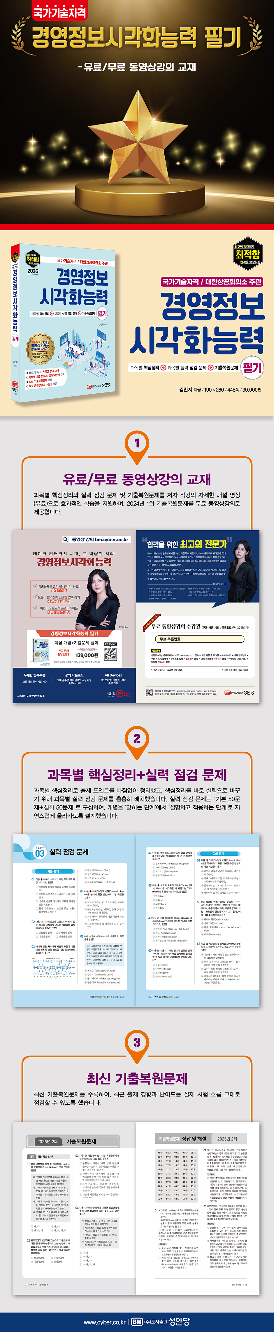 Chapter 01 경영정보 이해 01 경영, 정보, 시각화 02 기업 6대 부문 활동 및 정보 특성 Chapter 02 경영정보 분류 01 기업 내부/외부 정보 02 전략 수립을 위한 정보(PEST, 5 Forces, 3C, SWOT 등) 03 계획 수립을 위한 04 업무 운영을 위한 정보 05 성과 분석을 위한 정보 06 통합 의사결정을 위한 정보 - 실력 점검 문제 - 실력 점검 문제 정답 및 해설 PART 02 데이터 해석 및 활용 Chapter 01 데이터의 이해와 수집 01 데이터의 본질과 기초 02 데이터의 종류와 분류 03 빅데이터와 통계 기초 04 데이터 수집 기술 Chapter 02 데이터 저장과 관리 01 파일 시스템에서 데이터베이스로 02 데이터베이스 관리 시스템(DBMS) 03 관계형 데이터베이스(RDBMS)178 04 차세대 데이터베이스와 분석 시스템 Chapter 03 데이터 처리와 분석 01 데이터 전처리와 품질 관리 02 데이터 분석과 해석 03 ETL과 데이터 파이프라인 Chapter 04 데이터 활용과 보안 01 비즈니스 인텔리전스(BI) 시스템 02 데이터 기반 의사결정 03 데이터 보안과 개인정보보호 04 데이터 거버넌스와 관리 - 실력 점검 문제 - 실력 점검 문제 정답 및 해설 PART 03 경영정보시각화 디자인 Chapter 01 시각화 원리 01 디자인 원칙 02 게슈탈트 법칙 03 시각적 인코딩 04 시각화 목적 05 차트 구성요소 Chapter 02 차트 유형 01 비교 시각화 02 분포 시각화 03 관계형 차트 04 시간 시각화 05 지도 차트 06 계층 시각화 07 흐름 시각화 08 다변량 시각화 09 테이블 10 비율 비교 차트 11 부분-전체 비교 12 다이어그램 Chapter 03 인포그래픽 01 인포그래픽 정의 02 인포그래픽 요소 03 인포그래픽 종류 Chapter 04 BI와 대시보드 01 BI 도구 특징 02 BI 도구 활용 03 대시보드 구성요소 04 대시보드 특징 05 대시보드 기능 - 실력 점검 문제 - 실력 점검 문제 정답 및 해설 PART 04 기출복원문제 2024년 모의 공개문제 2024년 1회 기출복원문제(무료 동영상강의 제공) 2024년 2회 기출복원문제 2025년 1회 기출복원문제 2025년 2회 기출복원문제 2024년 모의 공개문제 정답 및 해설 2024년 1회 기출복원문제 정답 및 해설 2024년 2회 기출복원문제 정답 및 해설 2025년 1회 기출복원문제 정답 및 해설 2025년 2회 기출복원문제 정답 및 해설 |