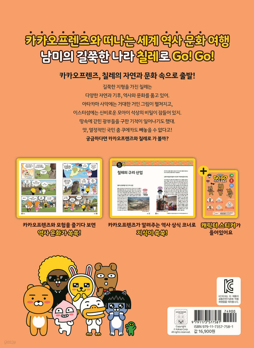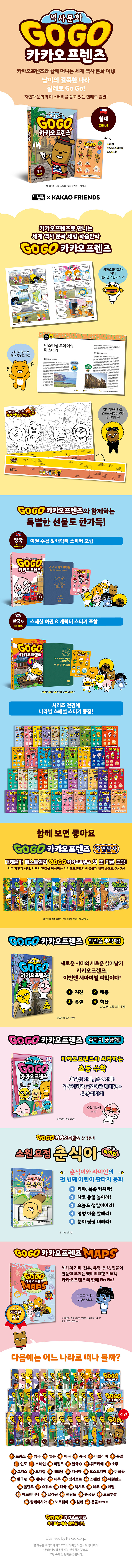 신간 칠레 편이 나왔어요! 카카오프렌즈와 세계 역사 문화를 체험하고, 스페셜 여권에 캐릭터 스티커도 모아 보세요! * 아이에게 유익한 책입니다. 직접 고르고 구매하는 책이에요! * 아이들이 세계의 역사와 문화를 쉽게 접하는 책이라서인지 아이가 너무 재미있어하네요. * 고고 카카오프렌즈는 늘 사랑입니다~ 매번 다음 편을 기다리고, 재미있게 읽고, 쏠쏠한 지식도 얻어요! * 카카오프렌즈 시리즈로 지식을 차곡차곡 쌓고 있어요. 내용도 곧잘 기억하고 무척 재미있어합니다! * 카카오프렌즈 도서 주제에 따라 아이가 가장 좋아하는 나라가 달라지고 있어요~ -〈Go Go 카카오프렌즈〉 독자들의 서평 중에서- 누적 판매 200만 부를 돌파한 초베스트셀러 〈Go Go 카카오프렌즈〉 시리즈! 한국인이 가장 사랑하는 캐릭터 ‘카카오프렌즈’와 함께 떠나는 세계 역사 문화 여행! 누적 판매 200만 부를 돌파한 베스트셀러 〈Go Go 카카오프렌즈〉 시리즈를 향한 독자들의 관심과 사랑은 여전하다. 〈마법천자문〉으로 학습만화 시장을 연 아울북과 카카오프렌즈가 만나 탄생시킨 이 시리즈에서 카카오프렌즈 캐릭터들은 여행 내내 각자의 귀엽고 사랑스러운 매력으로 활약한다. 〈Go Go 카카오프렌즈〉 시리즈는 역사를 지키키 위해 카카오프렌즈가 시간여행을 떠나며 펼쳐지는 이야기로 독자들은 카카오프렌즈와 함께 세계 곳곳의 다양한 역사와 문화를 경험한다. 깜찍한 캐릭터들과 재미있는 스토리는 물론, 알찬 정보까지 놓치지 않은 〈Go Go 카카오프렌즈〉 시리즈는 폭넓은 독자층을 자랑하며 출간되자마자 베스트셀러에 올라 꾸준한 사랑을 받고 있다. 세계라는 무대에서 꿈을 펼칠 아이들을 위한 세계 역사 문화 체험 학습만화 흥미진진한 스토리에 짜임새 있는 구성으로 학습 효과를 높였다! 세계를 무대로 꿈꾸며 성장할 아이들에게 어린 시절의 다양한 경험은 꿈의 크기를 바꾸게 할 만큼 중요한 일이다. 이 시리즈는 세계로 나아가 꿈을 펼칠 아이들을 위해 기획된 ‘세계 역사 문화 체험 학습만화’로, 처음 세계를 접하는 아이들의 호기심을 자극할 만한 주제와 내용을 재미있는 스토리로 풀어내어 세계에 대한 관심을 높인다. 다채로운 역사, 문화, 인물들의 에피소드를 통해 직접 역사의 한 장면을 경험한 듯이 내용을 이해하고, 생생한 사진과 자세한 설명으로 구성된 역사 문화 상식 코너에서 지식을 깊고 넓게 구체화할 수 있다. 책 말미에 구성된 연표를 통해 세계 역사의 흐름을 파악하고, 컬러링으로 즐겁게 마무리하는 짜임새 있는 구성으로 이뤄진 이 도서는 세계사를 처음 접하는 아이들도 세계 여러 국가의 역사와 문화를 쉽고 재미있게 느낄 수 있도록 도움을 준다. 〈Go Go 카카오프렌즈〉와 함께 온 가족이 방구석 세계 여행을 떠나 보자! |
