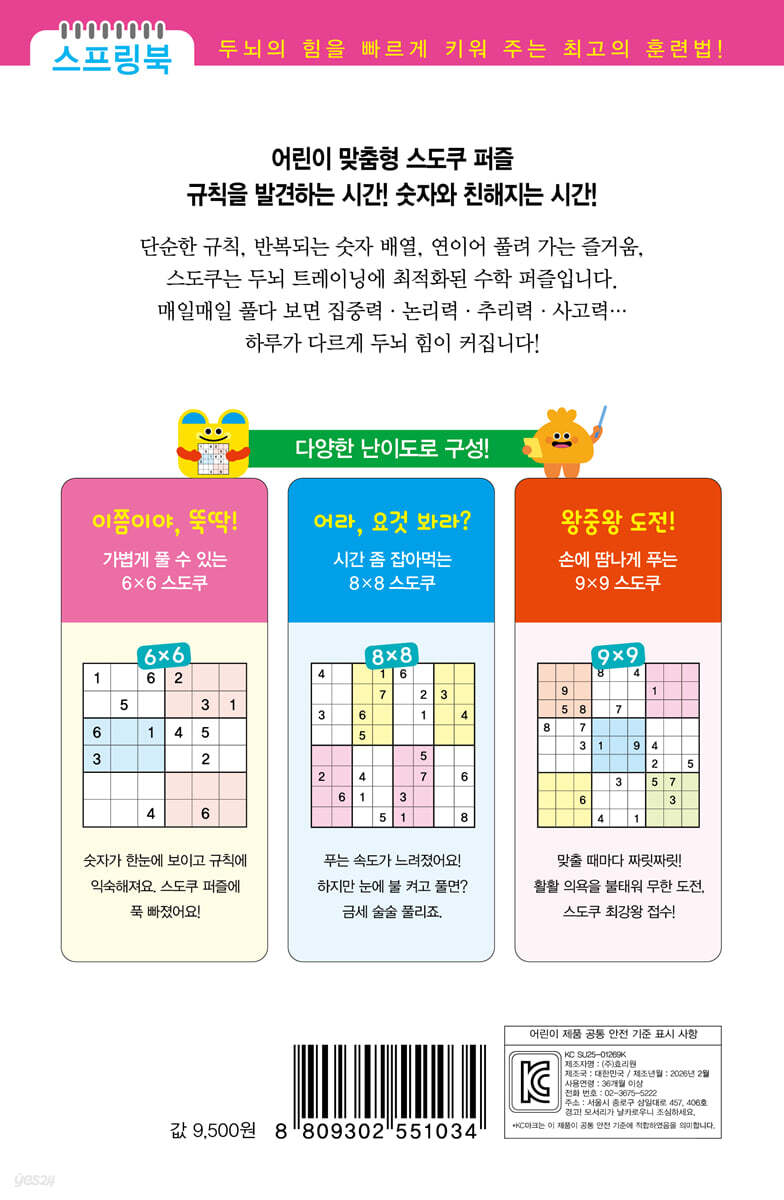 스도쿠의 재미에 푹 빠진 아이라면, 차츰 어려운 단계의 문제를 정확하게 푸는 훈련을 통해 실력을 키워야 하지요. 고급 단계인 [8×8 스도쿠]와 [9×9 스도쿠] 퍼즐은 꼼꼼하고 정확해야만 문제를 풀어낼 수 있어요. 그래서 어려운 스도쿠 퍼즐을 매일 풀다 보면, 저절로 예리한 분석·판단 능력이 자라면서 신속한 문제 해결 능력을 갖추게 됩니다. 《어린이를 위한 스도쿠 퍼즐(중급·고급 편)》은 준비 운동 단계인 [6×6 스도쿠]부터 정확하고 꼼꼼하게 따져 봐야 풀 수 있는 [8×8 스도쿠], 예리하게 파악해 빠르게 문제를 해결하는 [9×9 스도쿠] 단계로 구성되어 있어 ‘초등 스도쿠 최강자’로 거듭나고 싶은 어린이들을 위해 최적의 프로그램을 제공합니다. 집중력·논리력·수리력·창의력을 향상시키는 두뇌 훈련, 스도쿠 퍼즐! 스도쿠는 ‘숫자가 겹치지 않고 홀로 있다’는 뜻인 수독(數獨)의 일본어로, 가로세로 줄에 한 숫자가 한 번만 들어가도록 하는 퍼즐 게임입니다. 전두엽이 폭발적으로 발달하는 초등 어린이들의 뇌세포를 자극하여 기능을 빠르게 향상시키는 아주 좋은 놀이법이지요. 뿐만 아니라, 어린이들이 가지고 있는 무궁무진한 상상력과 창의력은 물론 집중력·논리력·수리력을 키워 주는 초등 두뇌 훈련 프로그램이기도 합니다. |