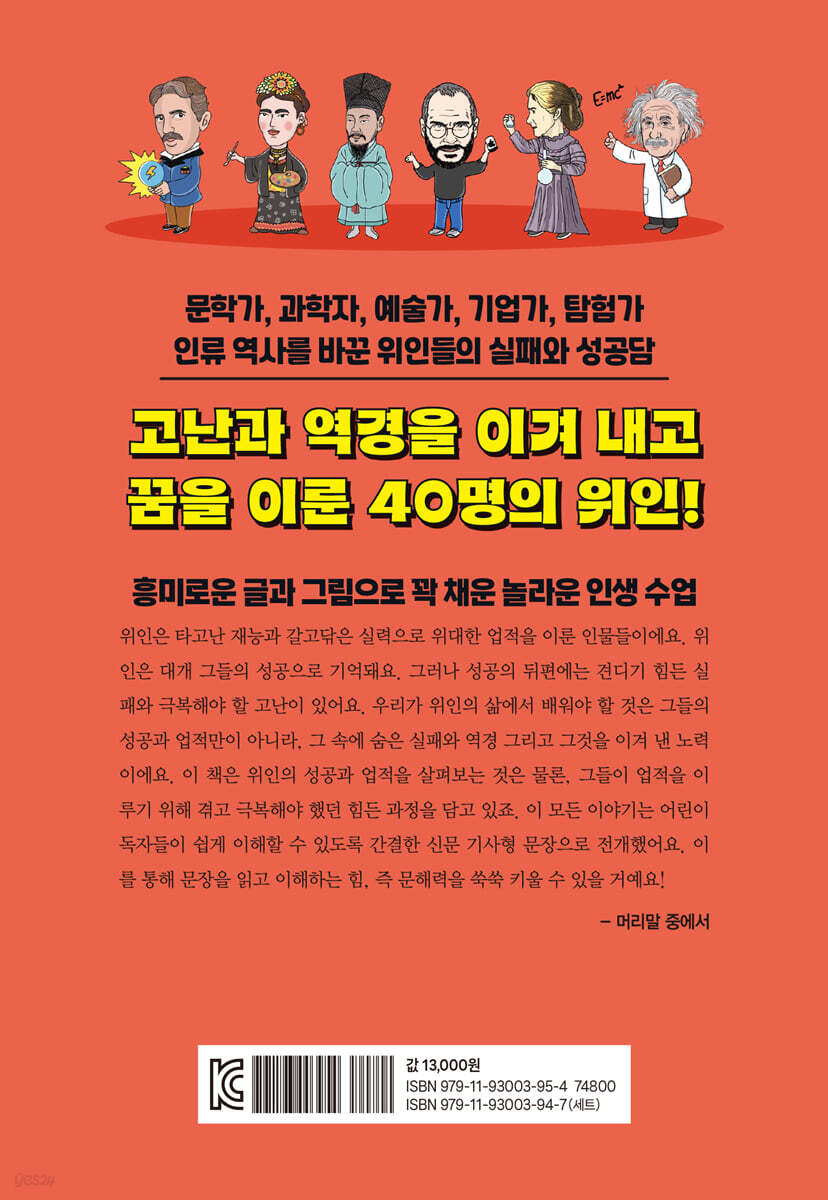 1장 숱한 실패를 이겨 내고 역사에 발자취를 남기다 토머스 에디슨 - 수천 번의 실패를 이겨 낸 발명왕 에이브러햄 링컨 - 노예를 해방시킨 위대한 미국 대통령 스티브 잡스 - 스마트폰으로 세상을 바꾼 애플 창립자 커널 샌더스 - 늦은 나이에 KFC를 성공시킨 노력가 월트 디즈니 - 상상력으로 꿈과 희망을 전한 창작자 로알 아문센 - 남극점을 최초로 정복한 위대한 탐험가 라이트 형제 - 비행의 꿈을 이룬 발명가 형제 루돌프 디젤 - 디젤 엔진의 아버지 헨리 포드 - 자동차 산업을 발전시킨 자동차 왕 찰스 굿이어 - 실패 속에서 고무의 가치를 발견한 발명가 2장 불편한 몸으로 남다른 업적을 이루다 프리다 칼로 - 슬픔과 고통을 예술로 승화시킨 초현실주의 화가 루트비히 판 베토벤 - 청력을 잃고도 위대한 작품을 창조한 음악의 성인 스티븐 호킹 - 끊임없는 호기심으로 이론 물리학을 연구한 과학자 마이클 펠프스 - 수영계의 전설로 남은 인간 물고기 헬렌 켈러 - 시청각 장애를 극복한 인권 운동가 사마천 - 동양 최고의 역사책 『사기』를 지은 역사학자 아베베 비킬라 - 아프리카 출신 최초의 올림픽 금메달리스트 3장 고난과 역경을 이겨 내고 위대한 인물로 우뚝 서다 정약용 - 500권 넘는 국보급 저술을 남긴 조선 후기 실학자 넬슨 만델라 - 자유와 평등을 위해 투쟁한 남아공 대통령 이순신 - 임진왜란을 승리로 이끈 조선 최고의 장수 니콜라 테슬라 - 전기의 발전을 이끈 천재 과학자 찰리 채플린 - 웃음으로 세상을 풍자한 영화 예술가 구암 허준 - 『동의보감』을 쓴 의학의 성인 베이브 루스 - 미국 메이저 리그의 전설적인 홈런왕 매리언 앤더슨 - 인종 차별을 이겨 낸 최고의 흑인 성악가 마이클 패러데이 - 전기의 비밀을 밝혀 낸 전자기학의 아버지 마리 퀴리 - 방사능을 연구한 최초의 여성 노벨상 수상자 4장 알아주는 사람이 없어도 자신의 위대함을 완성하다 빈센트 반 고흐 - 현대인이 가장 사랑하는 화가 조앤 롤링 - 『해리 포터』를 탄생시킨 세계적인 베스트셀러 작가 이중섭 - 시대의 상처를 화폭에 그린 대한민국의 국민 화가 한스 크리스티안 안데르센 - 수많은 명작을 남긴 아동 문학의 아버지 폴 세잔 - 새로운 회화의 역사를 탄생시킨 예술가 앙리 루소 - 강렬한 색채로 개성적인 그림을 그린 일요 화가 갈릴레오 갈릴레이 - 평생을 연구해 지동설을 증명한 과학자 그레고어 멘델 - 유전의 법칙을 밝힌 유전학의 아버지 5장 학교에서는 꼴찌였지만 위대한 업적을 이루다 알베르트 아인슈타인 - 놀라운 창의성으로 상대성 이론을 밝힌 물리학자 파블로 피카소 - 미술계의 혁명을 가져 온 입체주의 미술가 오노레 드 발자크 - 시대 현실을 정확히 그린 사실주의 작가 오귀스트 로댕 - 독학으로 최고의 조각가가 된 근대 조각의 창시자 조지 버나드 쇼 - 풍자와 유머로 세상을 그린 세계적 작가 |
