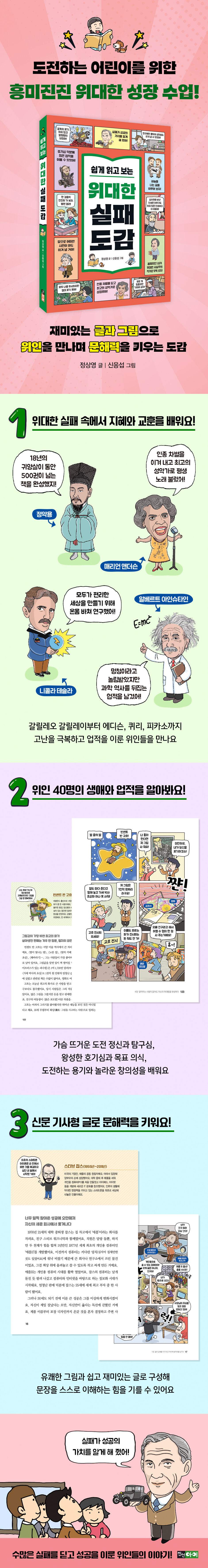스마트폰의 발명으로 인류의 생활을 바꾼 스티브 잡스, 유전 법칙을 발견했지만 사후에야 인정받은 그레고어 멘델, 여성이라는 이유로 차별받으면서도 최초의 여성 노벨상 수상자가 된 마리 퀴리, 불치병과 싸우면서도 평생 과학을 연구한 스티븐 호킹…. 그 누구보다도 뛰어난 재능과 천재성을 지닌 위인들도 가난과 신체적 장애, 주변의 무시 등으로 인해 많은 좌절을 겪었습니다. 수많은 어려움 속에서도 이들은 가슴 뜨거운 도전 정신과 탐구심, 왕성한 호기심과 목표 의식, 도전하는 용기, 놀라운 창의성으로 세상을 바꾸었지요. 『쉽게 읽고 보는 위대한 실패 도감』은 출간 이후 큰 사랑을 받아 온 『쉽게 읽고 보는 위대한 명언 도감』의 후속작입니다. 전작이 명언을 중심으로 위인을 소개했다면, 『쉽게 읽고 보는 위대한 실패 도감』은 수많은 실패를 딛고 성공을 이룬 위인들의 생애를 전합니다. 위인들이 어떤 어려움을 이겨 내고 목표를 이루었는지, 그 경이로운 여정을 따라가면서 어린이들은 감동과 재미를 느끼고 도전하는 삶의 자세를 배울 수 있습니다. 신문 기사형 글과 재미있는 그림으로 꽉 채운 책! 『쉽게 읽고 보는 위대한 실패 도감』은 위인 40명의 생애와 업적을 재미있는 그림과 짧고 간결한 글로 소개하는 책입니다. 호흡이 짧은 신문 기사형 글로 내용을 구성해 어린이 독자가 즐겁게 읽으며 문해력을 키울 수 있습니다. 웃음을 자아내는 흥미로운 그림도 어린이가 푹 빠져 읽을 수 있는 이 책의 또 하나의 매력입니다. 각박한 입시 제도 아래 성적으로 평가받으며 진짜 꿈을 찾기 어려워하는 요즘 어린이들에게 이 책은 도전하는 자세와 세상을 사는 지혜를 가르쳐 줍니다. 실패 속에서도 용기를 잃지 않은 위인들의 모습이 고난과 역경을 담대하게 헤쳐 나가는 튼튼한 마음을 키워 줄 것입니다. 마음도 쑥쑥, 꿈도 쑥쑥 키워 주는 위인들의 이야기 속으로 푹 빠져 보세요! |