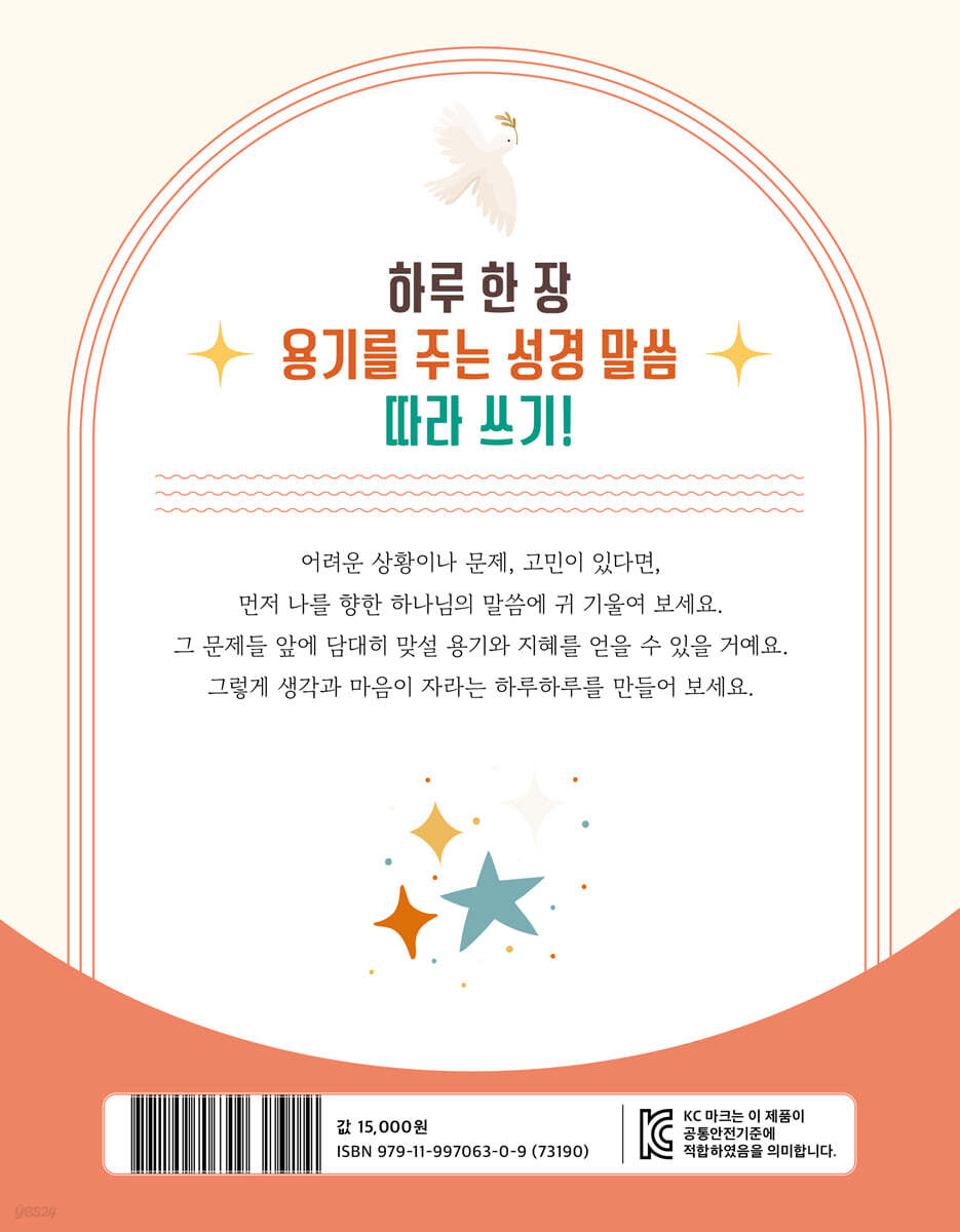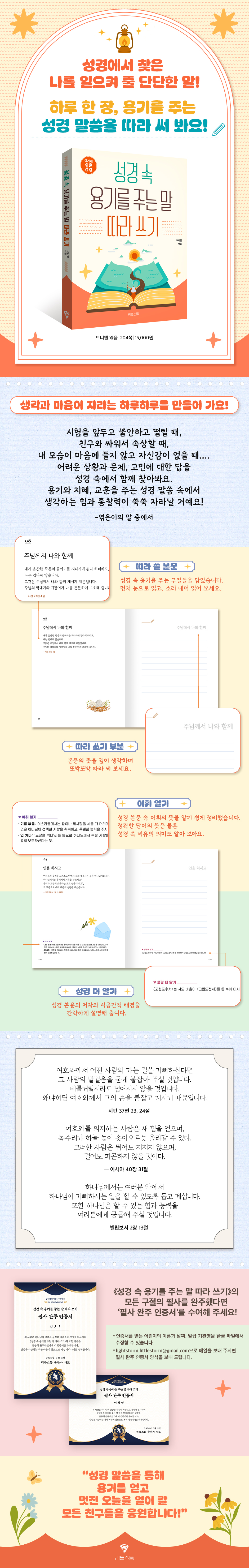 『성경 속 용기를 주는 말 따라 쓰기』는 어린이들에게 친숙한 『쉬운 성경』(아가페출판사)의 본문을 사용했습니다. 또한 성경 본문 속 어휘에 대한 설명을 통해 단어의 뜻을 풀어 주는 것은 물론 성경 속에서 사용된 비유적 표현의 의미도 담고 있어요. 성경 각 권의 시대적·공간적 배경에 대한 간략한 설명을 더해 어린이들이 성경 구절의 의미와 맥락을 이해하고 따라 쓰기 할 수 있도록 했습니다. 『성경 속 용기를 주는 말 따라 쓰기』를 통해 오랜 시간 많은 사람들에게 지혜와 용기, 교훈을 준 성경 말씀을 깊이 생각하며 이해하고 마음에 새기는 시간을 가져 보세요. 따라 쓰기로 어휘력, 이해력, 표현력 쑥쑥! 좋은 습관 기르기까지! ‘따라 쓰기’에는 어떤 효과가 있을까요? ◇ 어휘력과 표현력이 좋아져요! ◇ 글을 이해하는 능력과 글쓰기 실력을 기를 수 있어요! ◇ 집중력이 높아지고 뇌 발달에도 긍정적인 영향을 줘요! ◇ 마음이 차분해지고 안정되는 데 도움을 줘요! 성경 속에서 찾은 용기를 주는 말 따라 쓰기를 통해 따라 쓰기의 유익함을 경험해 보세요. 총 96구절의 용기를 주는 성경 말씀을 따라 쓰다 보면 어느새 더 넓고 깊게 성장하고 있는 여러분을 발견하게 될 거예요. 날마다 자신감과 용기를 충전하고 긍정적이고 담대한 마음으로 멋진 오늘을 열어 갈 모든 어린이 친구들을 응원합니다. |