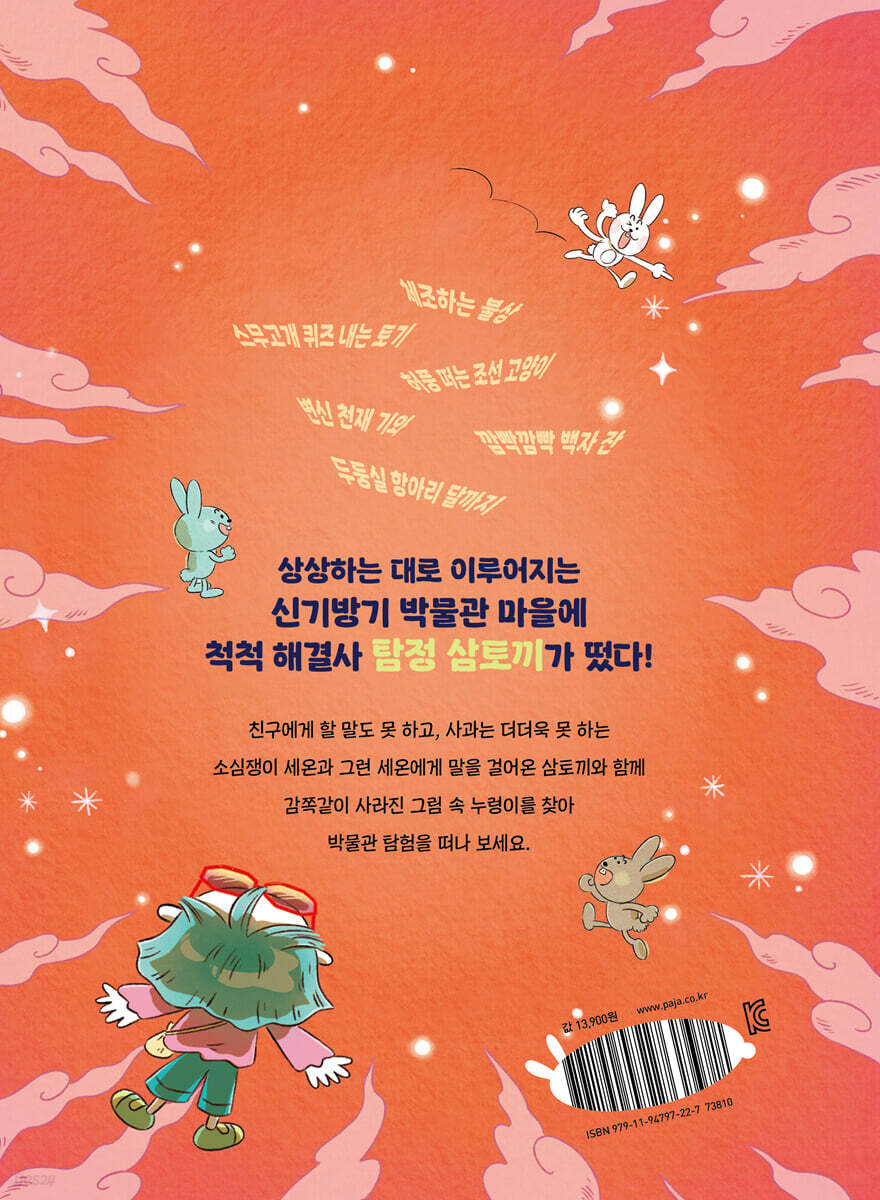 겁이 나도 용기 내어 도전하는 것 지하철 선로에 쓰러진 사람을 구한 시민, 주저 없이 불구덩이에 뛰어드는 소방관, 흉악범을 잡기 위해 고군분투하는 경찰, 재난 현장에 누구보다 먼저 달려가는 의사와 간호사까지 우리 주변에는 용감한 영웅들이 참 많아요. 영웅이라고 하면 세상에 무서울 것 하나 없는 대단한 사람처럼 보여요. 그러나 이들도 무서운 속도로 달려올 기차가 두렵고, 뜨거운 화염이 무섭고, 어디로 튈지 모르는 범인을 피하고 싶고, 위험한 곳이라면 겁부터 나기 마련이에요. 그래도 그들은 무섭고, 두렵고, 피하고 싶고, 겁나도 늘 ‘용기’를 내어 도전합니다. 용감하다는 것은 타고난 성격이 아니라, 두려움 앞에서 용기를 내어 한 발 앞으로 나아가는 것을 말해요. 특히 경험이 부족하고 새로운 일의 연속인 어린이에게는 수많은 용기가 필요해요. 새로운 친구에게 먼저 다가가 인사할 때, 엄마에게 잘못한 일을 솔직히 털어놓을 때, 동생 장난감을 망가뜨려서 사과해야 할 때, 엘리베이터를 혼자 탈 때, 처음 수영장에 갔을 때처럼 말이죠. 처음 시도하는 일 앞에서, 혹은 외면하고 싶은 일 앞에서 주춤주춤 주저하는 건 부끄러운 일이 아니에요. 그러나 주저함의 경계를 넘어서기 위한 연습이 필요하답니다. 『박물관 탐정 삼토끼:그림 속 누렁이 실종 사건』은 태곳적 유물이 한가득한 박물관을 배경으로 생김새도 성격도 제각각인 박물관 탐정 세 토끼와 소심하기 이를 데 없는 아홉 살 소녀 세온이 유물 그림 속에서 사라진 누렁이를 찾아 나서면서 겪는 이상하고도 흥미진진한 이야기입니다. 그림 속 사물이 살아 움직이는 증강현실 기능이 탑재된 꼬북안경, 세온의 눈에만 보이는 탐정 토끼들, 탐정 삼토끼를 따라 사건을 해결하며 만난 체조하는 83호 불상 아저씨, 허풍 떠는 조선 고양이, 스무고개 퀴즈 내는 뾰족턱 토기 할아버지, 깜빡깜빡하는 백자 잔 아차차 아줌마, 약과로 변신해 세온을 유인한 변신 천재 기와 얼굴 도깨비, 박물관 길을 밝혀 주는 항아리 달까지 작가의 기발한 상상력으로 탄생한 유물들의 향연은 유물에 관한 호기심은 물론 역사와 박물관에 관한 관심으로까지 이어집니다. 무엇보다 등장인물의 조합은 작품의 재미와 감동을 이끄는 데 큰 몫을 하지요. 성격 급한 탐정 크림은 추진력은 있지만 실수가 잦고, 느림보 탐정 초코는 급하고 까칠한 친구들을 조금씩 늦추고, 까칠한 탐정 민트는 크림과 초코가 한눈팔 때 가야 할 길을 콕 짚어 줍니다. 여기에 소심한 소녀 세온의 성장은 따뜻한 불빛을 내뿜는 등대와도 같아요. 크림의 발을 밟고도 선뜻 사과하지 못했지만, 크림은 세온이 어려운 일에 부딪힐 때마다 북돋우고 칭찬을 아끼지 않아요. 박물관 마을의 최고 말썽꾼 풍이를 만났을 때는 자신처럼 사과도 못 하고 친구와 잘 어울리지 못하는 풍이를 보며 스스로를 돌아보기도 합니다. 용기란 어둠 속에서 작은 희망을 보는 것과 같아요. 세온에게 희망은 크림의 격려와 칭찬이고, 어그러진 단짝 친구 채이와 화해하고 싶은 마음이기도 해요. 세온과 탐정 삼토끼와 함께 누렁이 실종 사건을 해결하면서 내 안의 용기와 마주하는 뜻깊은 박물관 탐험을 시작하세요. 알 듯 말 듯 좌충우돌 사라진 그림 속 누렁이를 찾아라! 박물관 체험 학습 날, 아침부터 세온은 걱정이 태산이에요. 단짝 채이와 수영장 가기로 한 약속을 못 지키게 되었거든요. 할머니 생신에 가야 한다고 말하면 되는데, 소심한 데다가 사과는 더더욱 못하는 세온은 우물쭈물 안절부절 시간만 끌다가 채이에게 절교하자는 말까지 듣고 말아요. 박물관에서는 유물이 살아 움직인다는 꼬북안경을 쓰고 체험하게 되었는데, 세온이 고른 안경을 채이가 홀랑 가져가 마지막 남은 안경을 써야만 했죠. 그런데 이상하게도 세온의 안경만 망가졌는지 안경알 색이 노을빛을 띠지 뭐예요. 그리고 정말 신기한 일이 일어났어요. 세온의 눈에만 보이는 박물관 탐정 토끼들이 나타나 그림 속에 있던 누렁이가 사라졌다며 함께 찾자고 하지 뭐예요. 꼭 세온이어야만 한대요. 세온은 어미 개의 슬픈 눈동자를 보며 꼭 찾아주겠다고 약속하죠. 크림과 짝이 되어 움직이던 세온은 83호 불상 아저씨가 체조하는 이유도 듣고, 78호 불상 아저씨에게 들은 단서로 허풍 고양이를 찾아가요. 허풍 고양이는 풀숲 너머 강가의 뾰족턱 할아버지를 찾아가 보라면서도 물이 싫다고 함께 가지 않아요. 두려움을 무릅쓰고 강가 움집에서 만난 뾰족턱 할아버지는 범인에 대해 직접 알아보라며 스무고개 퀴즈를 내죠. 티격태격하면서 퀴즈를 푼 크림과 세온은 훈장님을 범인이라 생각하고 서당으로 향해요. 가는 길에 그림에서 뛰쳐나온 쥐 떼에게 쫓기고, 배고픈 세온을 약과로 유인한 변신 천재 얼굴 도깨비에게는 약과 도둑으로 몰려 혼쭐이 나지요. 아차차 아줌마의 도움으로 간신히 빠져나와 다시 모인 삼토끼와 세온은 서당 앞에 도착했어요. 이제 누렁이를 찾는 건 시간문제예요. 훈장님을 무서워하는 삼토끼를 위해 세온이 용기를 내어 서당으로 먼저 들어갔어요. 그러고는 크게 외쳤죠. “혹시 누렁이를 아세요?” 범인이냐고 물어야 했지
