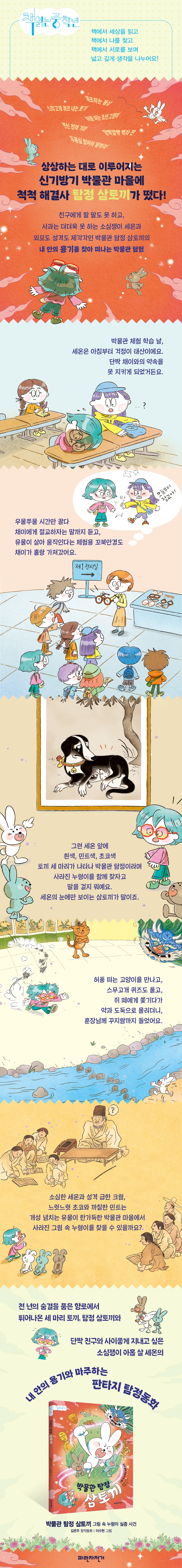 “맞아. 모두 우릴 볼 수 있는 건 아냐.” “그러면?” “아까도 말했지만 우린 박물관 탐정이야. 박물관 마을에 사건이 발생하면 우리가 제일 먼저 나서서 해결해. 하지만 모든 사건을 우리 힘으로 해결할 순 없어. 그래서 박물관에 온 사람들 중에서 우릴 도와줄 수 있는 사람을 발견하면 말을 걸어.” “그게 나야?” 세온은 눈을 동그랗게 떴다. 기대감에 가슴이 두근거렸다. 그러자 크림은 힘껏 고개를 끄덕였다. “그래, 바로 너!” --- p.34 “그게 절교까지 할 일인가? 사정을 말하고 미안하다고 하면 친구도 이해해 주지 않을까.” “그게 말이지, 내가 이 얘기를 채이한테 안 했거든. 미안하다는 말도 아직 안 하고.” 크림은 세온을 빤히 바라보더니 고개를 끄덕였다. “하지만 나중에 채이를 다시 만나면, 그땐 말할 수 있을 거야. 미안하다는 사과도 하고.” “난…… 그런 말 잘 못 해.” 세온의 목소리가 기어들었다. “에이, 못 하는 게 어디 있어. 그냥 하면 돼. 채이도 네가 먼저 말해 주고, 다시 예전처럼 지내길 기다릴걸?” 크림이 시원스레 대꾸했다. “정말 그럴까?” 세온의 얼굴에 옅은 미소가 피어올랐다. --- pp.55-56 “실은 서당 앞을 지날 때마다 안에서 누가 야단맞는 소리가 들린단 말이야. 어휴, 어찌나 매섭게 혼나는지 내가 혼나는 것처럼 오금이 저리다고.” 민트와 초코도 입을 삐쭉 내밀고 고개를 끄덕였다. “그래서 왠지 들어가기 겁나.” “그런 거였어?” 삼토끼가 하나같이 쭈뼛대는 모습이 어찌나 귀여운지 세온은 새어 나오는 웃음을 꾹 참았다. “그럼 말을 하지 그랬어. 내가 먼저 들어갈게. 나 이제 또박또박 말할 자신 있거든.” 세온은 씩씩하게 서당 앞마당을 지나 살그머니 방문을 열고 들어갔다. 민트, 초코, 크림도 얌전하게 세온을 따라 들어갔다. --- p.95 “친구들 괴롭히고 훈장님한테 거짓말하고, 그다음에 미안하다고 사과 안 했어?” “안 했지.” “왜?” “사과하면 지는 거잖아.” 그 말을 끝으로 풍이는 입을 꾹 닫았다. “자기 잘못을 솔직하게 인정하고 사과하는 건 용기 있는 일이야. 절대 지는 게 아니라고!” 크림이 힘주어 말했다. 세온도 고개를 끄덕였다. “실은 나도 사과하는 게 어려워. 사과하려고 하면 자꾸만 마음이 작아지고 작아져서 없어져 버릴 것만 같거든. 그래서 자꾸 미루게 돼. 미안하다는 말을 하는 건 왜 이리 어려울까?” 풀 죽어 있던 풍이가 고개를 들었다. “그렇지만 용기를 내서 사과하면 내가 좋아하는 친구랑 계속 친구로 지낼 수 있어. 혼자 노는 것도 재미있지만 친구랑 함께하면 두 배로 재미있잖아.” --- pp.103-105 |