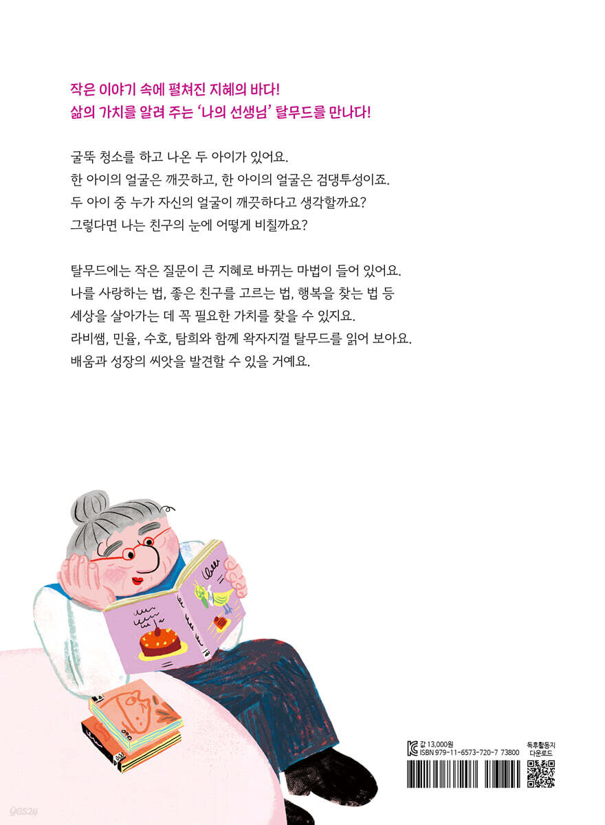 여러분은 스스로 바보라고 느낄 때, 공부하기 싫을 때, 친구와 다퉈서 속상할 때 어떻게 하나요? 다른 사람에게 털어놓기에는 부끄러워 혼자서 끙끙 앓고 있다면, 조용히 탈무드를 펼쳐 보세요. 탈무드의 이야기를 읽다 보면, 어느새 마음속에 쌓였던 상처와 괴로움, 걱정과 고민이 조금은 가벼워질 거예요. 민율, 수호, 탐희가 그랬던 것처럼요. -머리말 중에서 탈무드는 더 이상 어린 시절에만 읽던 옛날이야기가 아니에요. 오늘, 이 시대를 살아가는 민율, 탐희, 수호가 탈무드를 읽으며 인생의 소중한 가치를 배워 가요. 스스로 바보 같다고 생각하던 민율이는 도서관 선생님 라비쌤을 만나 점점 활기를 되찾아요. 공부 때문에 엄마에게 꾸중을 듣던 수호는 공부의 이유와 효율적인 방법을 스스로 깨달아요. 단짝과 다투고 화해하지 못해 괴로워하던 탐희는 탈무드를 통해 친구에게 다가가는 법을 배우지요. 라비쌤의 탈무드 이야기가 세 친구에게 어떤 마법을 부린 걸까요? 옛이야기로만 생각했던 탈무드가 오늘을 살아가는 아이들의 마음을 단단하게 만드는 과정이 흥미롭게 펼쳐집니다. * 같은 이야기, 다른 생각! 탈무드, 나만의 답을 찾다! 탈무드에는 누구나 쉽게 이해하고 재미있게 읽을 수 있는 이야기가 담겨 있어요. 하지만 이야기가 쉽다고 해서 그 의미까지 단순한 것은 아니지요. 탈무드 이야기는 누가 읽느냐, 어떻게 읽느냐에 따라 전해지는 가르침이 달라집니다. 같은 이야기를 읽어도 민율과 수호, 탐희는 저마다 다른 의견을 내놓아요. 때로는 서로의 생각을 두고 토론하기도 하고, 의견이 같을 때는 함께 즐거워하며, 누군가의 기발한 해석에는 아낌없는 칭찬을 보내기도 하지요. 민율과 수호, 탐희와 함께하는 독서의 즐거움을 느껴 보세요. 혼자 읽을 때보다 훨씬 풍성한 의미를 발견할 수 있답니다. * 짧은 만남, 큰 배움! 멘토의 힘을 발견하다! 좋은 나무가 좋은 나무를 만들 듯, 선생님과 이야기 나눈 모든 사람들은 선생님처럼 훌륭한 사람이 될 거예요. 저를 훌륭한 사람이라고 말할 수는 없지만, 스스로 바보 같다는 생각은 이제 하지 않아요. 탈무드에 ‘만나는 모든 사람에게 무언가를 배우는 사람이 가장 현명하다’는 말이 있대요. 저는 이제 더 이상 바보가 아니에요. 라비쌤을 만나 큰 지혜를 배웠거든요. 나의 선생님 라비쌤, 언제 어디서든 행복하세요! - 121쪽 본문 중에서 주인공 민율이는 우연히 만난 도서관 선생님 라비쌤을 만나요. 라비쌤은 언제나 웃으며 ‘괜찮다’ 말해 주고, 민율 자신도 몰랐던 마음속 특별함을 찾아주지요. 소심하고 자신감 없던 민율이는 라비쌤과 함께 탈무드를 읽고 이야기 나누며 점점 성장해 나갑니다. 쭈뼛대던 모습은 사라지고 자신의 생각을 말하며, 다른 생각도 받아들일 수 있게 되지요. 그러다 다른 친구에게 조언을 건넬 만큼 발전하지요. 우리 인생에서 멘토를 만날 기회는 흔치 않아요. 그만큼 멘토를 알아보는 지혜와 받아들이는 용기가 중요하지요. 민율이와 함께 멘토를 만나는 기쁨을 누려 보아요. * 우정에서 희망까지, 삶을 바꾸는 가치를 담다! 두 소년이 굴뚝 청소를 마치고 밖으로 나왔어요. 한 소년은 그을음이 묻어 얼굴이 새까매졌고, 다른 소년은 얼굴이 깨끗했지요. “조심한다고 했는데, 얼굴이 더러워졌네.” 얼굴이 깨끗한 아이는 친구의 새까만 얼굴을 보고 자기 얼굴도 더러울 것이라고 생각했어요. “그러게, 나처럼 조심히 일해야 얼굴이 깨끗하지.” 새까만 얼굴을 한 아이는 친구의 깨끗한 얼굴을 보고 자기 얼굴도 깨끗할 거라 생각하며 우쭐댔지요. 80쪽 본문 중에서 단짝과 다투고 심란해하는 탐희에게 라비쌤이 들려준 이야기예요. ‘굴뚝 청소를 하는 소년’이라는 이 이야기 속에서 탐희는 우정의 의미를 깨달을 수 있을까요? ‘우정-내가 가장 곁에 두고 싶은 친구는?’이라는 키워드 안에 어떤 이야기가 들어 있을까요? 자존감, 정직, 지혜, 아름다움, 배려, 우정, 노력, 행복, 희망. 이 책에 어린이들에게 꼭 필요한 삶의 가치 아홉 가지를 모았어요. 각각의 키워드를 설명하는 탈무드 이야기 속에 민율, 수호, 탐희의 사연을 더해 오늘을 살아가는 아이들의 이야기로 다시 태어난 탈무드! 작은 이야기 속에서 큰 가치를 발견하는 즐거움을 만나 보세요. |