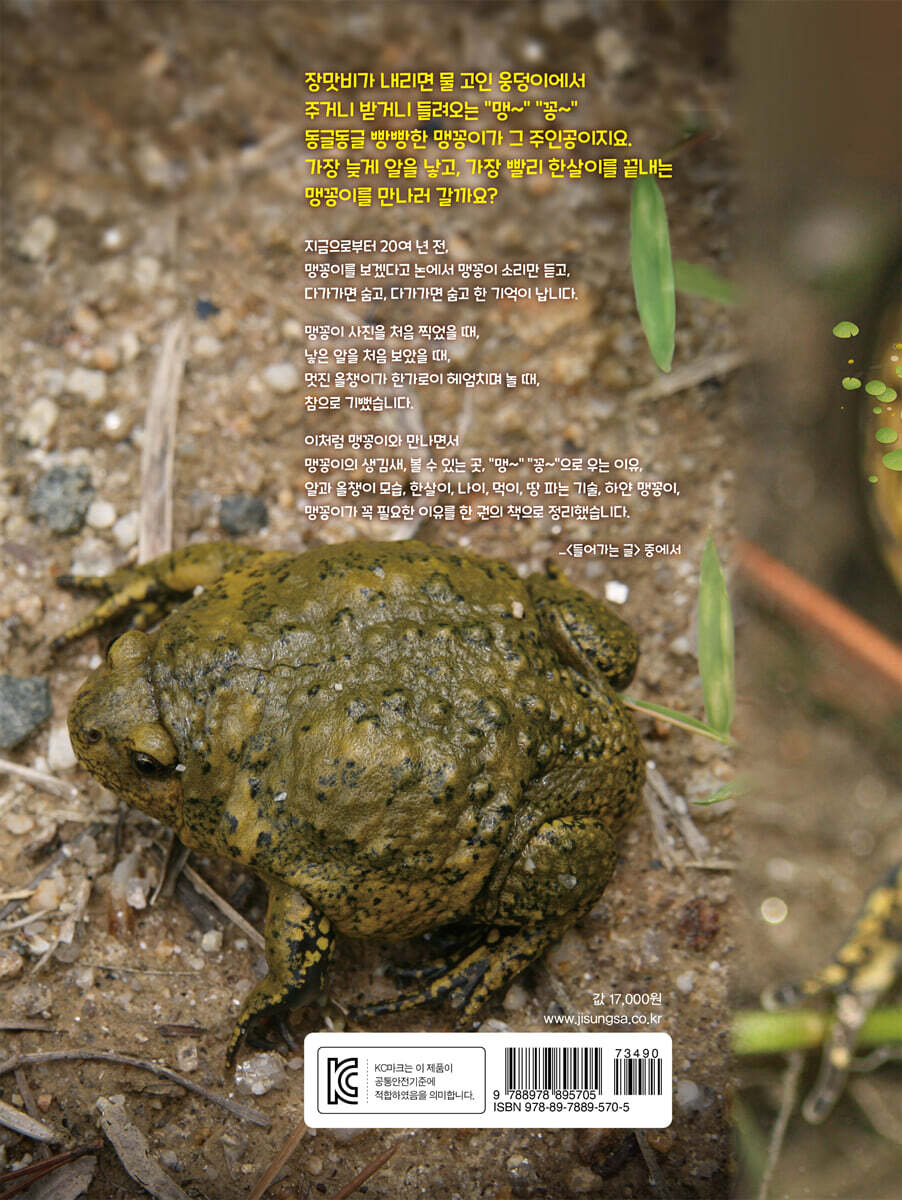 맹꽁이의 매력은 무엇일까요? 3월 초의 절기, 겨울잠을 자던 벌레와 개구리가 놀라서 깨어난다는 ‘경칩’은 겨우내 웅크렸던 만물이 기지개를 켜며 다시 생기를 찾는 봄을 알리는 신호이기도 합니다. 특히 개구리는 겨울잠에서 깨자마자 짝을 찾느라 부지런히 움직입니다. 4~5월이면 개구리 울음소리로 온 동네가 들썩이고, 밤잠을 설치는 사람도 제법 많다지요. 끊임없이 개굴개굴하는 개구리 울음소리가 잦아들 무렵, 6~7월까지 이어지는 장마철에는 독특한 개구리 울음소리가 들려옵니다. “맹~”, “꽁~”, 우는 소리에 빗대어 이름 붙인 맹꽁이가 그 주인공입니다. 사실 맹꽁이는 도시에서는 울음소리를 들을 수 없고, 만나기도 힘듭니다. 4월 겨울잠에서 깨어났어도 낮에는 땅을 파고 땅속에 숨어 있다가 밤이 되어 땅 위로 나와 먹이 활동을 하기 때문이지요. 여느 수컷 개구리들이 짝을 찾느라 우렁차게 우는 와중에도 꿈쩍하지 않다가 6~7월 장마철, 비가 많이 내려 물이 고이면 웅덩이나 습지에 모여들어 짝을 찾느라 울음주머니를 크게 부풀며 “맹~” “꽁~” 하며 울기 시작합니다. 맹꽁이의 매력은 무엇일까요? 동글동글 빵빵한 생김새가 마치 잘 부풀어 오른 찐빵 같고, 머리와 다리가 짧아 귀엽기 짝이 없습니다. 게다가 수컷 한 마리가 “맹꽁” 하고 우는 것이 아니라, 한 마리가 “맹~” 하고 울면 옆에 다른 수컷이 경쟁하듯 “꽁~” 하면서 주거니 받거니 하는 울음소리도 매력입니다. 이 울음소리는 본문에 실린 QR 코드와 연결하여 실제로 들을 수 있답니다! 곁들여 환경부에서 지정한 멸종위기 야생생물 1급인 수원청개구리와 같은 집안의 청개구리의 울음소리도 비교할 수 있게 했지요. 개구리 무리 중에서 가장 늦게 알을 낳지만 가장 빨리 자연으로 돌아가는 맹꽁이! 2017년 당시 고등학교 생물 교사로 재직하면서 전국의 산과 논밭에서 만난 양서류 18종, 파충류 20종을 관찰한 『개구리 도롱뇽 그리고 뱀 일기』를 펴낸 문광연 선생이 아주 오랜만에 ‘모두가 같이 읽는 과학 이야기’로 『와! 맹꽁이다』를 펴냈습니다. 20여 년 전 작고 귀여운 녀석의 매력에 빠져 숨바꼭질하듯 맹꽁이를 만난 그가 개구리 무리 가운데 유난히 맹꽁이에게 관심을 갖는 이유는 우리 자연환경의 건강 상태를 가늠하는 환경 지표종이기 때문입니다. 생태계의 중간고리로, 환경 지표종으로서 중요한 역할을 하는 맹꽁이! 그 울음소리가 영원히 이어지기를 바라는 마음이 책 곳곳에 담겨 있습니다. * 맹꽁이가 노래하는 곳에서 다 같이 함께 살아가면 좋겠어요! 20여 년 전, 저자인 문광연 선생은 맹꽁이를 보겠다고 논에서 맹꽁이 소리만 듣고 그에 다가가면 숨고, 다가가면 숨고, 맹꽁이와 숨바꼭질을 벌이다가 마침내 맹꽁이 사진을 처음 찍었을 때, 낳은 알을 처음 보았을 때, 멋진 올챙이가 한가로이 헤엄치며 놀 때, 기뻐했던 기억이 생생하다고 합니다. 이처럼 맹꽁이와 만나면서 우리나라에서 살고 있는 참개구리, 청개구리, 무당개구리, 옴개구리, 금개구리, 수원청개구리, 한국산개구리, 큰산개구리, 두꺼비, 물두꺼비, 황소개구리와 맹꽁이가 어떻게 다른지 맹꽁이의 생김새, 볼 수 있는 곳, “맹~” “꽁~”으로 우는 이유, 알과 올챙이 모습, 한살이, 나이, 먹이, 땅 파는 기술, 하얀 맹꽁이, 맹꽁이가 꼭 필요한 이유를 한 권의 책으로 정리했습니다. 이 책에서 가장 눈여겨볼 부분은 바로 ‘생태통로’입니다. 차에 치여 죽는 찻길 죽음(로드킬)을 막기 위해 고라니나 너구리 따위의 생태통로는 제법 많이 눈에 띄지만, 개구리나 도롱뇽, 뱀 같은 양서류와 파충류를 위한 생태통로는 우리 주변에 그리 눈에 띄지 않습니다. 포유류의 움직임에 비해 한참 더딘 개구리와 뱀 같은 양서류와 파충류는 특히 사는 곳이나 알을 낳는 곳이 따로 있어 이동하다가 로드킬이 자주 일어나므로 생태통로가 꼭 필요하답니다. 선생님은 어느 날, 맹꽁이 올챙이와 아성체가 사는 산밑 배수로의 시멘트로 만든 맨홀이 직각으로 되어 있음을 발견했습니다. 아성체가 되면 물 밖으로 나와야 하는데 못 나오고 죽는 것을 방지하기 위해 맹꽁이들이 잘 나올 수 있게 맨홀과 배수로에 맹꽁이 사다리를 만들어 주었고, 다음 해부터는 한 마리도 죽지 않고 주변으로 이동한 이야기와 함께 그들만을 위한 다양한 생태통로의 사례를 보여 줍니다. 지금 지역 개발에 따라 농지와 습지가 점점 사라지고, 물이 오염됨에 따라 맹꽁이를 비롯한 개구리 무리의 서식지를 비롯해 그들의 생존이 위협받고 있답니다. 특히 환경부에서 멸종위기 야생생물 2급으로 지정할 만큼 맹꽁이는 땅이 오염되어도, 물이 오염되어도, 공기가 오염되어도 살지 못하는 그 지역의 환경을 나타내는 지표종입니다. 맹꽁이가 산다는 것은 그곳이 그만큼 깨끗하다는 뜻이지요. 사람들은 공원과 하천가에서 운동을 하고, 운동장에서는 아이들과 맹꽁이 소리가 들리면 좋겠고, 봄과 여름이 오면 나무와 풀에 꽃이 피고, 새와 나비가 날아다니며, 맹꽁이가 노래하는 곳에서 다 같이 잘 살아가면 좋겠다는 저자의 바람이 꼭 이루어질 수 있게 하는 것이 『와! 맹꽁이다』를 펴낸 이유이기
