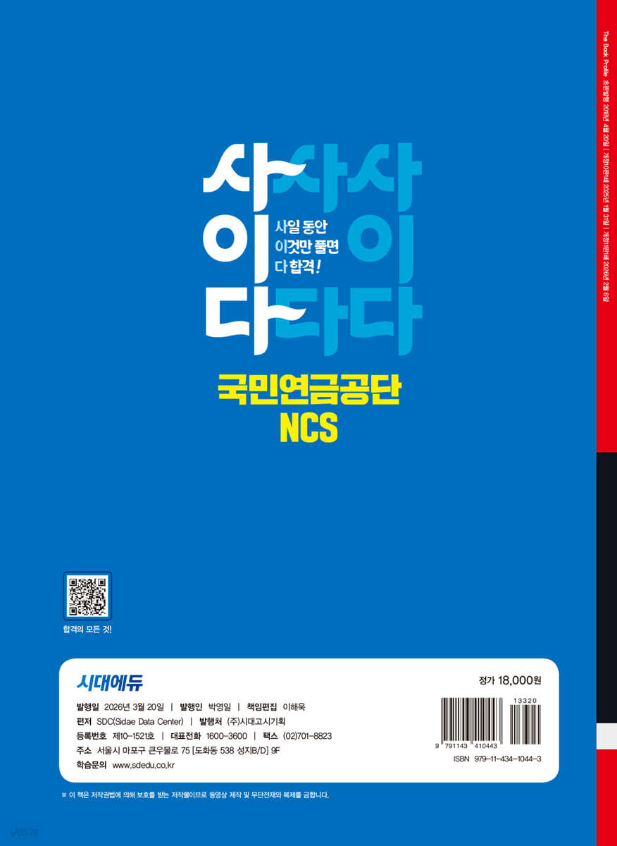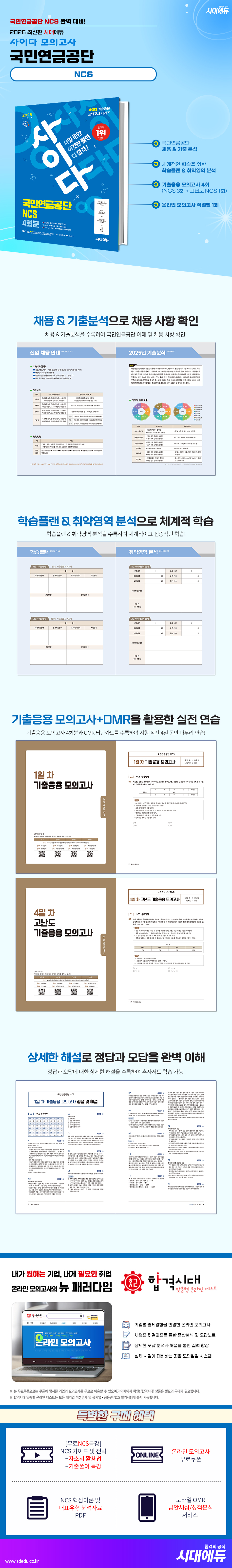 시대에듀에서는 국민연금공단 채용에 대비하기 위해 『2026 최신판 시대에듀 사이다 모의고사 국민연금공단 NCS』를 출간하였다. 철저한 분석을 통해 실제 유형과 유사한 기출응용 모의고사를 4회분 수록하여 시험 직전 4일 동안 자신의 실력을 점검할 수 있도록 하였다. 또한 상세한 해설로 혼자서도 학습이 가능하도록 하였으며, 온라인 모의고사를 무료로 응시할 수 있는 쿠폰을 제공하여 국민연금공단 문제 유형에 대한 연습과 함께 자신의 실력을 확인할 수 있도록 하였다. |