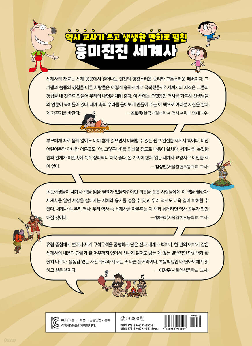 유럽 중심에서 벗어나 세계 구석구석을 공평하게 담은 진짜 세계사 책이다. 한 편의 이야기 같은 세계사의 내용과 만화가 잘 어우러져 있어서 신나게 읽어도 남는 게 없는 일반적인 만화책과 확실히 다르다. 생동감 있는 사진 자료와 지도는 또 다른 볼거리이다. 초등학생인 내 딸아이에게 읽히고 싶은 책이다. - 이강무 (서울인창중학교 교사)