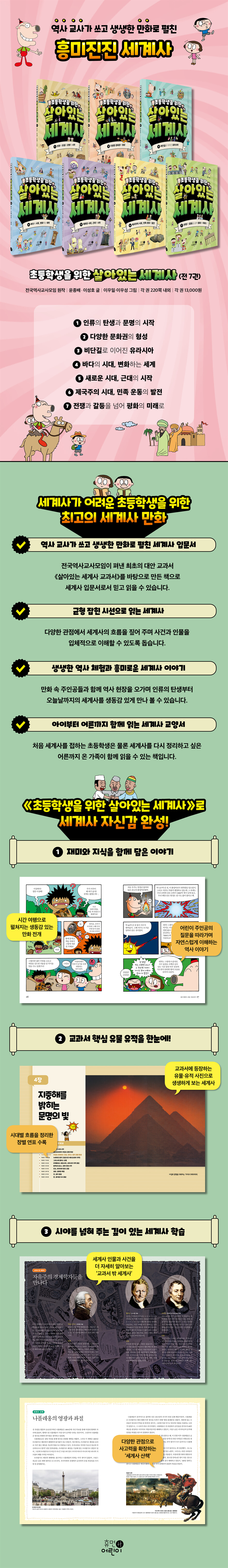 전국의 현직 역사 교사 2000여 명의 교육 경험과 연구 성과를 바탕으로 구성한 『초등학생을 위한 살아있는 세계사』는 세계사를 생생한 만화로 풀어, 전 세계의 역사를 한눈에 읽을 수 있도록 한 책입니다. 낯선 지명과 인명이 무수히 등장하는 세계사를 밝고 유쾌한 만화로 구성해 쉽고 친근하게 풀어 줍니다. 만화 속 주인공들이 역사 현장에 직접 들어가는 구성을 따라가다 보면, 책을 읽는 아이들 역시 역사를 직접 체험하듯 공감하고 기뻐하거나 슬퍼하며 세계사를 더욱 가깝게 느끼게 됩니다. 본문에서는 인물과 사건을 중심으로 세계사의 큰 흐름을 짚어 주고, 책 곳곳에 세계사 연표와 알짜 정보들을 담았습니다. 더 깊이 있는 정보와 생각해 볼 문제는 정보글에 정리했으며 그림과 함께 펼쳐지는 지도와 도표, 다채로운 사진을 통해 세계사를 더욱 생생하게 만날 수 있습니다. 재미만 추구하는 역사 만화책이 아쉽게 느껴진다면 역사 교사가 직접 쓰고 현장 교사들이 추천하는 『초등학생을 위한 살아있는 세계사』로 첫 세계사 공부를 시작해 보세요. 균형 잡힌 시선으로 읽는 세계사 『초등학생을 위한 살아있는 세계사』는 전국역사교사모임이 펴내고, 최초의 세계사 대안교과서로 큰 사랑을 받아 온 『살아있는 세계사 교과서』를 초등학생의 눈높이에 맞춰 알기 쉽게 풀어 쓴 세계사 교양서입니다. 2000여 명의 역사 교사들이 서구 중심의 관점에서 벗어나 우리의 시선으로 세계사를 서술한 원작을 바탕으로 아이들이 올바른 역사관을 가지고 과거와 현재, 미래를 바라볼 수 있도록 돕습니다. 또한 『초등학생을 위한 살아있는 한국사』, 『초등학생을 위한 민주주의 근현대사』와 함께 읽으면 세계사 속 우리 역사, 우리 역사 속 세계사를 자연스럽게 아우를 수 있습니다. 흥미는 기본, 학습은 필수, 여기에 잔잔한 감동까지 더해 사람들이 살아온 흔적을 밝고 힘차게 그려 낸 책입니다. 생생한 역사 체험과 흥미로운 세계사 이야기 만화 속 주인공 아이들은 시공간을 넘나드는 능력을 지닌 대포코와 함께 역사 현장으로 시간 여행을 떠납니다. 아이들이 직접 역사 속으로 들어가 체험하는 구성은 처음 세계사를 접하는 아이들에게 생생한 현장감을 전해 줍니다. 여기에 유물과 유적 사진을 함께 실어, 역사 현장을 간접적으로 체험할 수 있도록 했습니다. 책 속 주인공들과 함께 세계사의 흐름을 따라간 뒤에는 ‘교과서 밖 세계사’, ‘세계사 산책’ 정보글을 통해 꼭 알아야 할 사건과 인물, 시사점은 물론 세계사와 함께 읽어 볼 책과 영화까지 소개합니다. 1권에서는 인류의 탄생과 문명의 시작을, 2권에서는 다양한 문화권이 형성된 과정을 다룹니다. 3권에서는 비단길로 이어진 유라시아 세계를, 4권에서는 바다의 시대가 열리며 변화한 세계의 모습을 담았습니다. 5권에서는 근대의 시작을, 6권에서는 제국주의 시대의 민족 운동을 살펴보고, 7권에서는 전쟁과 갈등을 넘어 평화의 미래로 나아가는 세계를 그립니다. 아프리카가 세계에서 가장 오래된 대륙이라는 이야기, 과거 남아메리카 사람들의 생김새가 우리와 비슷했다는 이야기, 200년 전에는 중국과 인도가 유럽 여러 나라보다 더 부유했다는 이야기, 로마 제국의 화려함 뒤에 숨은 노예들의 노동 이야기 등 흥미로운 역사 속 숨은 이야기들도 풍부하게 담았습니다. 이러한 이야기들은 아이들이 사람과 세상을 더 깊이 생각하게 합니다. 아이부터 어른까지 함께 읽는 세계사 교양서 대포코와 함께 전 세계를 누비며 시공간을 넘나들다 보면 아이들은 어느새 세상을 더 넓게 바라보게 됩니다. 역사의 현장에 있는 듯한 생생함 속에서 책장을 넘기다 보면 마음과 생각도 함께 자라납니다. 세계사를 즐겁게 배우면서 그 의미까지 느끼는 것, 그것이 바로 저자들의 바람이자 이 책을 쓴 이유입니다. 『초등학생을 위한 살아있는 세계사』는 복잡한 세계사 사건을 자연스러운 흐름으로 정리해 초등학생은 물론 세계사를 처음 공부하는 어른도 쉽고 흥미롭게 읽을 수 있는 책입니다. 온 가족이 함께 읽는 만화책이자 두고두고 곁에 두고 읽을 세계사 교양서로 손색이 없습니다. |