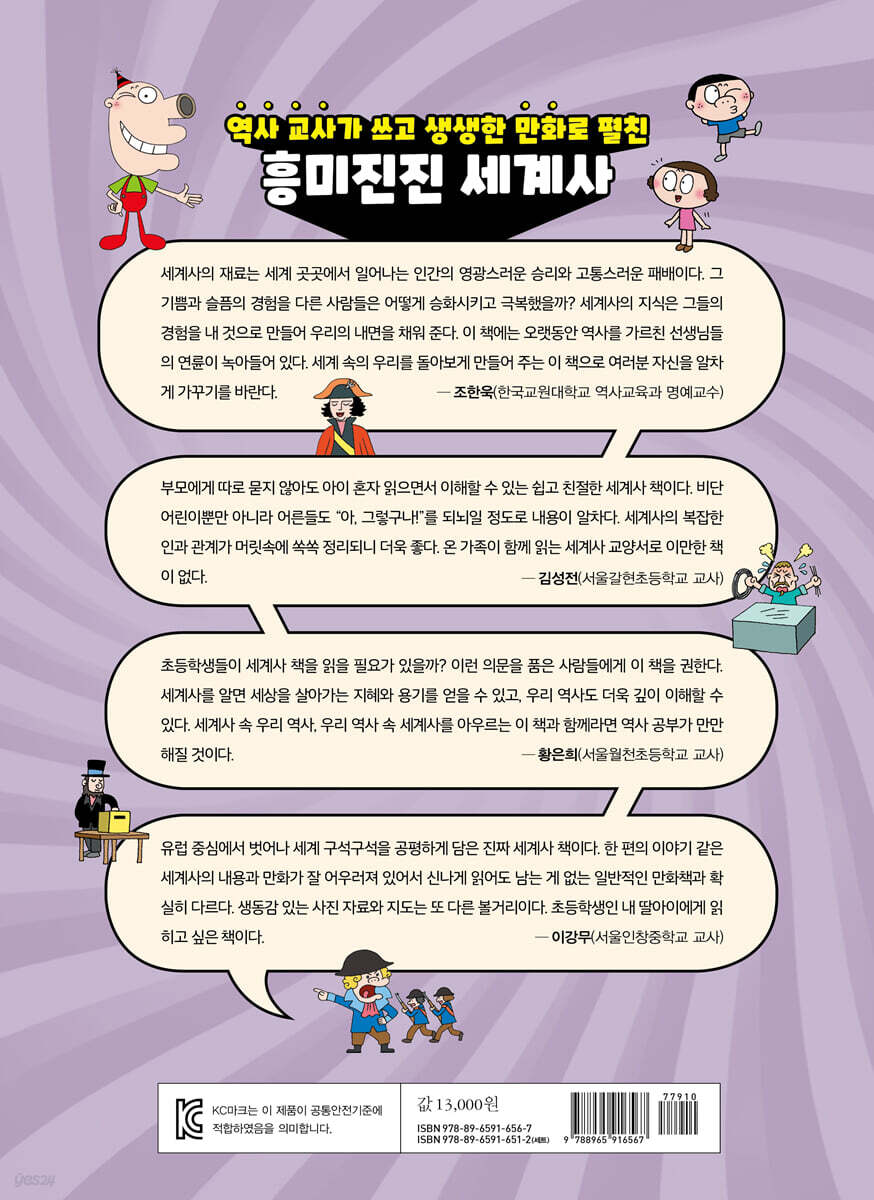 부모에게 따로 묻지 않아도 아이 혼자 읽으면서 이해할 수 있는 쉽고 친절한 세계사 책이다. 비단 어린이뿐만 아니라 어른들도 “아, 그렇구나!”를 되뇌일 정도로 내용이 알차다. 세계사의 복잡한 인과 관계가 머릿속에 쏙쏙 정리되니 더욱 좋다. 온 가족이 함께 읽는 세계사 교양서로 이만한 책이 없다. - 김성전 (서울갈현초등학교 교사)