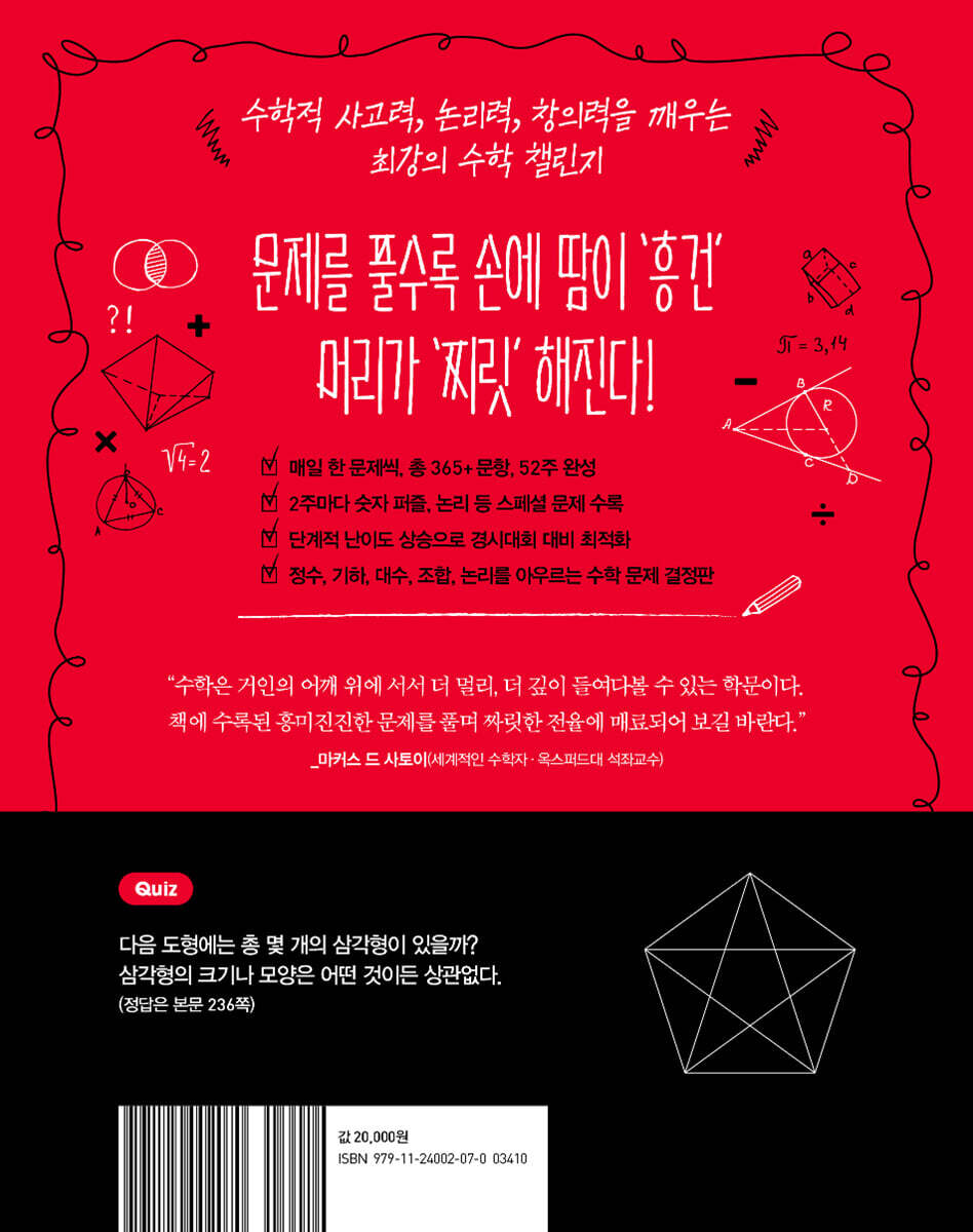 경험자로서 말하자면 수학 퍼즐을 풀 때 느끼는 쾌감은 상당히 중독적이다. 이 책을 통해 쉽게 풀리지 않는 문제에 기꺼이 도전하며 짜릿한 즐거움을 흠뻑 맛보기를 바란다. 그런 문제야말로 결국 해결했을 때 가장 큰 성취감과 전율을 느끼게 해 주니까. - 마커스 드 사토이 (세계적인 수학자 · 옥스퍼드대 석좌교수)