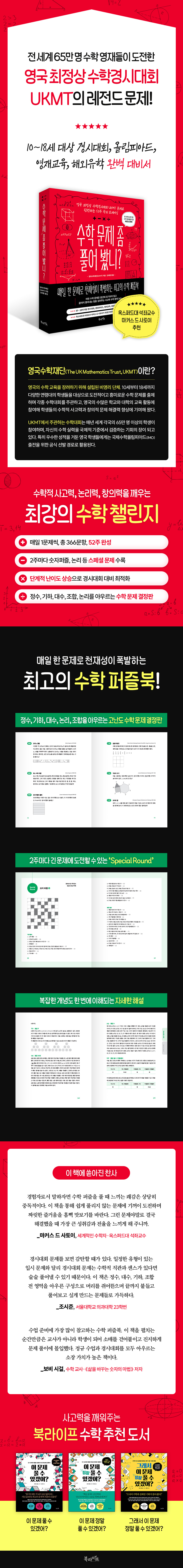 “아이들도 이 문제를 풀 수 있다고?”라는 말이 절로 나올 만큼 인상적이다! 지금까지 절반 정도 풀었는데 완전히 포기한 문제는 한 문제뿐이다. 아마도 이 책이 내 수학 실력을 한 단계 성장시키거나 완전히 무너뜨릴지도 모르겠다. 그만큼 도전적이고 매력적인 문제들로 가득하다. - 아마존 독자 Da****s