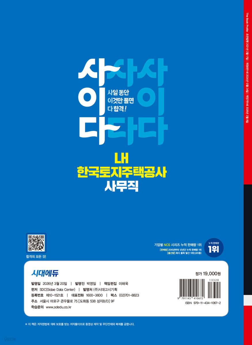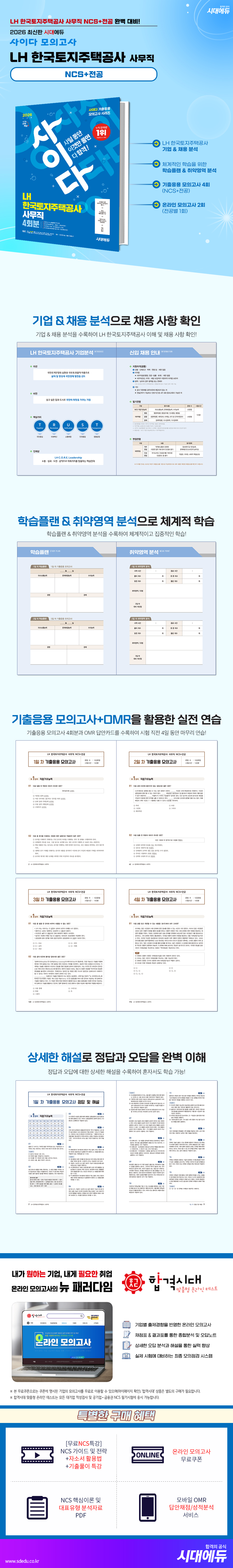 LH 한국토지주택공사 사무직 필기시험 합격을 위해 시대에듀에서는 2026년 채용을 대비하여 LH 한국토지주택공사 사무직 최신 필기전형 맞춤형 문제로 구성한 『2026 최신판 시대에듀 사이다 모의고사 LH 한국토지주택공사 사무직 NCS+전공』을 출간하였다. 상세한 해설로 혼자서도 학습이 가능하도록 하였으며, 온라인 모의고사를 무료로 응시할 수 있는 쿠폰을 제공하여 LH 한국토지주택공사 사무직 문제 유형에 대한 연습과 함께 자신의 실력을 최종 점검할 수 있도록 하였다. |