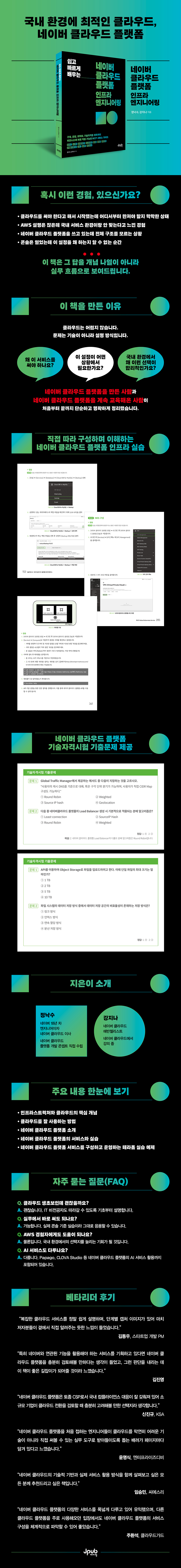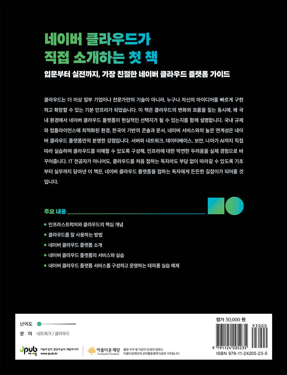 국내 클라우드 환경에서 바로 써먹을 수 있는 인프라 교과서가 나왔다. 네이버 클라우드에서 직접 집필한 첫 공식 가이드인 이 책은 클라우드를 처음 접하는 사람부터 실무에서 인프라를 운영해야 하는 엔지니어까지 모두를 대상으로 한다. 개념 설명에만 머무르지 않고, 왜 국내 환경에서 네이버 클라우드 플랫폼이 현실적인 선택이 되는지를 분명하게 짚는다. 규제와 컴플라이언스, 한국어 콘솔과 문서, 네이버 서비스와의 연계성처럼 실제 현장에서 체감하는 요소를 중심으로 설명하는 점이 강점이다. 서버와 VPC, 네트워크, 스토리지, 데이터베이스, 보안 등 인프라의 기본기를 차근차근 쌓아가면서 오토 스케일링, 로드 밸런싱, 모니터링 같은 운영 단계의 핵심도 자연스럽게 연결한다. 모든 내용이 콘솔 화면 스크린숏을 따라 직접 실습하는 흐름으로 구성되어 있어, 읽는 데서 끝나지 않고 손에 익히게 된다. 인프라에 막연한 두려움을 느끼던 독자라면, 이 책을 통해 클라우드가 어렵고 멀게 느껴지는 대상이 아니라 직접 다룰 수 있는 도구로 바뀌는 경험을 하게 될 것이다. 후반부에서는 데이터 서비스, 컨테이너, 미디어 서비스, AI API와 CLOVA Studio까지 다루며 네이버 클라우드 플랫폼의 활용 범위를 넓힌다. 단순한 인프라 구축서가 아니라, 실제 비즈니스와 어떻게 연결되는지를 보여주는 구성이다. 테라폼을 활용한 인프라 구성 예제까지 포함해 자동화와 재현성이라는 현대적인 클라우드 운영의 핵심도 놓치지 않는다. IT 전공자가 아니어도 부담 없이 따라갈 수 있을 만큼 친절하면서도, 실무 엔지니어에게는 기준서로 삼을 만한 깊이를 갖춘 책이다. 네이버 클라우드 플랫폼을 처음 만나는 사람에게는 가장 안전한 출발점이 되고, 이미 사용 중인 사람에게는 전체 그림을 정리해주는 든든한 참고서가 될 것이다. 주요 내용 - 인프라스트럭처와 클라우드의 핵심 개념 - 클라우드를 잘 사용하는 방법 - 네이버 클라우드 플랫폼 소개 - 네이버 클라우드 플랫폼의 서비스와 실습 - 네이버 클라우드 플랫폼 서비스를 구성하고 운영하는 테라폼 실습 예제 |
