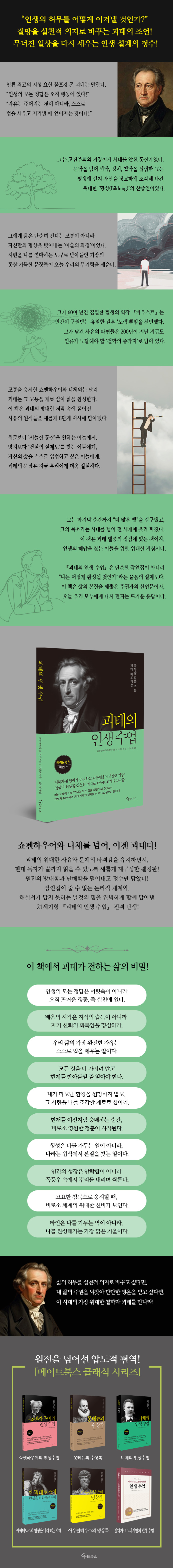 니체보다 단단하고 쇼펜하우어보다 현실적인 괴테 철학!괴테는 혼란스러운 시대를 살았지만, 그의 언어는 여전히 불안한 오늘을 사는 우리에게 살아 있는 지혜로 다가온다. “인생의 허무를 어떻게 극복할 것인가” “내 삶의 주권을 어떻게 되찾을 것인가”라는 근본적인 질문에 괴테는 정직하고 서늘하게 답한다. 그의 철학은 머리로 이해하는 지식이 아니라 손발을 움직이게 만드는 실천적 텍스트다. 특히 이번 기획은 현대인의 정신적 허기를 채워주는 세 명의 거장을 명확히 대비시킨다. 쇼펜하우어가 고통을 ‘응시’하게 하고, 니체가 고통에 ‘저항’하게 한다면, 괴테는 고통을 재료 삼아 삶이라는 집을 어떻게 ‘완성’할 것인가를 가르친다. 괴테는 니체의 파괴보다 단단하고 쇼펜하우어의 냉소보다 현실적이다. 그는 삶의 비극을 인정하면서도 스스로 자기 삶의 입법자가 되어 절제 속의 자유를 누리는 법을 선언한다.궁극적으로 괴테의 사유는 개인의 자기 완성을 넘어 타인과의 고결한 연대와 ‘현재’라는 여신에 대한 숭배로 확장된다. 부조리를 인식한 인간이 오늘의 의무를 묵묵히 다할 때, 비로소 인간은 허무를 뚫고 주권자로 우뚝 설 수 있다는 메시지다. 『괴테의 인생 수업』은 삶의 피할 수 없는 한계 속에서 스스로를 조각해 나가는 거장의 자세를 주문하며, 나이 들어감이 쇠퇴가 아닌 ‘완성’임을 증명한다. “더 많은 빛을!”을 갈구하며 마지막 순간까지 활동을 멈추지 않았던 괴테의 태도는 여전히 우리가 걸어야 할 가장 고귀한 길을 가리킨다. 이 책은 철학의 ‘생명력’을 삶의 ‘실행력’으로 바꾸고 싶어 하는 독자들에게 가장 정직한 길잡이가 될 것이며, 흐트러진 내면 질서를 바로잡고 진정한 자유의 길로 나아가려는 이들에게 건네는 가장 뜨거운 응답이 될 것이다.〈독자들의 추천평〉아이들을 다 키워내고 마주한 삶의 허무함 앞에서 괴테가 건네는 진짜 목소리를 만난 것은 제 인생의 축복입니다. 수식어 없이 단단한 문장들을 따라가다 보니, 누군가의 엄마나 아내가 아닌 주권자로서의 나 자신을 다시 마주하게 되었어요. 괴테의 지혜는 제 마음의 무너진 담장을 다시 세우는 단단한 벽돌이 되어주었습니다. 50대 주부 남들과 비교하며 뒤처지는 것 같아 매일이 불안했는데, ‘방황은 생성의 과정’이라는 괴테의 말이 저를 다시 일으켜 세웠습니다. 흔한 위로보다 “스스로에게 명령하라”는 서늘한 문장들을 통해 오히려 제 삶을 주체적으로 살아갈 힘을 얻습니다. 30대 여성 직장인 쇼펜하우어와 니체의 책들을 거쳐 마침내 도달한 이 책에서 무너진 일상을 다시 세울 정교한 설계도를 발견했습니다. 괴테의 날것 그대로인 문장들이 가슴에 박힐 때마다 현재를 살아갈 힘이 채워지는 것이 느껴집니다. 40대 워킹맘이 책은 은퇴를 앞두고 공허해진 제 삶에 새로운 엔진을 달아주었습니다. “인생의 저녁 해도 여전히 태양”이라는 괴테의 격려를 마주하며, 나이 들어감이 쇠퇴가 아님을 깨달았습니다. 그간의 시련이 나를 완성하기 위한 재료였음을 알게 되었습니다. 50대 남성 직장인