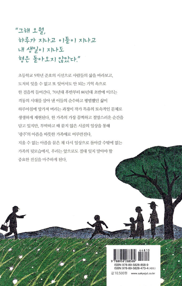 2013년 ‘5·18문학상’ 최종심에 오른 작품이며, 저자가 작가로서의 첫 걸음을 내딛는 작품이기도 하다. 투박하지만 때 묻지 않은 그때 그 시절, ‘광주’의 아픔을 따뜻한 가족애로 어루만지다. 1979년 전남의 어느 시골 마을, 여느 농촌의 다름없이 평화롭고 조용한 이 마을에 준호네 가족이 살고 있다. 돼지를 파는 까닭에 ‘돼지 장수’라 불리는 아버지와 자식 입에 밥술 들어갈 때가 가장 행복한 어머니, 똑똑하기로는 동네 제일인 장남 준영, 공부와는 담 쌓았지만 심성 고운 둘째 준호, 야물고 당찬 막내딸 순화. 고되게 일해도 좀처럼 나아지지 않는 팍팍한 시골 살림살이도 이 다섯 가족에게는 그저 단란한 일상이고 행복이다. 아버지가 나가고 나면 엄마도 밭으로 나갔다. 엄마는 머리에 흰 수건을 쓰고 호미와 낫을 챙겨 넣은 소쿠리를 들었다. 우리는 그때까지 일이 있든 없든 마당이나 마루에서 기다렸다가 잘 다녀오시라는 인사를 한다. 그런 다음 순화는 상을 치우고 설거지를 하고, 준영이 형은 앉은뱅이책상에 앉아 공부를 한다. 그러나 설거지도 공부도 하지 않는 나는 다시 잠자리에 들어 부족한 잠을 채운다. 나는 그 시간이 참 행복하다. 잠도 꿀맛 같고, 밥이 소화되는 시간이라 방귀도 기분 좋게 뀔 수 있다. 물론 준영이 형에게 싫은 소리를 듣는 것은 감수해야 한다. “에잇, 드런 놈아! 방구 좀 엥가이 끼! 코가 썩는다, 썩어.” - 본문 8?9쪽 준호네 집의 유일한 걱정은 아버지의 폭음이다. 평소에는 말수도 적고 점잖은 분이 술에 취하면 고래고래 울분을 토하며 동내 시끄럽게 구는 것이다. 특히 모처럼 돼지를 판 날이면 아버지는 만취한 채 마을 사람들의 밤잠을 다 깨울 만큼 요란하게 귀가했고, 괜한 트집을 잡아 세간을 부수며 어머니를 괴롭히기 일쑤다. 맨 정신으로는 버티기 힘들 만큼 고되고 팍팍했을 과거 우리네 아버지들이 삶을 가늠해 볼 수 있는 대목이다. 거나하게 취해 신세 한탄을 하고 야속하고 험한 세상을 향해 원 없이 분풀이를 할 수 있는 유일한 방법이 술이 아니겠는가. 가장으로서의 한이 서린 주정과 이를 전전긍긍하며 말리는 어머니의 모습이 이웃집의 일처럼 훤하게 그려진다. 준호가 어머니와 함께 아버지 마중을 나갔다가 허탕을 치고 터벅터벅 돌아오던 날, ‘오늘도 아버지는 고주망태가 되어 들어오겠구나.’ 하는 세 남매의 예감이 어김없이 맞아떨어졌다. 패악을 부리는 아버지를 피해 이웃집으로 피신했다 돌아온 준호는 형 준영의 붉게 부어오른 뺨을 본다. 형과 아버지 사이에 과연 무슨 일이 있었던 걸까. 준호는 도무지 알 수 없었지만, 꼬치꼬치 캐물을 수도 없었다. 나중에 알고 보니 순한 준영 형이 술 취한 아버지에 대들었고 횡포에 맞서다 얼굴에 불그죽죽한 자국이 남은 것이었다. 똑똑한 형이 그런 바보 같은 짓을 다 하다니 별일이다 싶었는데, 더욱 놀라운 일이 일어났다. 모범생이자 우등생인 준영이 학교에 무단결석을 한 것이다. 아버지의 불같은 호통, 무서운 침묵이 이어졌다. 이튿날 아침에도 집 안 분위기는 바뀌지 않았다. 다섯 식구 모두 밥상에 둘러앉았지만 아무도 말이 없었다. 두렵도록 긴 침묵이었다. 그러다 맨 먼저 숟가락을 들었던 아버지가 다시 숟가락을 내려놓으며 침묵을 깼다. “밥 묵음서 들어라. 아부진 인제 술 담배 끊었응께, 그러케들 알고 느그들은 공부에 힘써라.” “예.” 나는 얼른 대답했다. 그러고 보니 나 혼자서만 대답했다. 준영이 형과 순화는 밥그릇만 내려다보고 있을 뿐, 아무 대답도 하지 않았다. 우리 가족 중에 아버지의 그 말을 믿는 사람은 아무도 없었다. - 본문 82쪽 준호는 아버지의 허울뿐인 선언에도 고개를 끄덕일 만큼 순진한 열두 살 소년이다. 제아무무리 공허한 말일지라도 묵묵히 아버지를 믿고 따르는 것이 자식으로서의 도리라는 것처럼 말이다. 어머니처럼 따뜻하게 품어 주지 않아도 말없이 늘 가족의 기둥처럼 든든히 서 있는 것만으로 힘을 주는 아버지. 그런 아버지에게 때로는 실망하고 때로는 세상에서 가장 밉기도 하지만, 다시 한 번 믿고 의지하며 가족은 그렇게 한 시절을 함께 살아 낸다. 그것이 바로 가족인 까닭이다. 그 믿음과 애정 덕분에 술을 끊고 다시금 기운을 내 보는 아버지의 모습을 보며 자식을 위해서라면 못 할 것이 없는 부모님의 삶을 떠올리게 된다. 광주시 연합고사에 합격한 준영이 형은 공립 고등학교로 배정받았다. 유서 깊고 전통 있는 학교라며 아버지가 가장 반가워했다. 그리고 그 소식을 들은 이튿날, 아버지와 준영이 형은 광주로 올라가 자취방을 구하기로 돼 있었다. 그런데 갑자기 순화가 생떼를 썼다. “아부지, 나도 따라갈랑만요? 여태까지 나는 버스도 한 번 못 타 봤당께요. 이참에 아부지 따라 광주 감서 버스도 타 보고 잡고 광주가 어치께 생겼는지도 보고 잡당께요. 나도 데리가 줘요, 아부지. 예?” 눈치코치 없이 순화는 어림없는 부탁을 했다. - 본문 145?146쪽 단출한 시골 생활에 지친 준호네 식구들이 핑크빛 미래를 꿈꿀 수 있었던 가장 큰 원동력은 바로 장남 준영 덕분이었다. 누구보다 바르고 곧던 준영은 가족의 기대를 져 버리지 않고 보란 듯이 광