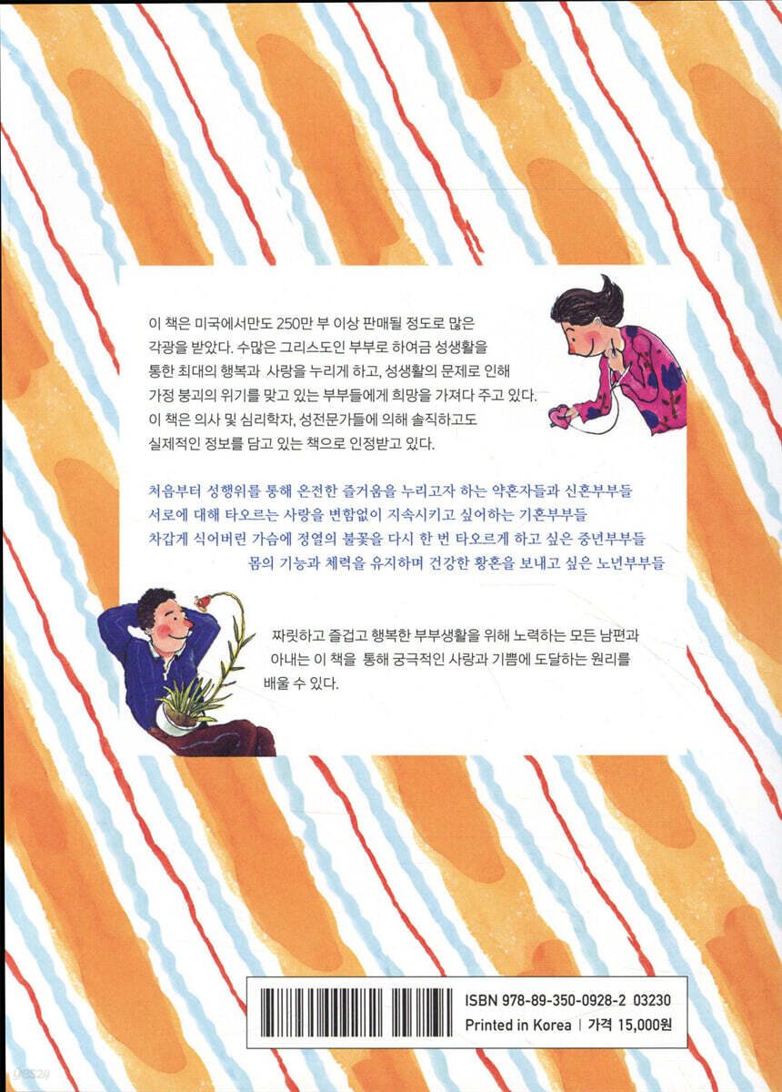 2장 남성에게 성행위는 어떤 의미인가? 3장 여자에게 있어 성행위가 갖는 의미란? 4장 하나님이 성을 창조하신 이유 5장 성교육 6장 성관계의 기술 7장 남성만을 위한 이야기 8장 여성만을 위한 이야기 9장 충족되지 않는 여성 10장 여성이 보이는 반응과 관건 11장 성무력증에 시달리는 남성 12장 올바른 가족계획 13장 통계로 본 성생활 14장 성에 관한 질문과 해답 |
