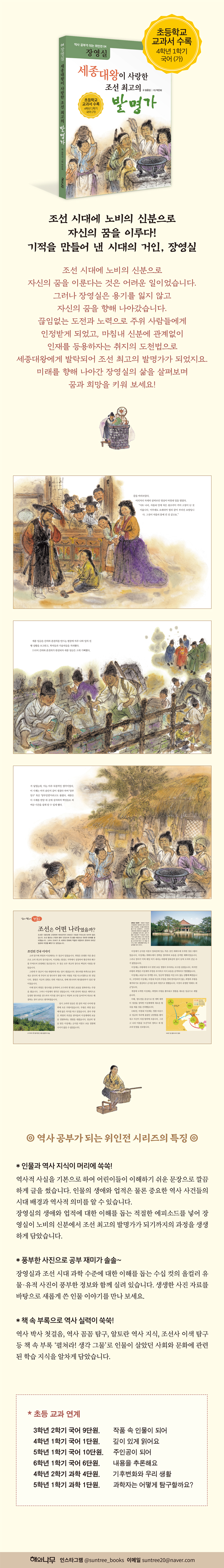 2 뜻이 있는 곳에 길이 있다 3 꿈꾸는 사람은 아름답다 4 넓은 세상에서 만난 뜻있는 사람들 5 중국 유학길에 오르다 6 마침내 벼슬길에 오르다 7 조선 과학의 새 시대가 열리다 8 조선의 시간을 찾아라 9 조선 최고의 발명왕이 됟 10 아름다운 우리 강산 11 세계 최초로 측우기 발명하다 12 떨어지는 별 책 속의 책 - 펼쳐라 생각 그물 |