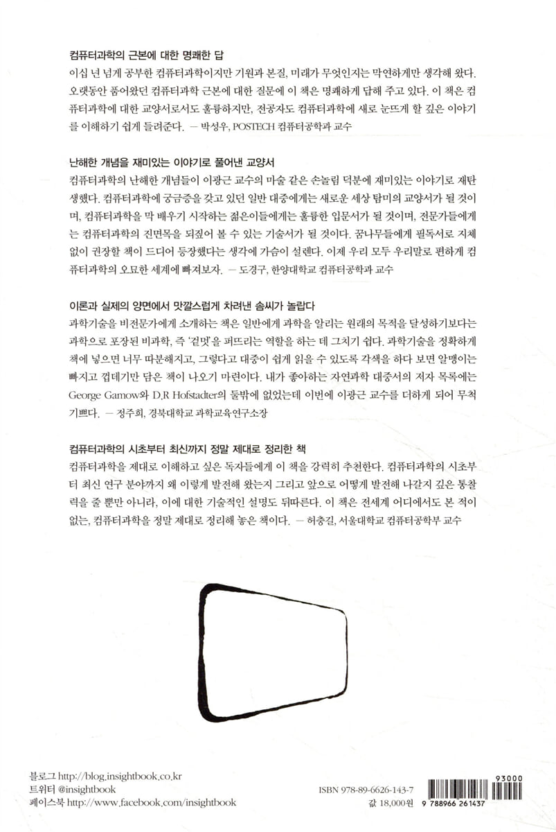 2. 400년의 축적 2.1 보편만능 기계의 탄생 __청년 앨런 튜링 __좌절을 확인하는 데 동원된 소품 __수학계의 꿈 __괴델이 깬 그 꿈 __케임브리지 강의 __컴퓨터의 원천 설계도 __단순한 부품 __궁극의 기계 __튜링기계를 테이프에 표현하기 __튜링기계를 돌리는 규칙표 __급소 __튜링의 불완전성 증명 __멈춤 문제의 증명 __컴퓨터 2.2 400년 __의문 __다른 트랙 3. 그 도구의 실현 3.1 다른 100년 3.2 생각 - 부울의 연구 __1854년 __그리고, 또는, 아닌 __같음 __조립 3.3 스위치 __직렬, 병렬, 뒤집기 __1937년 __스위치 분야의 날개 __디지털 __표현 방식 __판정, 선택, 응답, 기억 3.4 컴퓨터의 실현 __차곡차곡 쌓기 __규칙표 장치 __메모리 장치 __폰 노이만 __튜링 __재료 4 소프트웨어, 지혜로 짓는 세계 4.1 그 도구를 다루는 방법 __알고리즘 __언어 4.2 푸는 솜씨, 알고리즘과 복잡도 __풍경 __알고리즘 예 __비용 __현실적 __비현실적 __P의 경계 __NP 클래스 __오리무중 __P의 바깥 __통밥 __무작위 __불가능 __기본기 __양자 알고리즘 4.3 담는 그릇, 언어와 논리 __간격 __번역 사슬 __생김새 __표현력 __자동 번역 __실행 __언어 정글 __언어 중력 __두 중력권 __기계의 중력 __람다의 중력 __람다 계산법 __논리는 언어의 거울 __거울의 효능 __논리 거울, 짤 프로그램의 구도 잡기 __논리 거울, 짠 프로그램은 무난한가 __요약의 그물 __데이터의 중력 5. 그 도구의 응용 5.1 인간 지능의 확장 __고유 지능 __지식 표현 __지식 생성 __지식 검색 __팀워크 지능 __군중 지능 5.2 인간 본능의 확장 __놀이 본능 __소통 본능 __정보이론 __섀넌과 튜링 __정보량 __복음 __인코딩 __오류 수정 코드 5.3 인간 현실의 확장 __시공간 공유 __역발상 __암호 __열쇠 __완벽한 하인 __진품 감정 __벼랑 6. 마치면서 __아기의 첫 웃음 |