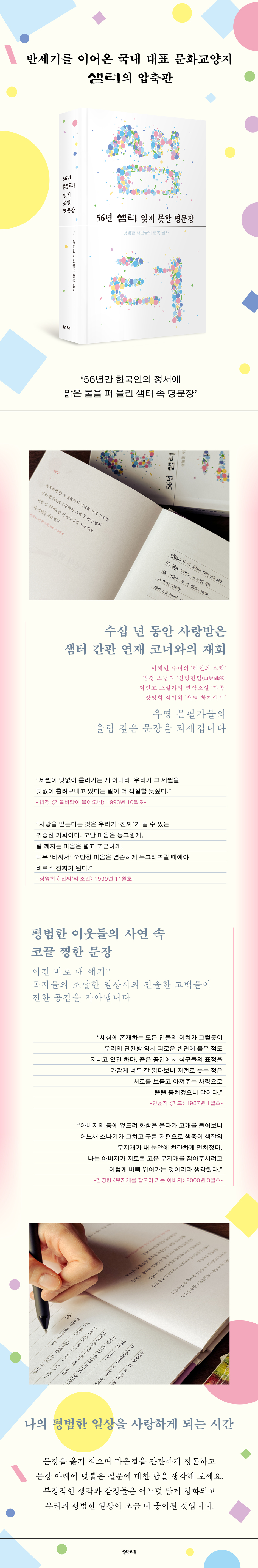잡지를 일일이 찾는 수고를 하지 않고도 한꺼번에 선물 받은 이 행복을 우리나라 전 국민과 나누고 싶은 마음 가득합니다. 인생에 도움 되는 보석 같은 글들을 같이 읽고 필사도 하면서 선과 진리를 향한 순례자, 사랑의 샘터 가족이 되는 꿈을 꾸어봅니다. 새롭게, 고맙게, 기쁘게! - 이해인 (시인, 수녀) |