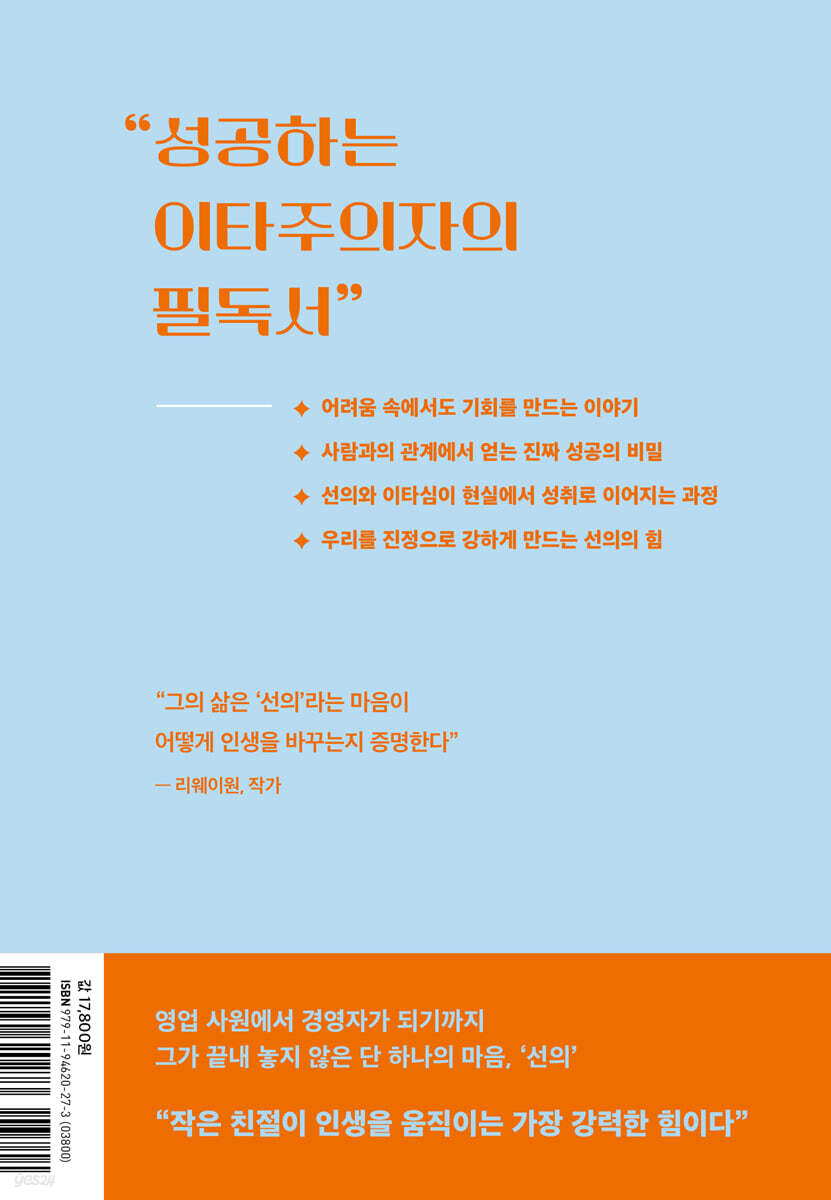 작은 친절이 인생을 움직이는 가장 강력한 힘이다 “너는 암에 걸려 본 적이 없으니, 내가 어떤 고통을 겪는지 잘 모를 거야. 네 말이 전혀 위로되지 않는구나.” 호스피스 병동에서 자원봉사를 하며 ‘위로하는 법’을 안다고 믿어 왔던 저자에게 이 말은 예상치 못한 일격이었다. 투병 중인 친구의 어머니를 위해 준비해 간 모든 말은 그 한마디 앞에서 무력해졌다. 몇 초간의 침묵 속에서 그는 처음으로 깨달았다. 자신은 타인의 고통을 이해한 것이 아니라, 이해하고 있다고 착각해 왔다는 사실을. 이 책은 바로 거기서 출발한다. 단순히 누군가를 돕는 데 능숙한 사람의 성공담이 아니다. 오히려 “나는 잘하고 있다”고 믿었던 태도가 뒤에 다시 겸손해지는 과정을 기록한 고백에 가깝다. 저자는 그날의 부끄러움을 덮어 두지 않았다. ‘진짜 위로란 무엇인가’를 배우기 위해 그는 암과 싸우고 있는 사람을 찾아가 친구가 되었고, 그 관계 속에서 ‘힘내’라는 말 대신 ‘그저 곁에 있어 주는 법’을 배웠다. 저자는 다양한 인생 경험을 중심으로 자기 삶의 주인으로서 관계와 일을 진심으로 대하는 법을 그려 보인다. 저자가 털어놓는 경험담들은 점점 더 깊어진다. 강연 도중 망설임 없이 가방 속 물건을 꺼내 즉석 경매를 열고 기부를 결정하는 장면, 20년 전 세상을 떠난 어머니를 돌봐준 의사를 찾아가 뒤늦게 전하는 감사 인사는 단순한 미담이 아니다. 저자는 이를 통해 선의란 준비된 계획이 아니라, 순간의 결단이며 태도라는 사실을 보여 준다. 사람을 향한 마음은 생각보다는 훨씬 더 행동에 가깝다는 것이다. 저자는 50여 년에 걸쳐 맺어 온 다양한 인연 속에서 형성된 삶의 철학을 이 책에 담았다. 오랜 시간 품어 온 질문인 ‘한 번뿐인 인생을 어떻게 하면 더 행복하고 충만하게 살 수 있을까?’에 대해 저자는 그 해답을 ‘선의’에서 찾는다. 안부를 묻고 배려하며 작은 선물을 건네는 일처럼 일상에서 실천되는 선의와 친절이 쌓일 때, 개인의 삶은 물론 세상 또한 따뜻함과 새로운 가능성으로 응답해 왔다는 사실을 가슴 따뜻해지는 이야기와 함께 들려준다. “당신의 선의는 결국 행복과 성공으로 돌아온다” 탁월한 영업 리더에서 삶의 철학자가 된 경영자의 가르침 관계와 선의의 힘으로 인생을 확장하는 최고의 안내서 우리는 흔히 이렇게 배워 왔다. ‘성과를 내려면 차갑게 계산적이어야 하고, 관계는 철저히 관리해야 하며, 선의는 마음속에만 간직하는 것이 안전하다고.’ 그러나 현실은 묘하게 어긋난다. 사람을 많이 만날수록 외로워지고, 영리하게 굴수록 관계는 얕아진다. 대만의 성공한 경영인이자 휴머니스트인 저자는 인생 경험을 통해 그 지독한 어긋남의 이유를 차분하게 깨닫게 한다. 저자는 서문에서 선의에 대한 확고한 신념을 제시한다. 진심으로 타인을 대하고 먼저 손을 내미는 선택은 결코 허공으로 사라지지 않으며, ‘선한 인연은 행복으로 돌아온다’고 강조한다. 그는 이 믿음을 증명하기 위해 자신의 삶을 하나의 거대한 실험실로 삼는다. Part 1에서 저자는 외부의 시선과 평가에 흔들리지 않고 자기 삶을 주도하는 태도를 다룬다. 스스로를 단련하며, 매일 열정적인 태도로 꿈을 향해 나아가는 것이 인생의 기본임을 강조한다. ‘더 나은 나’를 위한 자기 약속과 실천을 통해 젊음을 낭비하지 않고 가치 있게 사용하는 법을 배울 수 있다. Part 2에서는 사람과 사람 사이의 연결과 그 안에서 만들어지는 풍성한 경험을 이야기한다. 또한 영업과 경영의 핵심도 결국 ‘사람’에 있음을 설득력 있게 보여 준다. 낯선 사람과도 친구가 될 수 있는 열린 마음, 지혜로운 이들과의 교류, 그리고 일상을 여행처럼 즐기는 유연한 사고방식을 제안한다. 특히 팟캐스트나 국어 선생님 에피소드 등을 통해 자신만의 스토리(경험)를 만드는 즐거움을 보여 준다. Part 3에서 저자는 타인을 돕는 행위가 나 자신을 어떻게 성장시키는지에 집중한다. 자발적인 선의와 공익 활동이 단순히 남을 돕는 것을 넘어, 본인의 비즈니스와 삶에 긍정적인 선순환을 일으키는 과정을 보여 준다. 작은 선물, 늦은 감사 인사, 주변 친구들을 챙기는 마음 등 일상 속의 작은 친절이 얼마나 강력한 에너지를 가지는지 실제 에피소드를 통해 증명한다. 이 흐름은 자연스럽게 마지막 장으로 이어진다. 그렇다면 인생의 궁극적인 목적은 무엇인가. Part 4에서 저자는 진정한 행복의 정의와 인생의 지향점을 정리한다. 그는 서비스 정신과 긍정적 에너지가 타고난 재능이 아니라 ‘연습’을 통해 기를 수 있는 능력이라고 말한다. 자신을 낮추고 타인을 높이는 겸손함 속에서 발견하는 행복이 진정한 가치이며, 이 책의 핵심 메시지인 ‘사람을 향한 선의’가 곧 인생의 정답임을 다시 한번 일깨운다. 이 책은 우리에게 무조건 착해지라고 강요하지 않는다. 대신, 사람을 향한 선택이 왜 결국 나 자신을 살리는 유일한 길이 되는지를 치밀하고도 따뜻하게 설득한다. 책장을 덮을 즈음, 자신에게 묻게 될 것이다. “오늘 내가 먼저 내민 그 손은, 훗날 어떤 미래가 되어 돌아올까?” 이 질문에 답을 구하고 싶은 이들에게 이 책은 가