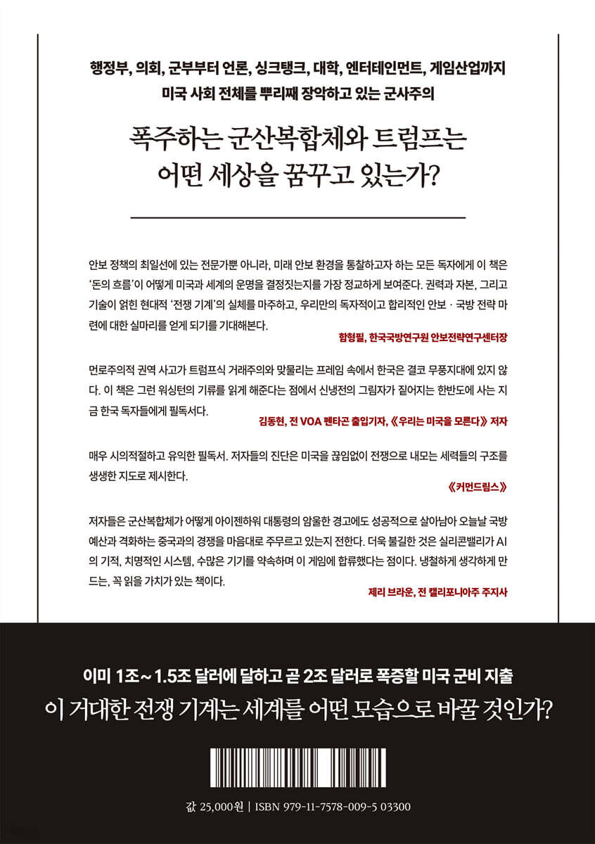 안보 정책의 최일선에 있는 전문가뿐 아니라, 미래 안보 환경을 통찰하고자 하는 모든 독자에게 이 책은 ‘돈의 흐름’이 어떻게 미국과 세계의 운명을 결정짓는지를 가장 정교하게 보여준다. 권력과 자본, 그리고 기술이 얽힌 현대적 ‘전쟁 기계’의 실체를 마주하고, 우리만의 독자적이고 합리적인 안보?국방 전략 마련에 대한 실마리를 얻게 되기를 기대해본다. - 함형필 (한국국방연구원 안보전략연구센터장)