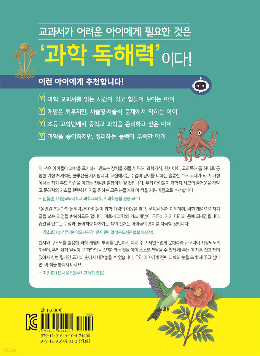 〈올인원ALL IN ONE 초등과학 문해력〉 시리즈 출간 AI 기술의 확산으로 정보에 접근하는 방식은 빠르게 변하고 있지만, 아이들이 과학 개념을 정확히 이해하고 이를 스스로 읽고 설명하는 힘은 여전히 중요한 과제로 남아 있습니다. 특히 과학 용어에 대한 이해를 바탕으로 과학 정보를 독해하고, 나아가 과학적 개념을 사고력과 표현력으로 확장해 나갈 수 있도록 돕는 전문 학습서는 많지 않은 상황입니다. 이러한 문제의식에서 출발한 〈올인원ALL IN ONE 초등과학 문해력〉 시리즈(전 3권)는 과학 학습의 핵심 요소인 개념 이해, 독해력, 사고력을 하나의 흐름으로 묶은 초등과학 문해력 학습서입니다. 동아시아사이언스에서 출간한 이 시리즈는 과학·한자·독해를 통합한 올인원(all in one) 구조를 통해, 과학을 ‘외우는 과목’이 아니라 ‘읽고 이해하는 언어’로 학습하도록 돕습니다. 이 시리즈는 ‘개념 → 독해 → 활동’의 3단 구조로 학습이 진행됩니다. 먼저 한자를 통해 과학 용어의 뜻을 풀어내며 개념 이해의 기초를 다지고, 이어 과학 교과서와 연계된 제시문을 읽으며 사실적·추론적 독해 문제를 해결합니다. 마지막으로 생각을 정리하고 설명하는 확장 활동을 통해 과학 문해력과 표현력을 함께 기를 수 있도록 설계됐습니다. 특히 2022 개정 교육과정을 충실히 반영해 초등과학의 핵심 개념을 독해 중심으로 재구성했습니다. 1권은 〈생물〉, 2권은 〈운동과 에너지/물질〉, 3권은 〈지구와 우주/과학과 사회〉를 다루며, 초등과학에서 중등과학으로 자연스럽게 이어지는 학습 흐름을 제시합니다. ‘초등-중등 과학 교과 연계표’와 ‘교과서 키워드 한눈에 보기’ 등 실질적인 학습 보조 자료도 함께 수록됐습니다. 이 학습서의 또 다른 특징은 생성형 AI를 학습 설계 보조 도구로 활용했다는 점입니다. AI로 초등·중등과학 교과서를 분석해 과학 문해력 학습 구조를 설계하고, 초등 교과에서 중등 교과로 연계되는 핵심 내용을 제시문으로 구성했습니다. AI의 한계를 보완하기 위해 과학 교육 현장을 잘 아는 과학 교사의 감수 및 기획·편집진의 꼼꼼한 검토와 수정 과정을 거쳐, 교육 현장에서 신뢰할 수 있는 학습서로 완성해 냈습니다. 이 시리즈를 추천한 전문가들의 평가 또한 긍정적입니다. “이 책은 과학지식, 한자어휘, 교과독해를 하나로 통합한 가장 체계적인 솔루션이다.” 신동훈 서울교육대학교 과학교육 및 AI과학융합 전공 교수 추천 과학이 어려운 이유는 개념 때문이 아니라, ‘과학 문장을 읽지 못하기 때문’입니다. 〈올인원ALL IN ONE 초등과학 문해력〉 시리즈는 이 문제의식에서 출발한 새로운 개념의 초등과학 학습서입니다. 신동훈 서울교육대학교 과학교육 및 AI 과학융합 전공 교수는 다음과 같이 이 책의 특징을 짚으며 초등학생들에게 미치는 영향력을 높이 평가합니다. · 1단계(개념 알기): 한자 뜻풀이를 통해 용어의 본질을 이해하고, 초·중등 교과 과정과 연계하여 학습의 연속성을 확보합니다. · 2단계(독해력 키우기): AI가 분석한 최적화된 지문을 읽으며 사실적·추론적 사고력을 기르고 글의 의미를 파악하는 훈련을 합니다. · 3단계(사고력 넓히기): 핵심 개념을 직접 쓰고 응용하며, AI 한 줄 요약을 통해 학습 내용을 완벽하게 내면화합니다. 오늘날 기초 학력의 핵심인 ‘문해력’은 과학 교과에서도 예외가 아닙니다. 특히 한자어가 대다수인 과학용어는 아이들이 과학을 포기하게 만드는 가장 큰 장벽입니다. 이 책은 그 장벽을 허물기 위해 ‘과학지식, 한자어휘, 교과독해’를 하나로 통합한 가장 체계적인 솔루션을 제시합니다. 이 책은 교실에서는 수업의 깊이를 더하는 훌륭한 보조 교재가 되고, 가정에서는 자기 주도 학습을 이끄는 친절한 길잡이가 될 것입니다. 아이들이 과학적 사고의 즐거움을 깨닫고 문해력의 기초를 탄탄히 다지길 원하는 모든 분들에게 이 책을 추천합니다. 과학을 외우는 아이에서, 과학을 읽고 이해하는 아이로! |