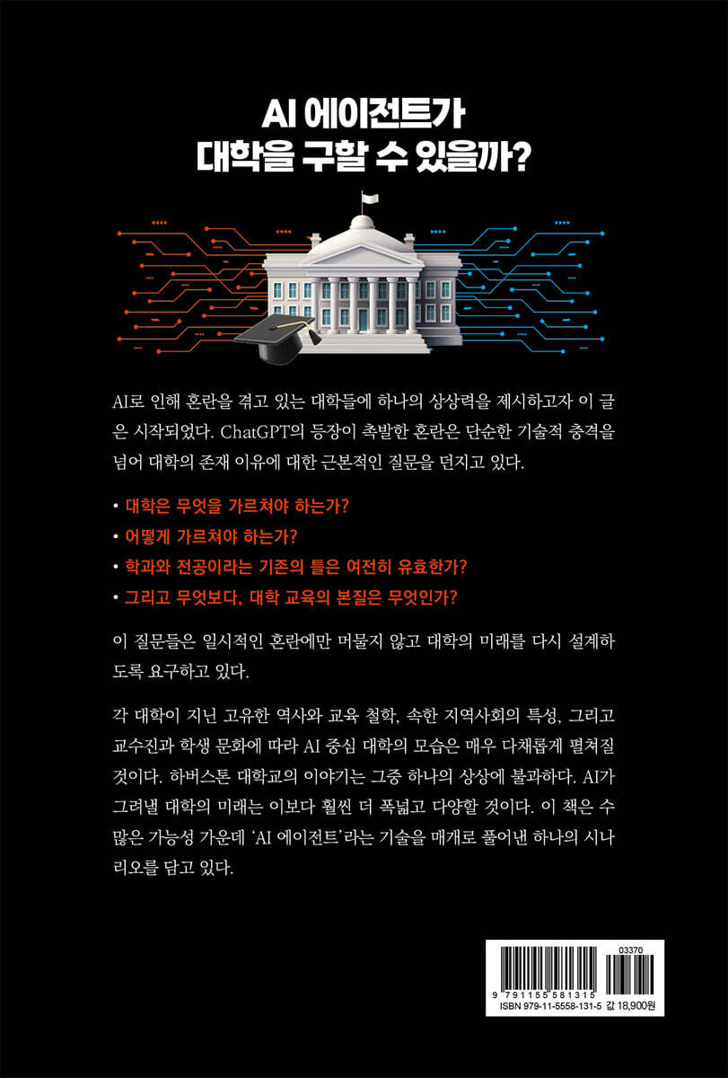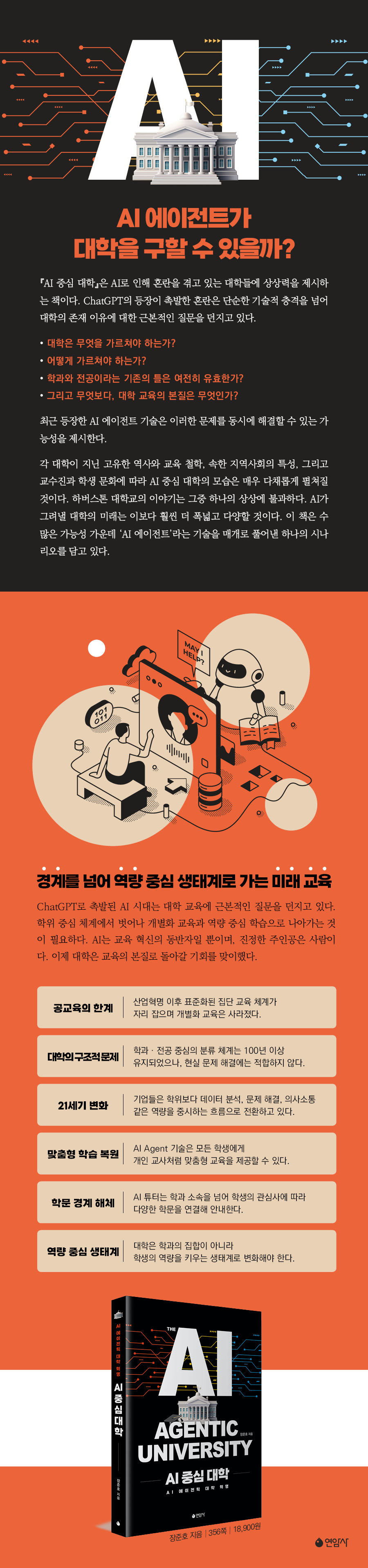 학생들의 ChatGPT 사용을 규제해야 할까, 권장해야 할까? AI 사용은 학칙 위반인가, 권장사항인가? 학생들은 혼란스럽다. 교수들도 변화의 필요성에는 공감하지만 어떻게 해야 할지 고민이 많다. 강의 내용을 바꿔야 할까? 2022년 11월 ChatGPT의 등장은 AI 시대 서막을 알렸다. 이후 다양한 생성형 AI가 빠르게 확산되며 사회 전반에 변화를 가져왔지만, 대학은 여전히 혼란 속에 방향을 잡지 못하고 있다. 일부 교수는 AI 사용을 규제하고, 일부는 권장하는 등 명확한 기준이 부재해 학생과 교수 모두 혼란을 겪고 있다. 역사적으로 공교육은 산업혁명 이후 표준화된 집단 교육 체계로 자리 잡았고, 대학은 학위 중심의 신뢰 기반을 형성해왔다. 그러나 21세기 들어 기업들은 학위보다 데이터 분석, 문제 해결, 의사소통 같은 역량(competencies)을 중시하는 흐름으로 전환하고 있다. 이는 학과와 전공이라는 전통적 지식 분류 체계가 현실 문제 해결에 적합하지 않음을 보여 준다. 공교육의 한계: 산업혁명 이후 표준화된 집단 교육 체계가 자리 잡으며 개별화 교육은 사라졌다. 대학의 구조적 문제: 학과·전공 중심의 분류 체계는 100년 이상 유지되었으나, 현실 문제 해결에는 적합하지 않다. 21세기 변화: 기업들은 학위보다 데이터 분석, 문제 해결, 의사소통 같은 역량을 중시하는 흐름으로 전환하고 있다. 맞춤형 학습 복원: AI Agent 기술은 모든 학생에게 개인 교사처럼 맞춤형 교육을 제공할 수 있다. 학문 경계 해체: AI 튜터는 학과 소속을 넘어 학생의 관심사에 따라 다양한 학문을 연결해 안내한다. 역량 중심 생태계: 대학은 학과의 집합이 아니라 학생의 역량을 키우는 생태계로 변화해야 한다. 최근 등장한 AI 에이전트 기술은 이러한 문제를 동시에 해결할 수 있는 가능성을 제시한다. AI는 모든 학생에게 맞춤형 학습을 제공해 개별화 교육을 복원하고, 학문 간 경계를 허물어 학생의 관심사에 따라 다양한 분야를 넘나들며 학습을 안내할 수 있다. 대학은 더 이상 학과의 집합이 아니라 학생의 역량을 키우는 생태계로 변화해야 한다. 소설 형식을 빌린 이 책은 ‘하버스톤’이라는 가상의 미국 대학을 배경으로 AI 중심 대학의 가능성을 탐구하며, 각 대학이 가진 역사와 철학, 지역적 특성에 따라 다양한 모습으로 진화할 수 있음을 보여 준다. 중요한 것은 AI가 도구일 뿐이며, 교육의 본질은 언제나 생각하는 힘을 키우는 것이라는 점이다. 우리는 교육의 본질로 돌아갈 기회를 맞이했으며, 이 책은 그 여정을 시작하는 독자들에게 작은 영감을 제공한다. It is the supreme art of the teacher to awaken joy in creative expression and knowledge. 창의적 표현과 지식에서 기쁨을 일깨우는 것, 그것이 교사의 최고 예술이다. 아인슈타인 |
