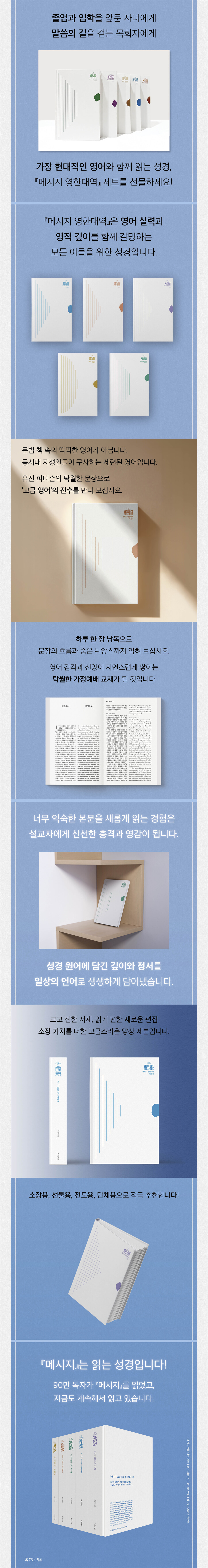 『메시지』는 교인들에게 성경을 읽게 해주려는 한 목회자의 열정에서 시작되었습니다. “교인들이 성경을 원문으로 읽을 수 있다면 얼마나 신선한 충격을 받을까……” 하는 고민을 하면서, 교인들이 성경에 좀 더 다가갈 수 있도록 그들이 사용하는 일상의 언어로 ‘갈라디아서’를 번역하기 시작했습니다. 1년에 걸쳐 완성된 그 번역을 읽은 교인들은, 성경이 능히 읽을 수 있고 이해할 수 있으며, 다른 도움 없이도 읽어 낼 수 있는 책이라는 것을 알게 되었습니다. 성경은 우리가 거리와 시장과 식탁에서 사용하는 언어, 가족과 친구와 동료들과 사용하는 일상의 언어로 쓰여졌기 때문입니다. 『메시지』는 성경 원문을 학문적으로 충실히 옮긴 성경입니다. 『메시지』는 평생을 원어로 성경을 읽고 공부하고 가르쳐 온 학자이자 35년을 목회자로 살아온 저자 유진 피터슨의 모든 것이 녹아든 평생의 결실입니다. 그는 이미 좋은 번역본이 많이 나와 있는 직역이 아니라, 원문의 의미를 좀 더 생명력 있고 인상 깊게 전하는 데 적합한 오늘의 언어로 의역(paraphrase)했습니다. 10년의 세월 동안 주 5일 하루 6시간을 이 번역 작업에 들였던 것입니다. 이처럼 『메시지』는 한 개인의 신학과 목회적 배경과 역사를 지닌 사역(私譯)이지만, 북미의 신뢰받는 신구약학 학자들의 감수를 통해 학문적으로 검증을 받았습니다. 『메시지』는 성경 번역의 전통을 따른 성경입니다. 위대한 성경 번역가 중 한 명인 16세기의 윌리엄 틴데일은 “쟁기로 밭을 가는 소년도 읽을 수 있게” 성경을 번역한다고 했습니다. 그 시대의 언어로 번역해서 누구나 읽을 수 있어야 한다는 번역의 전통에 따라, 성경은 새로운 시대와 독자에 맞게 끊임없이 재번역되어 왔습니다. 모든 사람이 능히 읽을 수 있는 성경으로 복음의 소식을 접할 수 있게 된 것은 그런 소중한 전통 때문이었습니다. 그 오랜 성경 번역의 역사와 전통을 『메시지』도 따르고 있습니다. 『메시지』는 1천만 독자가 선택한 성경입니다. 1993년 신약 출간, 2002년 완역본이 출간된 이후, 영미권에서만 1천만 독자들이 『메시지』를 선택해서 읽고 있습니다. 기존의 성경을 돕고 탁월하게 보완해 줄 뿐 아니라 본문의 의미를 살아나게 하는 ‘성경 옆의 성경’으로, 『메시지』는 의미역 성경 가운데 가장 광범위하게 읽히고 인용되고 있습니다. 『메시지』는 당신을 위한 성경입니다. 성경을 처음 읽는 사람이나 오랫동안 읽어 왔기에 성경이 너무 익숙해서 오히려 낯선 사람들, 성경을 공부하려는 사람이나 홀로 말씀을 깊게 묵상하고픈 사람들, 말씀을 전하는 설교자나 성경을 가르치는 주일학교 교사, 성경을 한번 읽어 봐야겠다는 마음을 갖고 있는 구도자나 믿지 않는 친구들…… 『메시지』는 바로 당신을 위한 성경입니다. |