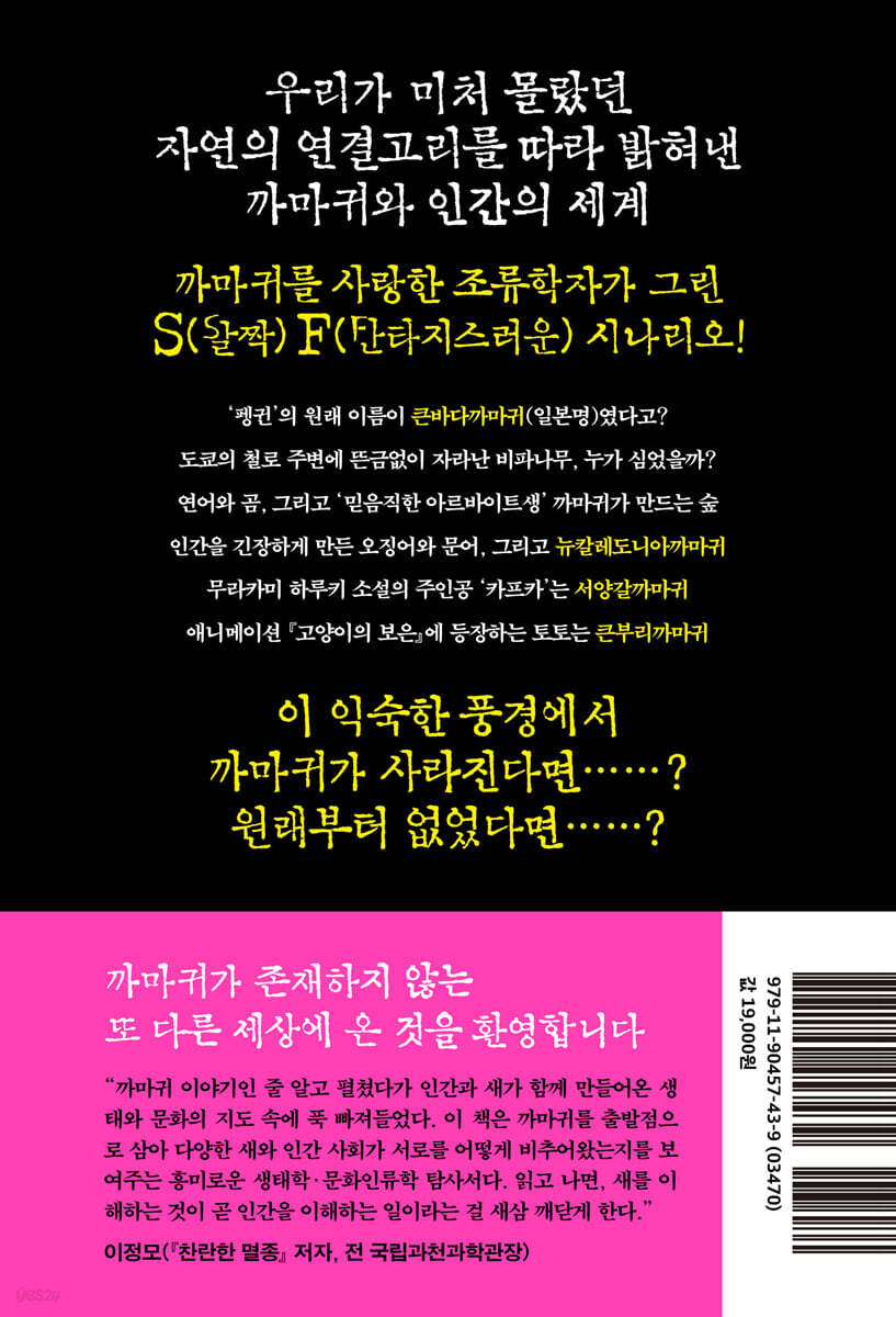 “까마귀 이야기인 줄 알고 펼쳤다가 인간과 새가 함께 만들어온 생태와 문화의 지도 속에 푹 빠져들게 되었다. 이 책은 까마귀를 출발점으로 삼아 다양한 새와 인간 사회가 서로를 어떻게 비추어왔는지를 보여주는 흥미로운 생태학·문화인류학 탐사서다. 이 책을 읽고 나면 새를 이해하는 일은 곧 인간을 이해하는 일이라는 사실을 새삼 깨닫게 된다.” - 이정모 (전 국립과천과학관장)