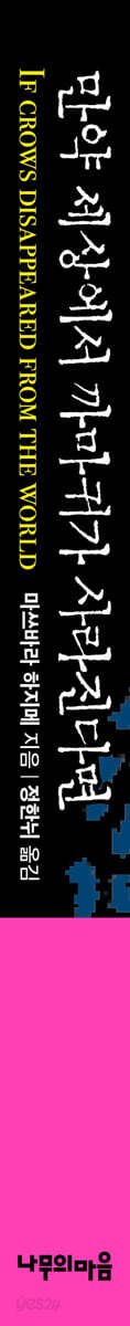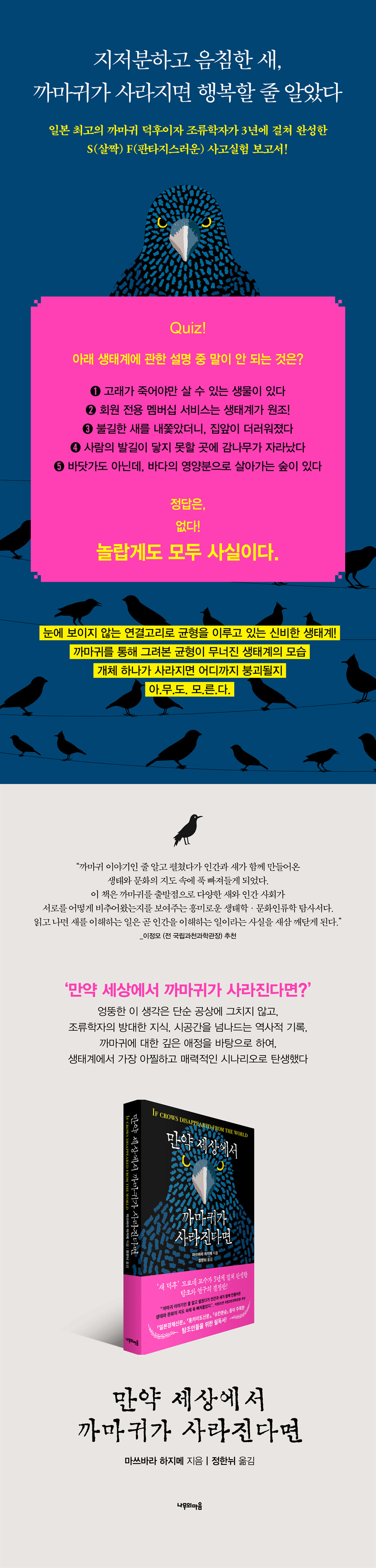 만약 세상에서 까마귀가 사라진다면 제1장 생태계에서 까마귀가 사라진다면 까마귀는 핵심종일까? 생태계에서 까마귀의 역할 애초에 까마귀는 어떤 새인가 까마귀는 생태계의 편의점? 까마귀가 절멸한 열대의 섬 제2장 생명의 역사에서 까마귀가 지워진다면 처음부터 까마귀가 없는 세계 이런저런 설정을 덧붙여가며 상상한 미래 까마귀의 대타(X) 대역 후보 대역 후보 0 : 저기요, 혈연자는 안 되나요? 대역 후보 1 : 청소부 역할의 새들 대역 후보 2 : 과일도 좋아하는 잡식성 새들 정말로 새의 부리가 커질 수 있을까? 대역 후보 3 : 의외의 후보 앵무새 식성을 완전히 바꿔라! 특별 후보 : 신화 속의 새 그런데 색깔도 바뀔까? 제3장 인간 사회에서 까마귀가 사라진다면 종교에서 까마귀가 사라진다면 고대 신화와 자연 신앙 속 까마귀 기독교 속 까마귀 이슬람교 속 까마귀 불교 속 까마귀 종교 문화 속 까마귀의 대역 후보 일본 민간신앙 속 까마귀 문학에서 까마귀가 사라진다면 「까마귀」 엔터테인먼트에서 까마귀가 사라진다면 『포켓몬스터』 『귀멸의 칼날』 『미소녀 전사 세일러문』 『둘리틀 박사의 바다 여행』 『기동경찰 패트레이버 극장판』 『고양이의 보은』 『까마귀네 빵집』 시리즈 『하필이면 까마귀가 되어버렸다』 『잘 자요 까마귀, 또 봐요』 『곰과 까마귀』, 『영구 기관 오목눈이』 『과장님은 까마귀!』, 『심야식당』 이름에서 까마귀가 사라진다면 새 이름에서 까마귀가 사라진다면 사람 이름에서 까마귀가 사라진다 학문에서 까마귀가 사라진다면 생물학에 미치는 영향은…… 동물 지능 연구에 파문을 일으킨 뉴칼레도니아까마귀 까마귀처럼 지능이 발달한 조류가 등장할까? 오징어와 문어가 라이벌이라고? 까마귀는 시민들이 연구하기 좋은 생물일까? 제4장 까마귀의 대역 오디션 최종 후보를 발표하기에 앞서 다시금 고찰해본 둥지 위치 까마귀의 대역이 활보하는 세상으로 청소동물에서 대역이 나온다면 후보 1 : 콘도르, 독수리, 솔개, 카라카라 까마귀독수리 vs 까마귀콘도르 씨앗 산포자로서의 대역은? 갈매기가 까마귀의 대역이 될 수 있을까? 도시에 사는 동물 중에서 대역이 나온다면 후보 2 : 찌르레기, 바다직박구리 도시에 둥지를 튼 새라면…… 머리가 좋은 새 중에 대역이 나온다면 후보 3 : 앵무새 유력한 조건부 후보 후보 4 : 과일을 먹는 맹금류 후보 5 : 육식성이 된 비둘기 최종 결과 발표 : 그리고 아무도 없었다? 에필로그 조류학자 마쓰바라의 또 다른 일상 참고 문헌·도서 주 |