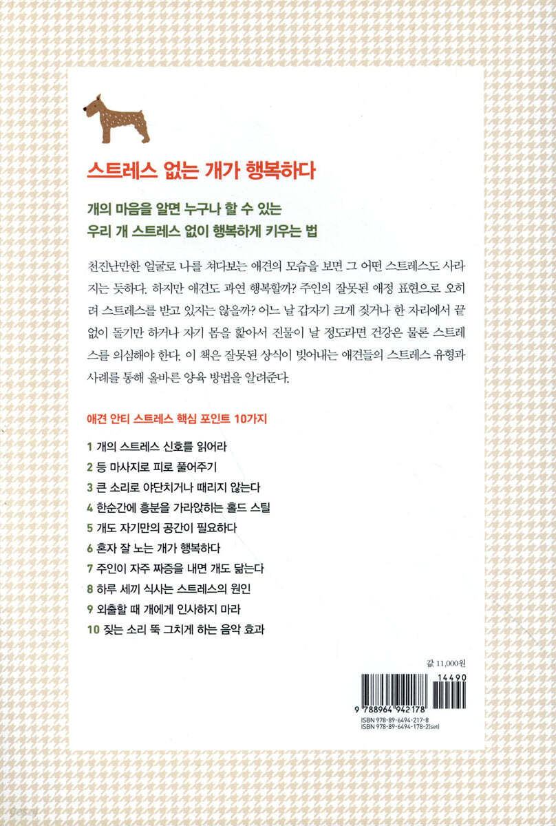 개의 마음을 알면 누구나 할 수 있는 우리 개 스트레스 없이 행복하게 키우는 법 “꼬리를 흔드는 건 기분 좋다는 뜻이죠?” 개를 키우는 이들 가운데 대부분의 사람들은 이렇게 생각한다. 얼굴 표정이 사람처럼 다양하지 않은 개의 기분을 꼬리 흔드는 모습 등으로 판단하는 것이다. 정말일까? 개는 기분이 좋을 때 꼬리를 흔들까? 《우리 개 스트레스 없 키우기 : 안티 스트레스》는 바로 개의 마음을 읽는 핵심 포인트를 짚어줌으로써, 사랑스러운 나의 개가 스트레스 없이 행복하게 자랄 수 있도록 하는 양육 길라잡이 역할을 해준다. 일본 아마존에서 애견 분야 최장기 베스트셀러 1위를 기록한 《우리 개 100배 똑똑하게 키우기》를 출간한 바 있는 이 책의 저자는 세계에서 가장 권위 있는 애견 훈련사 가운데 하나다. 저자는 개를 똑똑하게 키우는 것만큼이나 ‘스트레스 없이’ 키우는 것이 중요하다고 단언한다. 이 책에 따르면 개는 기분이 좋을 때도 꼬리를 흔들지만, 긴장하거나 공포를 느낄 때에도 꼬리를 흔든다. 사정이 이러하니 꼬리를 흔든다고 무조건 좋아할 일만은 아니다. 만약 스트레스성 반응으로 꼬리를 흔드는 걸 보고 기분이 좋다는 뜻으로 오해하면 주인으로서는 개에게 적절한 조치를 취할 수 없다. 이 책의 저자는 우리가 “개를 위해서 하는 행동의 70퍼센트 혹은 80퍼센트가 오히려 개에게 스트레스를 준다”고 말한다. 주인의 지나친 애정 표현이 오히려 개에게 스트레스가 된다고 한다면, 그 개는 주인을 믿고 따르지 않게 될 것이다. 저자는 개에게 스트레스를 주는 가장 대표적인 행동으로 넓은 거실에서 풀어놓고 키우기, 자주 아는 척하기, 정해진 시간에 먹이 주기 등을 꼽고 있다. 이렇듯 주인이 ‘개와 접촉하는 방법’의 문제점을 검토하고 그 해결책을 제시하는 이 책은 지금까지 몰랐던 개의 스트레스를 찾아내고 올바른 방법으로 해소시켜줌으로써 개와 주인의 신뢰관계를 더욱 돈독하게 만들어줄 것이다. 애견 안티 스트레스 핵심 포인트 21가지 1_ 개의 스트레스 신호를 읽어라 개의 스트레스 신호는 다양하다. 마치 노이로제에 걸린 사람처럼 같은 부위를 계속 핥는 이유는 무얼까? 실컷 자고 나서도 계속 하품을 하는 이유는? 피부병이 있는 것도 아닌데 귀를 자꾸 긁는 까닭은 또 무얼까? 이렇듯 도무지 종잡을 수 없는 개의 행동은 모두 스트레스를 받고 있다는 신호다. 그 징후를 잘 살펴보자. 2_ 등 마사지로 피로 풀어주기 주인이 만지면 흥분과 공포, 경계심이 사라지고, 긴장이 풀리면서 마음이 안정되는 부위가 바로 등이다. 소심하고 겁이 많거나, 공격적인 개들에게 등 마사지는 효과 만점이다. 반복해서 마시지해주면 개의 기분이 안정되고, 표정도 느긋해질 것이다. 3_ 큰 소리로 야단치거나 때리지 않는다 개에게 생활습관을 가르친다며 큰 소리로 야단치거나 때리는 것은 백해무익하다. 개는 야단을 맞으면 반성을 하는 것이 아니라 ‘야단을 맞았다’는 사실만 기억한다. 따라서 심한 스트레스에 시달리고 심지어는 야단친 사람에 대한 적대감 혹은 공포감을 키우게 된다. 4_ 한순간에 흥분을 가라앉히는 홀드 스틸 개 뒤에서 밀착한 자세로 껴안는 ‘홀드 스틸’은 극도로 흥분한 개를 진정시키는 최고의 방법이다. 홀드 스틸은 놀이의 성격이 강한 터칭과 달리 마음을 진정시키고 긴장을 푸는 데 주 목적이 있다. 개에게 홀드 스틸은 인간의 심호흡과 비슷한 작용을 한다. 5_ 개도 자기만의 공간이 필요하다 개를 집 지키는 용도로 키우겠다며 현관 앞에 개집을 두는 주인들이 있다. 하지만 낯선 사람들이 언제든 방문하는 개방된 장소에 있는 개는 도무지 안정을 취할 수 없다. 하루 종일 필사적으로 침입자를 경계하느라 잔뜩 긴장해 있는 것이다. 개도 심신을 편안히 할 수 있는 자기만의 공간이 필요하다는 것을 잊지 말라. 6_ 혼자 잘 노는 개가 행복하다 주인이 매일 함께 놀아주면 개는 주인과의 놀이를 규칙적인 일과로 생각하게 되고, 이를 충족하지 못하게 되면 심한 스트레스를 받는다. 개는 오히려 주인이 자신에게 조금은 무관심하거나 집에서 잘 놀아주지 않을 때 스트레스를 덜 받는다. 바쁜 시간을 쪼개 개와 놀아줘야 한다는 의무감을 버려라. 7_ 주인이 자주 짜증을 내면 개도 닮는다 개가 스트레스를 받는 원인 가운데 하나가 바로 주인의 성격이다. 주인이 짜증을 내거나 불안해하면 개도 영향을 받아 신경이 예민해질 수 있다. 따라서 개가 주인의 감정을 알아채고 스트레스를 받지 않도록 배려하는 것이 중요하다. 8_ 하루 세끼 식사는 스트레스의 원인 사람에게는 규칙적인 식사가 건강의 지름길이지만 개는 이와 정반대다. 개에게 규칙적으로 먹이를 줄 경우, 그 시간만 되면 실제로 배가 고픈 정도와 상관없이 먹이를 기대하게 된다. 이는 개에게 심각한 스트레스를 준다. 혹시라도 정해진 시간에 먹이를 주지 않으면 짜증과 스트레스가 더욱 커진다. 오히려 의도적으로 매일 다른 시간에 밥을 주는 편이 좋고, 식사 횟수 역시 세끼를 꼬박 챙기는 것보다는 한 끼 정도로 줄이는 것이 좋다. 9_ 외출할 때 개에게 인사하지 말라 개를 혼자 집에 두는 것이 미안