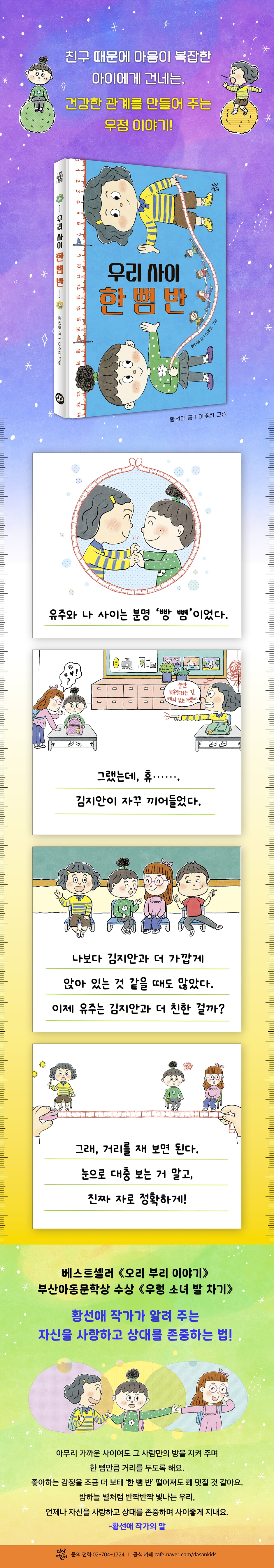 “우정을 잴 수 있다면 너랑 나 사이는 몇 뼘일까?” 아이들은 자라면서 종종 친구 문제로 큰 고민에 빠지곤 합니다. ‘절친한테 저보다 더 친한 친구가 생긴 것 같아요.’ ‘친구랑 사이가 멀어져서 고민이에요.’ 이런 관계에 대한 고민들은 수학 문제보다 훨씬 더 어렵고 복잡하게 느껴집니다. 친구 사이는 눈으로 확인할 수 없는 미묘한 감정들로 이루어져 있기 때문입니다. 이렇게 보이지 않는 우정이란 관계를 진짜 자로 재어 볼 수 있다면 어떨까요? 눈금처럼 정확하게 친구 문제를 해결할 수 있지 않을까요? 『우리 사이 한 뼘 반』 속 주인공 해라는 자신이 겪고 있는 고민을 해결하고자 줄자를 꺼내 듭니다. 유주가 자신과 지안이 중 누구랑 더 친한지 알기 위해 셋 사이의 실제 거리를 재기 시작합니다. 몸이 멀어지면 마음이 멀어진다는 말이 있듯이 반대로 마음이 멀어지면 몸도 멀어진다고 생각했으니까요. 건강한 관계를 만들어 주는 특별한 거리, 한 뼘 반 자신을 사랑하고 상대를 존중하는 법 해라는 찐친인 유주와 늘 빵 뼘을 유지해야 한다고 생각합니다. 무엇이든 꼭 붙어서 같이 하는 게 진정한 친구라고 생각하기 때문입니다. 그렇기에 자신과 유주 사이에 있는 두 뼘이란 거리를 확인했을 때 관계가 끝날 거라 짐작하지요. 조금의 빈틈도 없는 사이, 그 거리만이 돈독한 친구 관계를 지속시켜 주는 거리일까요? 『우리 사이 한 뼘 반』은 오히려 친한 사이일수록 ‘적절한 거리’가 필요하다고 이야기합니다. 친구와 가까워질수록 아이들은 종종 자신과 친구를 동일시합니다. 하나 남은 간식을 나눠 먹고, 어디든 같이 다니는 이유가 이 때문이지요. 하지만 그로 인해 적절한 거리를 유지하는 데 어려움을 느껴 이것이 갈등으로 번지는 경우도 많습니다. 『우리 사이 한 뼘 반』은 관계에 대한 아이들의 고민을 섬세하게 다루면서도 ‘친구랑 사이좋게 지내.’라는 뻔한 답이 아닌, 건강한 관계를 만드는 방법을 알려 줍니다. 한 뼘 안에서 다시 반 뼘 물러나기, 즉 ‘한 뼘 반’만큼 떨어진 거리의 관계를 보여 줍니다. 우리는 저마다 고유한 방을 갖고 있습니다. 그곳엔 누구도 함부로 들어가선 안 되고, 아무리 친한 사이여도 꼭 지켜 줘야 하는 공간이지요. 그 방으로부터 한 뼘 멀어지면서도, 존중하는 마음을 보태 반 뼘 더 멀어진 거리가 바로 한 뼘 반입니다. 각자의 방을 배려하는 동시에 서로 좋아하는 마음을 꺼내 보일 수 있는 이 거리 덕분에 해라와 유주를 포함한 작품 속 인물들은 더욱 사이좋은 관계로 발전합니다. 고독은 쫌 괜찮은 것 같다.’ 혼자 서는 당당함과 가치를 다룬 이야기 친구 관계, 우정을 다룬 수많은 작품 중에서도 『우리 사이 한 뼘 반』은 어린이의 내면을 더욱 밀도 있게 그린 작품입니다. 친하게 지내던 친구와 사이가 멀어지고 나면 가장 마지막에 마주하는 감정은 ‘고독’입니다. 친구에 대한 미움, 질투가 사라지고 그 자리에 외로움이 찾아오기 때문입니다. 제11회 비룡소문학상 수상작 『오리 부리 이야기』, 부산아동문학상 수상작 『우렁 소녀 발 차기』 등 어린이를 둘러싼 세계에 꾸준히 주목해 온 황선애 작가가 이번에는 어린이의 감정, 그중에서도 고독을 주의 깊게 다룬 작품으로 돌아왔습니다. 흔히 고독은 부정적으로 여겨집니다. 그렇기에 유주와 싸우고 난 뒤, 혼자가 된 해라는 고독이 참 나쁘다고 이야기합니다. 하지만 혼자만의 시간을 보내면서 트라우마를 멋지게 극복하는 경험을 합니다. 누군가 옆에 있었다면 해라가 결코 시도하지 않았을 것이지요. 해라는 고독한 덕분에 혼자서도 해낼 수 있다는 자신감과 용기를 갖게 됩니다. 『우리 사이 한 뼘 반』은 함께하는 기쁨과 고독의 가치를 균형감 있게 그려 냄으로써 혼자 있는 시간이 외로운 결핍의 시간이 아니라 나를 돌보고 채우는 시간임을 어린이의 눈높이에 맞춰 알려 주는 작품입니다. |
