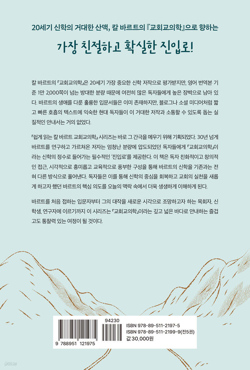 감사의 글 한국의 독자들에게 추천사 1 추천사 2 책 활용법 들어가며 PART 1 『교회교의학』에 초점 맞추기 1장 우주에서 내려다본 『교회교의학』 2장 지구 궤도에서 바라보다 3장 12km 상공에서 바라보다 | 우주선이 재진입하는 시점에서 본 풍경 4장 9km 상공에서 바라보다 | 창밖으로 내려다본 풍경 5장 4km 상공에서 바라보다 | 산 정상에서 내려다본 풍경 6장 1.5km 상공에서 바라보다 | 산 둘레길에서 본 풍경 7장 365m 상공에서 바라보다 | 등산로 시작점에서 바라본 풍경 PART 2 『교회교의학』 I/1 『교회교의학』의 하나님을 만나다 『교회교의학』 제1장 “교의학의 기준으로서의 하나님의 말씀” 8장 산에 오르기 전 챙겨야 할 것들 | § 1. 교의학의 과제 9장 갈 길을 미리 확인해보다 | § 2. 교의학 서론의 과제 10장 정상적인 등산로로 가고 있는지 점검하기 | § 3. 교의학의 소재로서의 교회 선포 11장 좋은 도구로 길을 찾고, 첫걸음을 내딛다 | § 4. 하나님의 말씀의 삼중 형태 12장 여정을 준비하며 길을 조망해보다 | § 5. 하나님의 말씀의 본질 13장 길 위에 첫발을 디디다 | § 6. 하나님의 말씀의 인식 가능성 14장 방향 점검 | § 7. 하나님의 말씀, 교의, 교의학 『교회교의학』 제2장 “하나님의 계시” 15장 시선을 압도하는 산을 바라보며 | § 8. 자신을 계시하시는 하나님 16장 장엄한 산을 자세히 들여다보다 | § 9. 하나님의 삼위일체성 17장 산의 기원을 파악하다 | § 10. 아버지 하나님 18장 비로소 뚜렷하게 보이는 산의 진면모 | § 11. 아들 하나님 19장 직접 체험하는 산의 경이로움 | § 12. 성령 하나님 PART 3 『교회교의학』 I/2 하나님과 인간을 연결하는 ‘계시와 자유’ 20장 무한한 가능성으로 가득한 진짜 산을 발견하다 | § 13. 인간을 향한 하나님의 자유 21장 준비, 참여, 기억의 시간 | § 14. 계시의 시간 22장 산의 존재와 생성 발견하기 | § 15. 계시의 비밀 23장 우리 안에 깃든 경이를 향한 자유 | § 16. 하나님을 향한 인간의 자유 24장 산을 해치려는 인간의 시도에 맞서다 | § 17. 종교의 지양으로서의 하나님의 계시 25장 산 앞에서 살아 있음을 누리는 자유 | § 18. 하나님의 자녀들의 삶 『교회교의학』 제3장 “성서” 26장 세심한 탐험을 위한 안내자의 가이드북 | § 19. 교회를 위한 하나님의 말씀 27장 탐험공동체가 신뢰하는 안내자들을 따라가다 | § 20. 교회 안의 권위 28장 능력 있는 동행자들과 함께 길 위에서 발견하는 자유 | § 21. 교회 안의 자유 『교회교의학』 제4장 “교회의 선포” 29장 순간에 귀 기울이고, 이야기를 전하며, 다른 이들을 이끌다 | § 22. 교회의 사명 30장 안전하고도 벅찬 여정을 위해 길잡이에게 귀 기울이다 | § 23. 듣는 교회의 기능으로서의 교의학 31장 오라, 함께 누리는 놀라운 현실로! | § 24. 가르치는 교회의 기능으로서의 교의학 PART 4 『교회교의학』 1부 “하나님의 말씀에 관한 교의”를 둘러싼 다양한 목소리 성서 연구를 위한 『교회교의학』 1부의 가치 | 더글러스 캠벨 조직신학을 위한 『교회교의학』 1부의 가치 | 마이크 해버츠 목회자를 위한 『교회교의학』 1부의 가치 | 리처드 키스 평신도를 위한 『교회교의학』 1부의 가치 | 줄리 캔리스 정신건강을 위한 『교회교의학』 1부의 가치 | 제임스 차우시스 영성 형성을 위한 『교회교의학』 1부의 가치 | 존 비서스 과학을 위한 『교회교의학』 1부의 가치 | 앤드루 토런스 예술을 위한 『교회교의학』 1부의 가치 | 스티브 거스리 옮긴이의 글 추천도서 큰 그림 보기 |