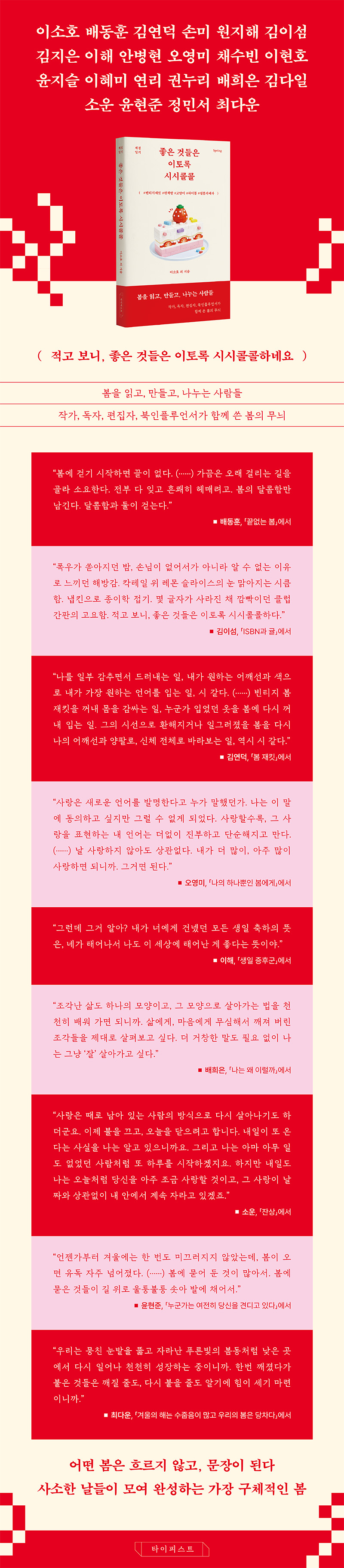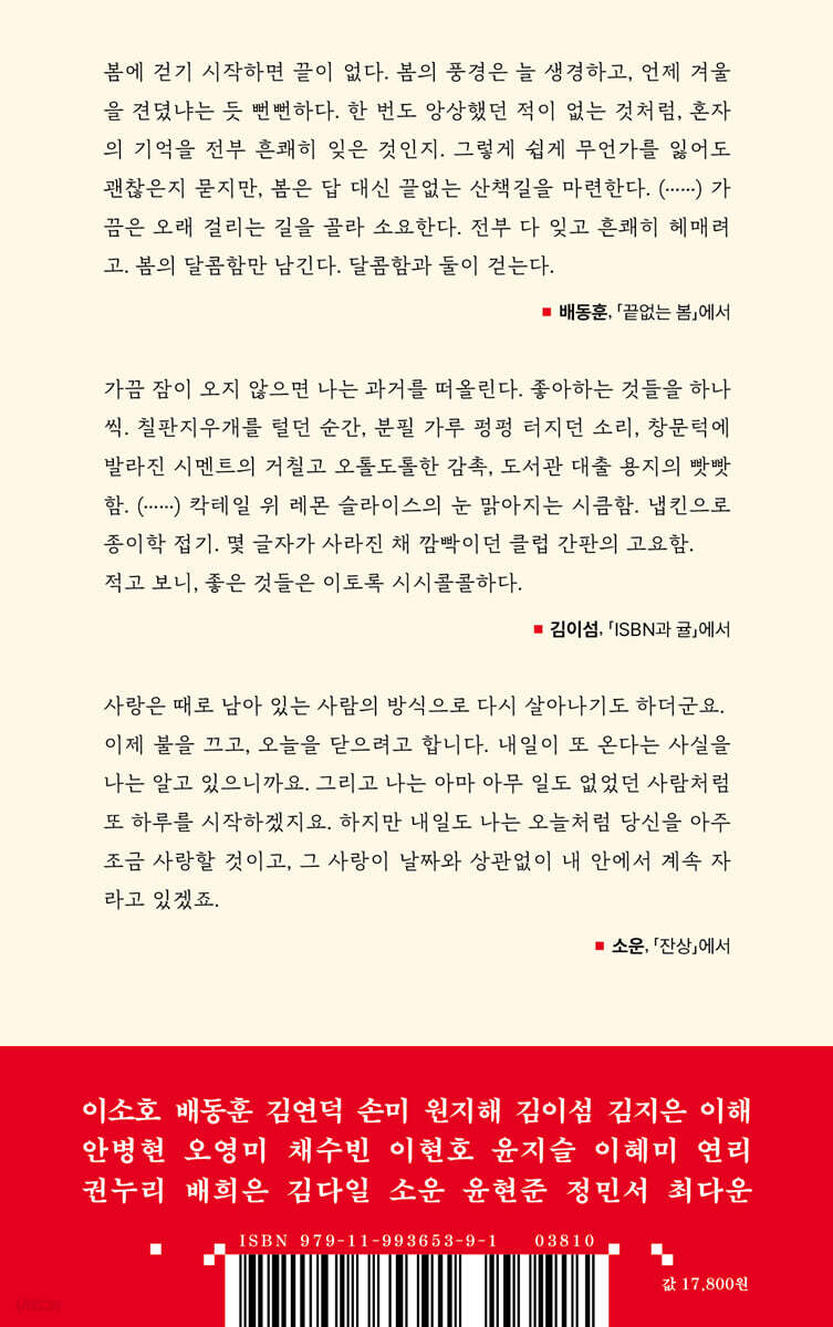 이소호 들여쓰기 없이 첫 문장 시작 그레이 블루지 가장 보통의 가족 배동훈 끝없는 봄 맨손 자전거의 계절 꼬리의 뜻 김연덕 봄 재킷 여행과 봄 생일 손미 손바닥 목소리 마음 한 알 원지해 빛 명상 구애 사랑과 방법 김이섬 ISBN과 귤 돌을 던지면 밤 전체가 울렸다 그린 룸 김지은 건너편 악몽으로부터 ·· 구판본 구합니다 뾰족 귀 강아지 이해 泣かないで 안녕, 발목에 닿는 친구 생일 증후군 안병현 귤락 가이드라인 살아 있는 영혼을 발설하기 오영미 살은 쪄도 맥주는 마시고 싶어 벚나무 아래에는 나의 하나뿐인 봄에게 채수빈 나의 문우 솔민에게-세 번째 교환 편지 나는 수줍어서 그 어깨를 안아준 적이 없었다 사랑하는 아빠에게 이현호 어떤 봄은 안녕보다 길다 어떤 봄은 영원보다 길다 스티커 윤지슬 구멍 당신의 그늘 그림자 만지기 이혜미 꽃과 우울의 계절이 날개를 펼 때 잃어야만 가질 수 있는 것 얼마나 지독하니, 사랑 냄새가 연리 물감을 기다리는 중 왜 일기는 자주 편지가 될까 만난다 권누리 스프링 실루엣(Spring Silhouette) 축하 일기 퀴즈 쇼와 나날 배희은 32살의 나는 잘 살고 있는 걸까 나는 왜 이럴까 4월엔 친구들의 생일이 많다 김다일 걷는 사람의 절벽 오고 있다 크레이프 케이크 소운 미도착 시차 잔상 윤현준 누군가는 여전히 당신을 견디고 있다 봄은 점점 짧아질 것이다 봄과 개 정민서 봄을 기다리는 동안 내가 했던 모래성 금목서 최다운 겨울의 해는 수줍음이 많고 우리의 봄은 당차다 자유의 색은 진한 귤색 오늘 날씨 : 화창한 만남 |