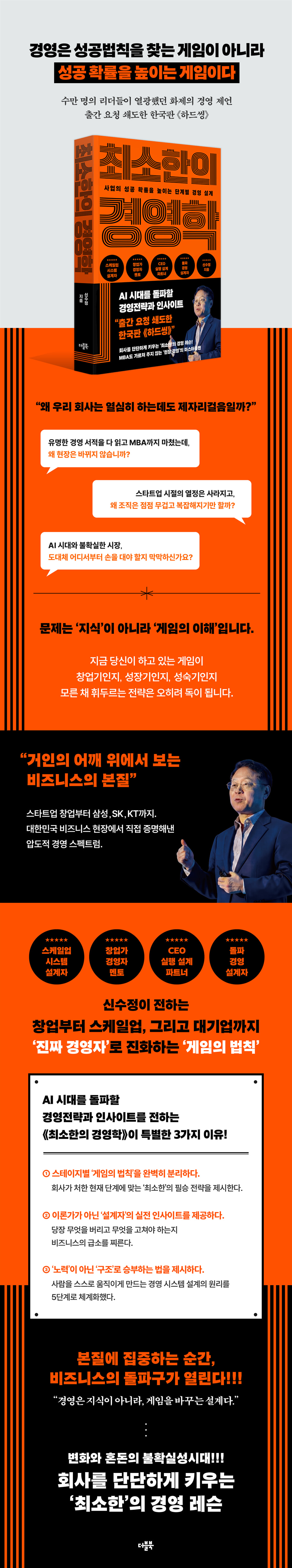 그러므로 이 단계에서의 가장 큰 성공비결을 ‘행운’이라고 말하고 싶다. 성공한 후 후행적으로 분석하면 멋진 아이디어, 멋진 전략, 멋진 실행 팀이 있었다고 이야기할 수 있다. 하지만 이는 대개 사후 편향적 해석일 뿐이다. 성공했다고 말하는 동일한 아이디어, 동일한 전략, 동일한 인력으로 실패한 기업들도 많다. 왜냐하면 이 단계는 가장 불확실할뿐더러 가장 예측이 어렵기 때문이다. 쉽게 말해 맨땅에 헤딩하는 단계이므로 앞을 알기 어렵다. --- 「PART 1 | 스테이지별(창업기, 성장기, 성숙기) 경영전략」 중에서 그러면 핵심 가치란 무엇인지 그 의미를 살펴보자. 핵심 가치는 좋은 단어를 나열하는 데 있지 않다. 나는 핵심 가치를 이렇게 정의한다. “이것을 무너뜨리고 돈을 벌 수 있음에도 끝까지 지키는 것.” 애플은 제품을 더 복잡하게 만들어 돈을 벌 수도 있지만, 그렇게 하지 않는다. 유지하는 데 비용이 들고 포기가 필요한 것이 핵심 가치다. ‘저렴함’이 핵심 가치라면, 더 비싼 제품으로 돈을 벌 수 있더라도 그 기회를 포기할 수 있어야 한다. 모든 것을 다 잡으려 해서는 핵심 가치를 지킬 수 없다. 핵심 가치는 그 회사만의 독특함을 드러내며, 그 가치에 공감하는 사람들이 모이게 만든다. --- 「PART 2 | 스케일업 경영 시스템」 중에서 전략에는 ‘딜레마’가 있다. 남들과 차별화하라고 하지만 심한 차별화로 너무 달라도 실패한다. 극심한 차별화로 망한 대표적 사례가 여객기 콩코드다. 초음속 비행기인 콩코드는 런던에서 뉴욕까지 세 시간이 채 걸리지 않는 빠른 속도를 자랑했다. 그러나 극심한 소음, 배기가스, 연료 비효율 등의 문제가 있었고 사고가 연이어 터지며 악재가 겹쳐 결국 망하고 말 았다. 그러면 남들과 비슷하게 하면 될까? 남들 하는 대로 하면 큰 리스크 없이 안전할 것 같지만 경쟁력이 없다. 트렌드에 맞춰야 한다지만 너무 빨라도 실패하고 너무 늦어도 실패한다. 내 경험상 대기업의 신사업은 대개 늦어서가 아니라 너무 빨라서 실패했다. 안전만 추구하는 전략은 서서히 망하고, 모험을 추구하는 전략은 갑자기 망한다. 방향을 잡기도 어렵지만 타이밍은 더 어렵다. 이러한 딜레마들 속에서 끊임없는 선택을 통해 성공으로 나아가야 한다. --- 「PART 3 | 사업의 본질」 중에서 특별한 이론이나 법칙을 몰라도 주위 사람들을 에너지 넘치게 만드는 사람이 있다. 반면 머릿속에 넘치는 지식이 있어도 주위의 단 한 사람도 움직이지 못하는 사람이 있다. 이것은 바로 스스로가 먼저 신념과 열정을 갖고 있느냐 아니냐의 차이다. 스스로 신념과 열정을 지니지 못했으면서 주위 사람들이 자발적 열정으로 움직여주기를 바란다는 것은 불가능을 꿈꾸는 것이다. 인텔의 CEO였던 앤드루 그로브는 이렇게 말했다. “동기부여를 위해 회사나 상사의 도움이 필요하다면 그 사람은 프로가 아니다. 프로는 스스로 동기를 부여한다. 리더가 진심을 다해 열정적으로 이끌어도 구성원 스스로가 동기를 찾지 못하면 어쩔 수 없다. 동기부여는 상사와 회사의 문제가 아니라 개인의 문제다.” --- 「PART 4 | 조직과 사람을 움직이는 법」 중에서 소위 리더십 대가들은 리더들에게 ‘절대적’이고 ‘만능’인 리더십을 요구한다. 나의 책 『거인의 리더십』에서도 언급했지만 마치 이런 모습이다. “리더는 테레사 수녀처럼 사랑에 가득차나 때로 스티브 잡스나 잭 웰치처럼 냉혹해야 한다. 앤드루 그로브처럼 지독하게 디테일을 파고들어야 하지만 짐 굿나이트Jim Goodnight처럼 관대하며 권한을 위임해야 한다. 베이조스처럼 악착같은 실행력이 있어야 하지만 리처드 브랜슨(Richard Branson)처럼 재미있어야 한다.” 세상에! 현실에 정말 이런 리더가 있을까? 최고 권력의 자리에 오른 대통령들을 한번 생각해보라. 멀리 갈 것도 없이 우리나라 대통령들만 봐도 알 수 있다. 어떤가? 정말 그토록 완벽한 리더십을 갖추고 있는가? 세계 또는 국내 최고 기업들의 유명 창업자들도 떠올려보자. 어떤가? 앞서 언급한 완벽한 리더의 모습을 갖춘 사람이 단 한명이라도 있는가? 단 한 사람도 없다. 그런데 왜 평범한 리더들에게 이런 모습을 강조하고 가르치는 것일까? 나 또한 지금까지 많은 리더를 만났지만 완벽한 리더는 단 한 명도 없었다. 강점이 있지만 큰 약점 또한 있었다. 관대하고 부드러우면 정치력이 약했고, 정치적이고 성과 중심적이고 노련하면 진정성과 사랑이 부족했다. 카리스마 리더는 공감이 부족했고, 공감의 리더는 결단력이 약했다. 이 모든 것을 가진 리더들은 없었으며, 있을 수도 없다. 다시 말해 완벽한 리더란 없다는 말이다. --- 「PART 5 | 경영자와 리더」 중에서 |