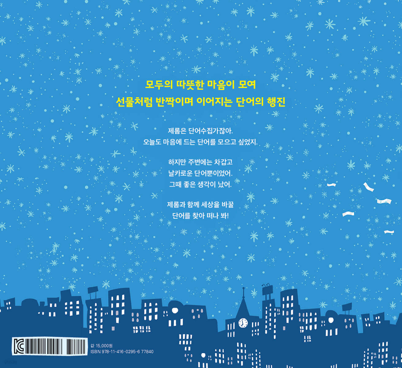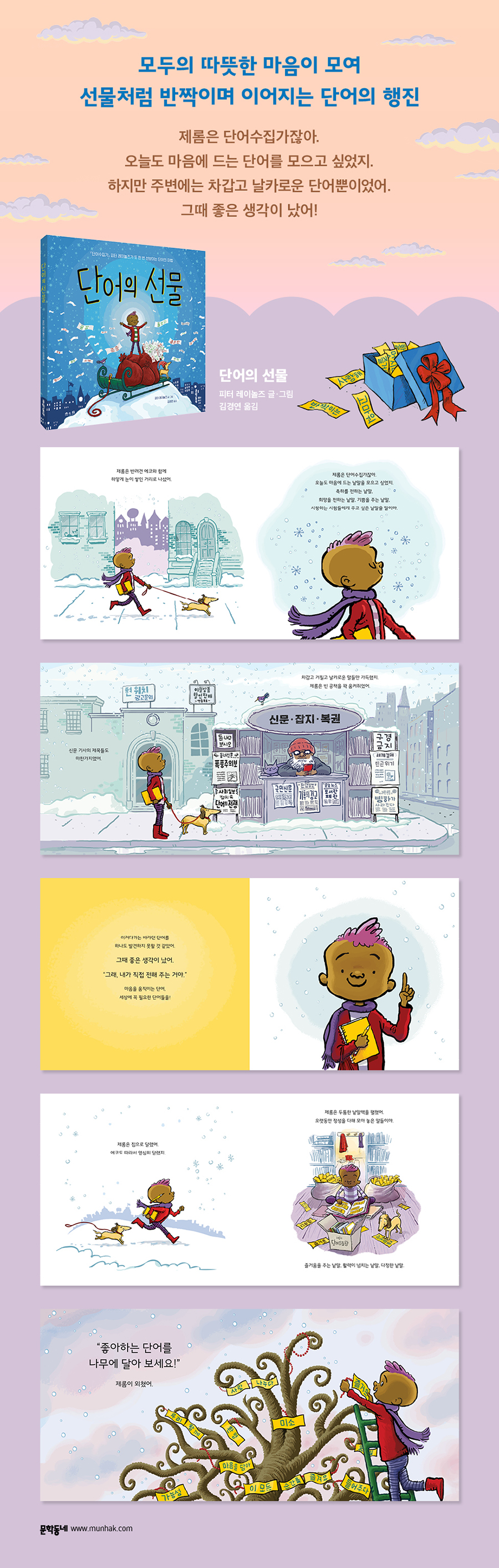 오늘도 마음에 드는 단어를 모으고 싶었어 『단어수집가』에서 마법 같은 단어의 힘으로 많은 이들에게 감동을 주었던 피터 레이놀즈가 주인공 제롬과 함께 신작 『단어의 선물』로 돌아왔다. 하얗게 눈이 쌓인 겨울날 제롬은 평소처럼 마음에 드는 단어를 찾기 위해 반려견 에코와 경쾌한 걸음으로 길을 나선다. 제롬이 찾는 건 축하와 희망을 전하는, 기쁨이 담긴, 사랑하는 사람들에게 주고픈 낱말들이다. 그러나 거리에서 마주치는 단어들은 ‘폐업정리’ ‘출입금지’ ‘견인조치’와 같은 차갑고 날카로운 단어뿐이다. 집으로 열심히 달려간 제롬은 두툼한 낱말책을 펼쳤지 모을 만한 단어를 찾을 수 없어 시무룩하던 제롬은 기발한 아이디어를 떠올리고 미소를 되찾는다. 에코와 함께 뛰어 도착한 집에는 제롬이 오랫동안 모아 온 낱말책이 쌓여 있다. 그는 두툼한 낱말책을 펼쳐 온기와 배려가 가득한 낱말을 고심하여 고르고, 자기 몸만 한 단어꾸러미에 가득 채운다. 그러고는 공원에 있는 커다란 나무 앞에서 큰 소리로 외친다. “모두 함께 낱말 나무를 만들어요!” 누구나 참여할 수 있고, 언제든 볼 수 있고, 자신의 생각을 나눌 수 있는 낱말 나무를 통해 차가운 세상을 녹일 단어를 우리 곁에 있게 하는 것이 바로 제롬의 계획이다. 모이고, 새로 쓰고, 서로 이으니 새봄의 꽃망울처럼 다시 움트는 단어의 의미 어른 아이 상관없이 곳곳에서 모인 사람들은 단어꾸러미에서 단어를 고르거나 직접 써서 자기만의 이야기를 펼친다. 앙상했던 나뭇가지에는 마치 봄이 온 듯 노란색 종이들이 하나둘 꽃처럼 피어나고 이웃, 형제자매, 동물 친구들의 마음이 모두 담겨 그 어느 때보다 반짝인다. 사람들이 진짜로 하고 싶었던 말들이 낱말 나무를 빼곡히 채우고, 나무 꼭대기엔 승리의 깃발 같은 제롬의 소망도 펄럭이고 있다. 과연 제롬의 소망은 이루어졌을까? |