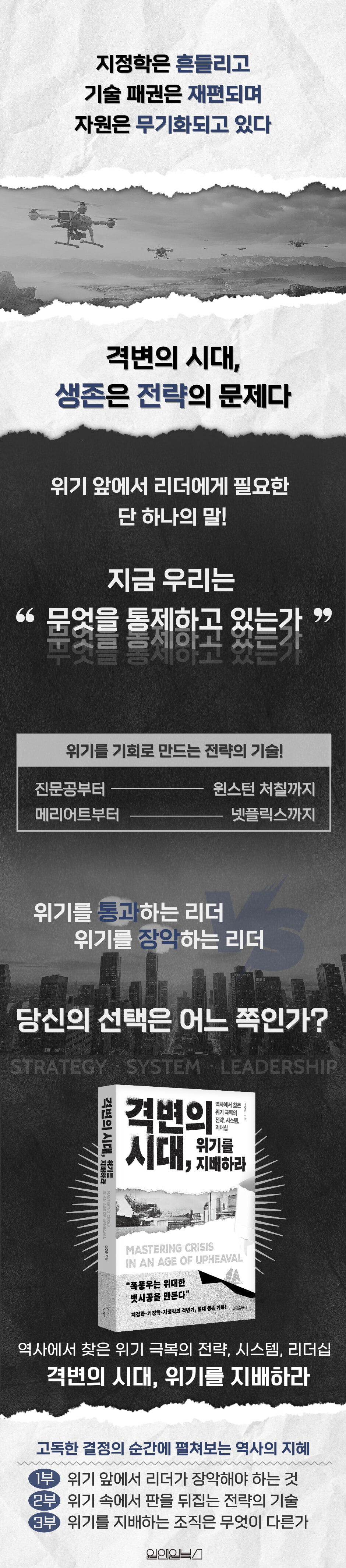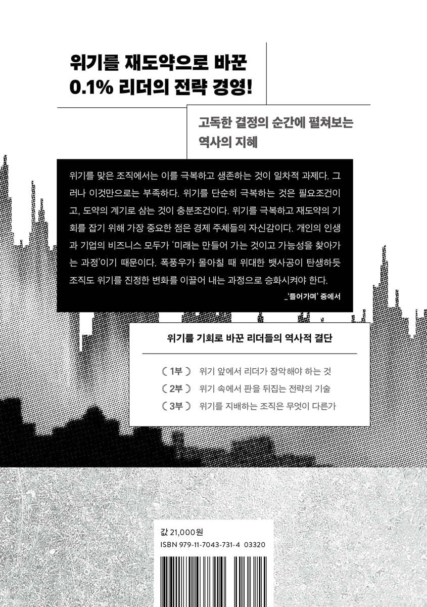 위기의 파도 위에서 길을 찾다 1부 위기 앞에서 리더가 장악해야 하는 것 1장 두려움이 아닌 확신을 전염시켜라 리더의 공포는 조직의 붕괴로 이어진다 | 확신은 말이 아니라 태도에서 전파된다 | 신념이 있을 때 변화는 시작된다 | 평정심을 잃는 순간, 리더십은 끝난다 2장 냉혹한 현실 위에 낙관을 세워라 보고 싶은 현실이 아닌 직면해야 할 현실 | 낙관은 감정이 아니라 전략이다 | 희망은 조직 안에서 설계된다 | 냉정함과 믿음은 함께 갈 수 있다 3장 위기에는 소수가 방향을 잡는다 위기 국면에서는 톱다운이 정답이다 | 컨트롤 타워는 정예로 구성하라 | 평시의 분권은 위기에는 독이 된다 | 핵심 자리에 핵심을 앉혀라 4장 위기를 견디게 하는 단 하나의 가치 의미 없는 일에 사람은 목숨을 걸지 않는다 | 명분은 조직의 정신력을 끌어올린다 | 위기를 대하는 태도를 명확히 하라 | 결집할 가치가 있을 때 조직은 버틴다 5장 유연성은 전략이고, 원칙은 생존이다 원칙은 위기일수록 더 엄격해야 한다 | 원칙은 말이 아니라 힘으로 지켜진다 | 원칙 없는 돌파는 없다 | 철학 없는 유연성은 파멸로 간다 | 원칙 훼손은 공동체를 파멸시킨다 6장 내부의 균열을 방치하지 마라 외부보다 위험한 것은 내부의 분열 | 균열은 초기에 제거해야 한다 | 위기 대응력은 내부 단속에서 나온다 | 분열을 키우는 관용은 치명적이다 2부 위기 속에서 판을 뒤집는 전략의 기술 7장 같은 방식으로는 같은 실패만 반복된다 승리는 반복되지 않는다 | 틀을 깨야 출구가 보인다 | 기존 사업을 다시 정의하라 | 길이 막히면 판을 바꿔라 8장 가장 단단한 지지 기반부터 지켜라 근거지가 무너지면 전쟁은 끝이다 | 지지 기반 없는 확장은 허상이다 | 충성도는 최고의 성장 자산이다 | 위기일수록 중심을 강화하라 9장 최악을 상정하는 순간, 위기는 통제된다 위기는 단속점에서 터진다 | 최악을 가정하고 최선을 설계하라 | 위기를 견디는 시나리오를 준비하라 | 예고된 위기는 이미 반쯤 해결된 위기다 10장 적을 선택적으로 상대하라 강자는 무력화하거나 끌어들여라 | 약자는 정면으로 제압하라 | 영원한 적도, 영원한 동지도 없다 | 생존 앞에서 전략은 냉혹해야 한다 11장 심리를 장악한 쪽이 승리한다 리더의 진짜 무기는 소프트 파워다 | 정세 판단과 심리전이 결합되면 필승이다 | 대중의 감정은 설계할 수 있다 | 인간의 불완전함을 전략으로 활용하라 3부 위기를 지배하는 조직은 무엇이 다른가 12장 위기를 제도 개혁의 기회로 바꿔라 극복만으로는 부족하다 | 위기 속에서 제도를 재설계하라 | 새로운 비즈니스 모델은 위기에서 탄생한다 | 위기를 도약의 발판으로 삼아라 13장 보상 구조가 행동을 결정한다 위기 극복에도 설계가 필요하다 | 돈과 명예는 가장 현실적인 동기다 | 성과와 보상을 정직하게 연결하라 | 신뢰는 보상 구조에서 완성된다 14장 통합할 수 있을 때, 공동체는 산다 포용은 이상이 아니라 전략이다 | 원칙 있는 통합이 핵심이다 | 상생의 철학이 재도약을 만든다 | 공동체의 생존이 최종 목표다 |