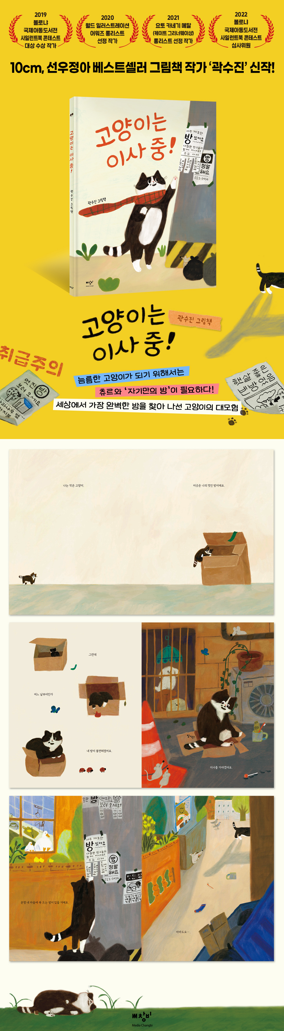 늠름한 고양이가 되기 위해서는 츄르와 ‘자기만의 방’이 필요하다!세상에서 가장 완벽한 방을 찾아 떠난 고양이의 대모험 마음에 쏙 드는 방을 찾아 산과 들, 사막과 남극, 심지어 바닷속까지 이사를 반복하는 길고양이의 모험을 담은 그림책 『고양이는 이사 중!』(미디어창비 2023)이 출간되었다. 볼로냐 국제아동도서전 사일런트북 콘테스트 대상 수상, 월드 일러스트레이션 어워즈?요토 카네기 메달(케이트 그리너웨이상) 후보 지명, 2022년 볼로냐 국제아동도서전 사일런트북 콘테스트 심사위원 등 세계 무대에서 활약하는 동시에, 10cm 『10CM 그라데이션 Gradation』, 선우정아 『도망가자 Run with me』 등 노랫말 그림책으로 국내 성인 독자에게도 많은 사랑을 받는 곽수진 작가의 신작이다. “온 세상을 다녀 봐도 마음에 드는 방이 없어요….저는 도대체 어디에서 살아야 할까요?”주인공 고양이는 어릴 적 살던 안락한 종이 박스 집이 부서지자 이사를 결심하고 새로운 보금자리를 찾아 떠난다. 생쥐네 쥐구멍, 토끼네 땅굴, 박쥐네 동굴, 딱따구리네 나무집, 문어네 바닷속, 펭귄네 남극, 낙타네 사막까지. 지구 곳곳을 돌아다니지만 그때마다 너무 좁거나 높고, 너무 어둡거나 시끄럽고, 너무 춥거나 더워 영 탐탁해 보이지 않는다. 완벽한 방 찾기에 지친 고양이가 급기야 지나가는 달팽이의 집을 부러워하기에 이른 그때, 고양이의 눈앞에 커다란 박스가 뚝 떨어지는데…. 이사할 방을 찾아 헤매던 고양이에게는 그 커다란 박스가 바로 ‘세상에서 가장 완벽한 방’이었던 것! 다양한 동물의 집을 구경하던 고양이가 마침내 찾은 새 방이 결국엔 원래 살던 곳과 거의 동일한 셈이지만, 고양이는 실망하기는커녕 아주 만족한 얼굴로 골골송을 부르며 독자들의 웃음을 자아낸다. 어린이들의 문학적 상상력을 쑥쑥 키워 줄 ‘곽수진’표 고양이 그림책그림책 『고양이는 이사 중!』은 영국에서 그림책 작가로 데뷔한 곽수진 작가가 2019 볼로냐 국제아동도서전 수상 이후 오랜만에 글과 그림을 모두 작업한 ‘어린이를 위한 그림책’이다. 특히 이번 신작은 작가 특유의 유화적인 묘사가 그 어떤 작품보다 생생하게 빛을 발한다. 100% 디지털 드로잉 작업임에도 마치 손에 붓을 쥐고 종이에 직접 그린 듯한 텍스처가 돋보이는 질감 표현은 작품에 생동감을 불어넣어 줄 뿐만 아니라 독자들로 하여금 앞으로 펼쳐질 고양이의 모험 속으로 흠뻑 빠질 수 있게 한다. 어린이 독자들은 곽수진 작가가 새롭게 창작한 그림책 세상 속에서 주인공 고양이가 이번에는 어떤 동물의 집에 가야 할지를 함께 고민하고, 완벽한 보금자리를 찾아 끊임없이 도전하는 고양이를 어느새 응원하게 된다. 그리고 어렵게 찾은 새로운 삶의 터전에서 가족을 꾸린 고양이가 다음에는 아기 고양이들과 어떤 모험을 펼치게 될지 그 뒷이야기를 자유롭게 상상하게 한다. 또한 이 책을 함께 읽는 양육자나 그림책을 사랑하는 성인 독자에게는 귀엽고 매력적인 고양이가 등장하는 ‘고양이 그림책’으로 소장가치를 더하며, 어린이와 어른 누구나 즐겁게 감상할 수 있을 것이다.