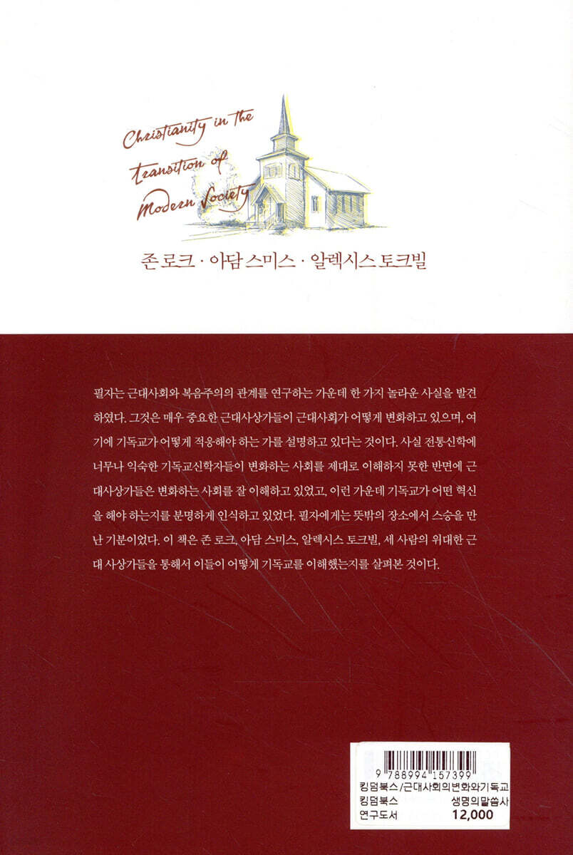 저자는 근대사회와 복음주의의 관계를 연구하는 가운데 한 가지 놀라운 사실을 발견했다. 그것은 매우 중요한 근대사상가들이 근대사회가 어떻게 변화하고 있으며 여기에 기독교가 어떻게 적응해야 하는 가를 설명하고 있다는 것이다. 사실 전통신학에 너무나 익숙한 기독교신학자들이 변화하는 사회를 제대로 이해하지 못한 반면에 근대사상가들은 변화하는 사회를 잘 이해하고 있었고, 이런 가운데 기독교가 어떤 혁신을 해야 하는지를 분명하게 인식하고 있었다. 저자는 뜻밖의 장소에서 스승을 만난 기분이었다. 이 책은 존 로크, 아담 스미스, 알렉시스 토크빌, 세 사람의 위대한 근대 사상가들을 통해서 이들이 어떻게 기독교를 이해했는지를 살펴본 것이다.