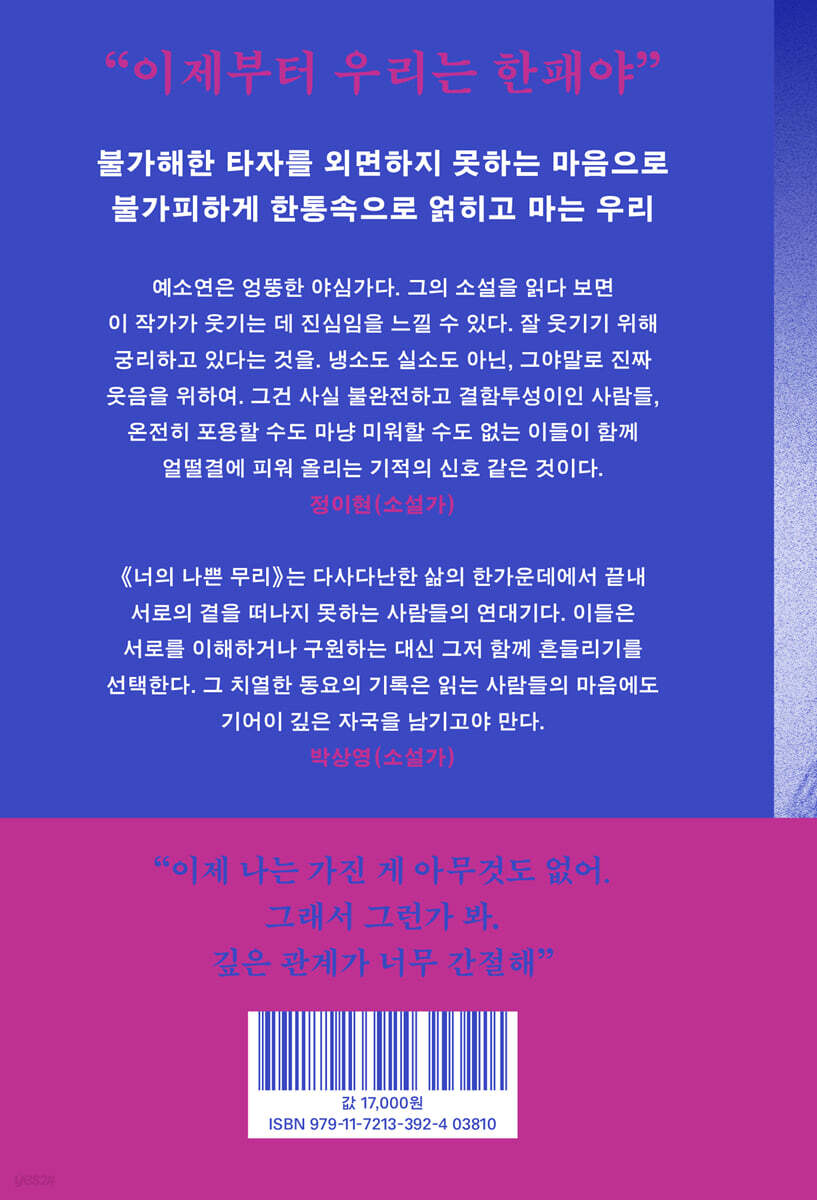 《너의 나쁜 무리》는 다사다난한 삶의 한가운데에서 끝내 서로의 곁을 떠나지 못하는 사람들의 연대기다. 이들은 서로를 이해하거나 구원하는 대신 그저 함께 흔들리기를 선택한다. 그 치열한 동요의 기록은 읽는 사람들의 마음에도 기어이 깊은 자국을 남기고야 만다. - 박상영 (소설가)