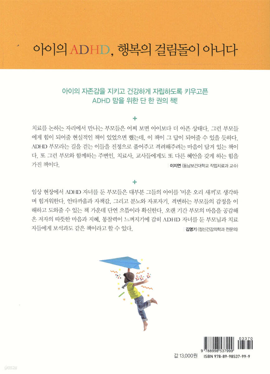 1장 ADHD라는 말 앞에서 어쩔 줄 모르는 부모들 내 아이를 보듬을 든든한 집이 되기에는 너무도 위태로운 부모의 감정 나를 괴롭히려고 태어난 아이인가? -아이보다 위급한 부모의 마음 ADHD 라벨링에 아이보다 부모가 더 무너지는 이유 -널뛰는 부모 감정의 폭 바닥을 치는 부모의 자기 효능감 -어떻게든 원인을 찾아 탓하고픈 마음, 죄책감 병원 순례를 부르는 현실 거부 -감정조절이 힘들어지고 방치된 부모의 마음이 더 위급해지기 전에 -불안과 분노로 점철된 부모들/힘든 미래가 될 거라는 막연한 불안감 **낮은 나를 위로하는 마음으로 2장 나도 모르게 아이를 대하는 행동이 달라지다 ADHD라는 잣대와 상황 앞에 불쑥 튀어나오는 부모의 행동과 생각 다잡기 맞서 싸울 것인가, 도망갈 것인가! -도망갈 것인가? /싸울 것인가? /그것도 아니라면… 생각의 안경을 수시로 점검해야 한다 -부정적 감정에 얼룩지는 생각들/나도 모르게 생기는 편견들/불행이라는 ‘생각’이 부모 자신의 문제를 더 키운다 말처럼 되지 않는 ‘받아들임’의 진통기-아이만큼은 양보가 되지 않기에/먼저 나란 사람을 알아야 한다 **아이의 상태를 온전히 받아들이려면 3장 ADHD 부모에게도 받아들이기 위한 도움이 필요하다 새로운 ‘내’가 되어 우리 아이를 있는 그대로 받아들이기 위한 조언 아이의 돌발성 움직임에 당황하지 않으려면 -아이의 과잉 행동에 대해 수업의 방해꾼 소리를 듣는다면 -아이의 충동성에 대해 일상의 일들을 자꾸 까먹는 아이 -아이의 기억 문제에 대해 생각이 붕붕 떠다니듯 집중하기 어렵다면 -아이의 부주의함에 대해 **아이와 함께 알아보는 주의력 검사 4장 내 아이와 행복해지는 데 ADHD는 결코 걸림돌이 아니다 현실적인 문제 앞에서 ADHD 아이를 도울 수 있는 솔루션 부모와 자식의 관계도 다시 출발선에 세우자 -생각보다 깊게 내린 미움이란 감정 뿌리/오랜 골이 파인 관계를 회복하기 위해 일상생활에서 갈등을 줄여나가자 -끝나지 않는 잔소리 폭탄으로 전쟁 같은 일상들/ 평화로운 일상, 불가능한 것이 아니다 친구들과 잘 어울리게 도우려면 -친구관계가 나아지면 아이의 자존감도 높아진다/친구들과 대화하기 전 ‘연(KITE)만들기' 연습 학교 선생님과 소통하다 -또 다른 협력자, 선생님과 함께 가는 길 공부는 포기해야 하는 영역이 아니다 -백전백승의 공부전략, 부모 욕심 버리기/일반적인 공부법은 버리자 또 다른 장애물을 넘는 시기, 사춘기 -ADHD 아이, 이제 독립 욕구가 치솟는다!/사춘기, 더 예민해지는 여자아이들/자립할 수 있는 힘을 심어주다 **ADHD 자녀의 갈등 영역 점검표 5장 아이를 지키기 위해 내 마음을 잘 지켜야 한다 아이와 행복해지는 삶, 부모 자신을 잘 보듬고 지치지 않기 위한 마음처방전 마음의 짐이 버겁게 느껴질 때 -부모의 감성 에너지를 회복해야 할 시간 남편, 내 편인가? 남 편인가? - 마음의 지원군이 필요하다 마음의 여유를 갖기 위해 -변화에 좀 더 유연해지는 마음 상태를 위하여 무엇이든 강점부터 보는 습관을 들이자 -‘믿어주기’, 부모가 아이에게 해주는 가장 쉽고 값진 것 에필로그 -ADHD 아이의 부모로 산다는 것, 그 의미를 찾는다! |