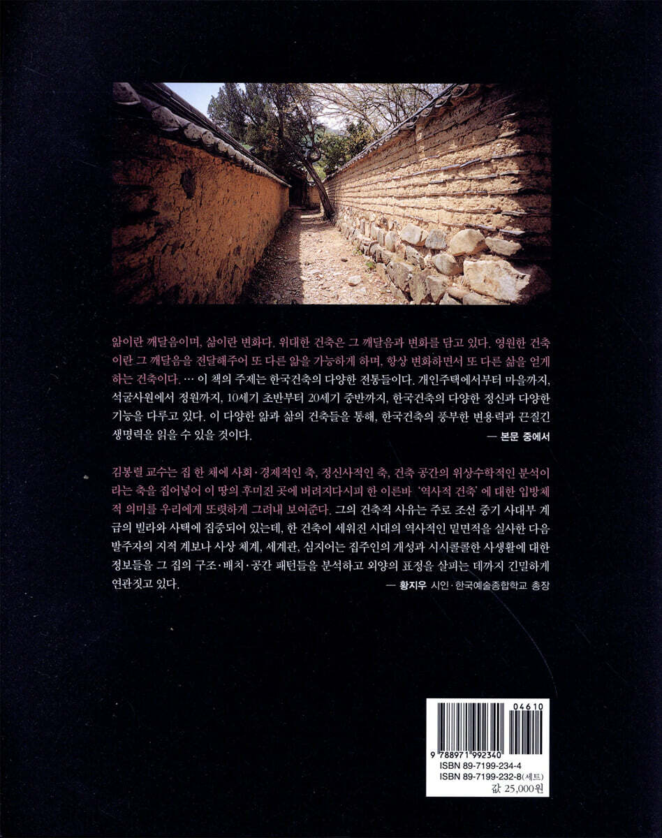 초판 서문 ㅣ 깨달음과 변화의 영원함 1. 폐허 속의 상상력, 미륵대원 상상력의 원천, 건축적 폐허|하늘재 밑의 석굴사원|자연에 대한 순응과 인공적 변형|상상적 복원|주변의 폐허들 2. 소리와 그늘과 시의 정원, 소쇄원 창평들과 별뫼의 원림들|소쇄원 경영의 뜻|3개의 레벨과 건물|구성 요소, 담장과 물길|맑고 시원함이 오는 곳|소쇄원 사람들의 보존 노력|인근의 정자들 3. 은둔을 위한 미로들, 독락당과 옥산서원 회재 이언적의 사상과 건축|적극적인 은둔의 조건|은둔을 위한 미로의 구성|독락당, 홀로 즐거운 집|옥산서원의 건축사|정통주의의 재현|안강 세 골짜기의 건축 4. 중층건축의 지역성, 양진당과 대산루 낙동강 서쪽의 이상한 집들|상주 양진당|양진당과 관련된 건축들|상주 대산루|우산동천의 건축들|상주의 건축이 갈망했던 것|상주의 이층집들 5. 예학자의 이상향, 윤증고택 윤증과 중세의 이상|향촌에 공개된 장원|안채와 안마당|사랑채와 행랑채|절제와 여유|윤증 가의 다른 건축들 6. 중세적 장원의 흔적, 선교장 강릉, 변방의 중심|장원으로서의 선교장|두 집의 집합체|집합의 데이텀들 7. 공동체 마을과 건축, 방촌마을 전통 마을에서 배우는 것|숨겨진 광맥, 방촌마을|마을과 땅의 생김새|공동체의 장소|마을 길의 구성|살림집들의 모습|개별 주택의 발견|생활 속의 디자인 능력|주변의 공동체 건물 8. 설화로 이룬 천상의 세계, 광한루원 지상에서 천상으로|남원부의 센트럴 파크|누각이란 무엇인가|누대와 누원의 사상과 설화 체계|설화와 문학이 빚은 정원 누각 9. 최후와 최고, 선암사 선암사가 최고인 이유|조계산의 두 사찰 이야기|산 속의 자족 도시|살아 있는 수도원 집단 [부록] 건축 읽기에 도움이 되는 용어해설|도면 목록|찾아보기 [발문] 옥시모론, 조선집의 아름다운 비밀 ㅣ 황지우(시인·한국예술종합학교 총장) |