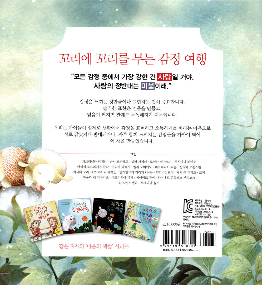 2년 연속 스페인 베스트셀러 1위 “싫어!” “엄마 미워!” “으아아아앙.” 아이들은 감정 표현에 서툽니다. 3세 정도부터 자신의 감정을 온몸으로 보여주고, 5세 정도부터는 타인의 감정에 공감하기도 하지만 그것을 언어로 표현하는 데는 익숙하지 못합니다. 특히 자기표현의 욕구가 커지는 시기에는 어감이 강한 비속어를 사용해 자신의 화를 표현하기도 합니다. 엄마는 아이의 그런 행동에 당황하고 갖가지 고민에 빠지지만, 아이의 진심은 그렇지 않습니다. 단지 자신의 감정을 표현하고 싶은 마음은 큰데 방법을 몰라 그러는 것입니다. 왜 그럴까요? 아이들은 어른을 보고 배웁니다. 그런데 어른들도 자신의 감정을 표현하는 데 평소 4~5가지 개념밖에 사용하지 않습니다. 하지만 우리는 인식하지 못하죠. 만일 부모님이 오렌지를 설명할 때 오렌지색과 노란색만 언급하면 아이는 똑같은 식으로 이야기를 할 것입니다. 아이가 받는 정보의 가장 중요한 원천은 모범, 바로 어른의 행동이니까요. 이러한 사실을 의식한 스페인의 많은 선생님과 부모님이 [42가지 마음의 색깔]을 활용하고 있습니다. 감정과 감정 사이의 색을 풍부하게 만들어서, 아이들이 감정을 표현할 수 있는 수많은 단어를 익힐 수 있게 말입니다. 연령별 활용 가이드 - 3~6세 아이에게 읽어 줄 때 가장 기본적인 감정(포근함, 부끄러움, 미움, 따분함, 행복)을 표현한 그림으로 시작해 보세요. 그림 속의 동물들에게 무슨 일이 일어났는지, 그림을 보고 어떤 느낌이 드는지, 그 이유는 무엇인지에 대해서 이야기를 나눠 보시기 바랍니다. 아이가 아직 모르고 있던 어떤 감정을 경험하게 되었을 때, 이 책에서 그 내용을 찾아 읽어 줄 수도 있습니다. 그러면 아이는 자신이 느낀 것과 배운 것을 비교해 보게 될 것입니다. 이는 마음을 가라앉히는 진정제 효과도 있고, 자신의 감정을 표준화시키는 효과도 있을 것입니다. - 7~9세 아이에게 읽어 줄 때 특정 감정을 느꼈던 자신의 경험을 아이와 함께 나누어 보세요. 강한 유대감을 만들어 줄 것입니다. 아이는 자기의 부모님도 자기처럼 두려움을 느끼기도 하고 불안을 느끼기도 한다는 것을 알고 놀랄 것입니다. 이는 아이의 공감 능력과 타인의 입장에서 생각해 볼 수 있는 능력을 강화시켜 줄 것입니다. - 10~12세 아이에게 읽어 줄 때 이 나이의 아이들은 놀랍고도 신비로운 신체적인 변화와 정신적인 변화를 경험하기 시작합니다. 이 책은 커다란 변화의 시기에 아이들의 든든한 마음 친구가 되어 줄 것입니다. 매일 독서를 통해 자신이 겪은 모든 감정들을 반추해 봄으로써, 스스로 자신의 감정을 생생하게 느낄 수 있도록 도울 것입니다. 느낄 수 있다는 것은 특권입니다 우리가 스스로의 행복을 창조할 수 있는 능력을 갖추기 위해서는 정신 발달 단계에서 감정에 대한 지혜를 통합하는 학습을 해야만 합니다. [42가지 마음의 색깔]은 가장 기본적인 교육 보조재로, 아이가 감정에 관한 지혜를 키울 수 있게 해 줄 것입니다. 타인의 감정을 이해하고, 자신의 감정을 정확하게 표현하고, 이를 다른 사람과 비교해 보면서 아이는 자신의 행복을 만들고, 관계의 토대를 쌓는 법을 배우게 될 것입니다. 인간 관계의 첫걸음, 감정 표현 어른도 제대로 조절하지 못하는 것이 바로 감정입니다. 온전히 나의 것이지만, 나만의 힘으로는 다루기 어려운 것이지요. 특히나 강한 감정인 ‘화’ ‘미움’ ‘짜증’ 등은 쉽게 나의 이성을 마비시킵니다. 그런 것을 해소하는 가장 좋은 방법은 참는 것이 아니라 표현하고 공감받는 것입니다. 아이들은 상황 때문에 우는 것이 아니라, 감정 때문에 웁니다. 같은 상황에서도 부모가 아이의 감정을 받아주고 이해해주면, 아이는 금세 울음을 멈춥니다. 부모님과의 감정적인 소통을 통해 자신의 감정을 추스리는 법을 배우고, 부모님이 보여준 행동을 익힙니다. 그리고 이러한 감정 학습의 결과는 아이의 성장 과정에서도 뚜렷이 드러납니다. 부모와 감정적 소통이 원활한 아이는 친구와의 소통도 원활하고, 그런 소통 능력은 좋은 관계를 만드는 바탕이 됩니다. 아이와 감정을 나누고 솔직하게 표현해 보세요. 서로에 대한 믿음이 강해지고, 돈독한 관계를 만드는 데도 도움을 줄 것입니다. |