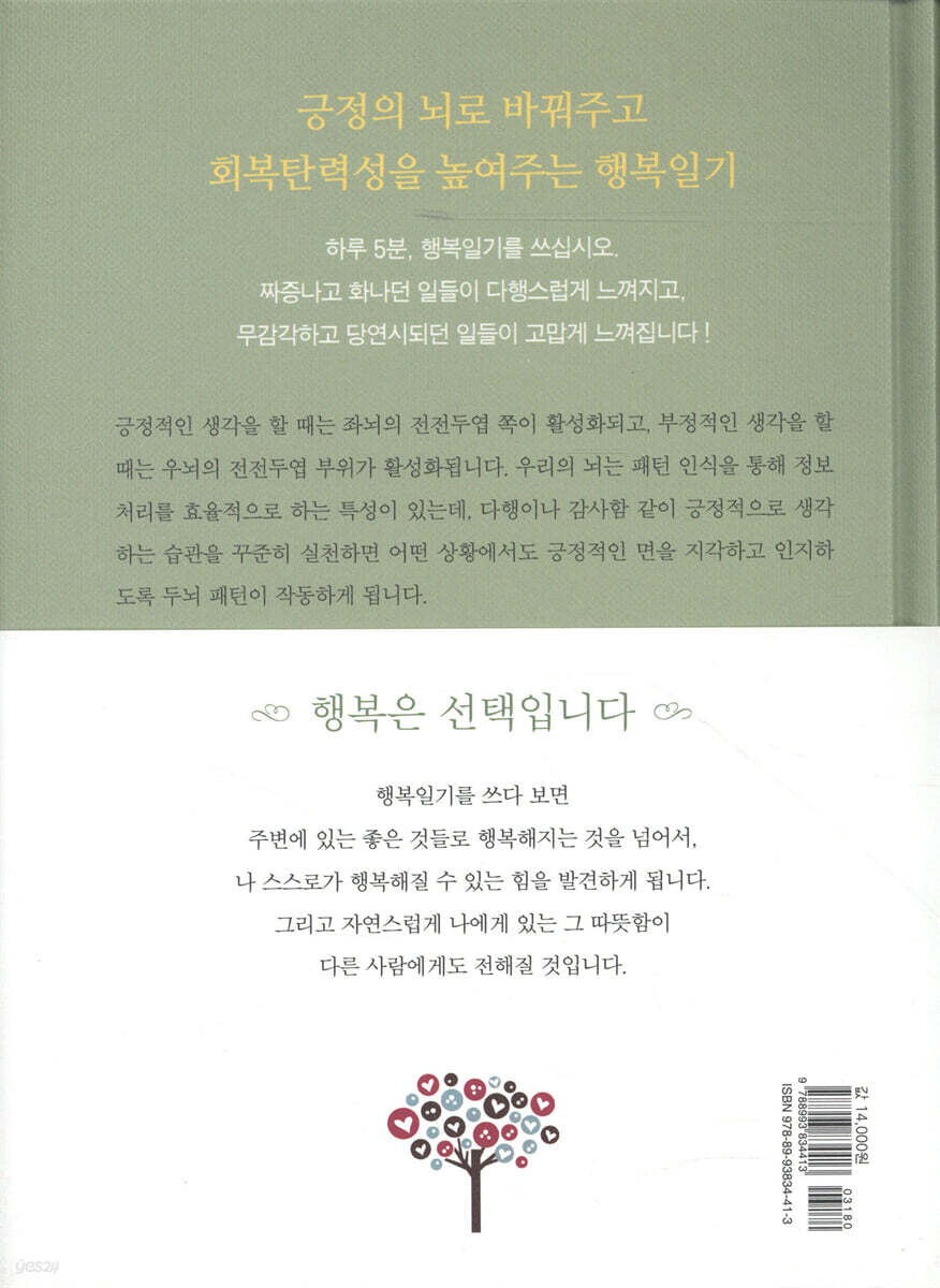 40년간 실천해온 행복의 비결 하루 5분, 행복일기를 쓰십시오. 짜증나고 화나던 일들이 다행스럽게 느껴지고 무감각하고 당연시되던 일들이 고맙게 느껴질 것입니다 ! “행복일기는 학창시절부터 제가 오랜 기간 동안 실천하면서 그 효과를 확신하여 여러분께 추천해드리는 매일의 자기점검과 자기성장의 기록입니다. 행복일기는 또한 30년간 수많은 연구들로 입증된, 매우 효과적으로 행복을 만들어가는 지름길입니다.”-최성애 박사(HD행복연구소 소장) 대한민국 심리치료 전문가, 최성애 박사가 40년간 실천해온 행복의 비결을 한 권에 담다 하버드 대학 졸업생들의 추적연구와 방대한 긍정심리학의 연구 그리고 최근의 뇌과학을 통해서 밝혀진 성공하고 행복한 삶의 공통점은‘운동, 건강한 인간관계, 감사의 마음, 선행’등으로 나타났다. 그런데 놀라운 사실은 최성애 박사가 40년간 실천해온 행복일기가 바로 그러한 요소들로 구성되어 있다는 사실이다. 행복일기는 5가지 세부 일기로 나뉘는데, 운동일기와 다행일기, 감사일기와 선행일기, 감정일기가 바로 그것이다. 이 5가지 세부일기를 날마다 써 가다 보면 어느새 우리의 머릿속에 긍정적 사고의 회로가 만들어지고, ‘자기-알아차림’이 높아져 스트레스 상황을 더욱 쉽게 이겨낼 수 있게 되는데, 최성애 박사와 조벽 교수가 세운 HD행복연구소에서는 수석 강사진 모두가 진정성과 실력을 갖춘 전문가로 살아가기 위해 날마다 행복일기를 쓰며 자기점검과 자기조율을 생활화하고 있다. 우리의 뇌 속에 ‘긍정적 사고의 회로’를 만들어주는 행복일기 행복일기는 단순히 긍정심리학의 효과를 설명한 책이 아니라, 긍정적 사고를 ‘실제 내 것으로’만들 수 있도록 고안되었다. 예컨대, 행복일기 2단계에서는 ‘다행일기’가 시작되는데, 뇌과학 연구에 의하면 우울, 걱정, 짜증, 분노 등 부정적인 생각을 할 때에는 우뇌의 전전두엽이 활성화되고, 반대로 감사, 기쁨, 다행 등 긍정적인 생각을 할 때는 좌뇌의 전전두엽이 활성화된다고 한다. 그리고 평소 같은 행동을 자주 반복하면 두뇌의 회로가 만들어지고 강화되는데, 습관이 들 정도로 강화되려면 같은 행동을 약 3주(21일) 정도 반복해야 하고, 저절로 할 수 있을 만큼 자연스럽게 몸에 익으려면 평균 63일~100일 정도가 걸린다고 한다. 그런데 매일 다행일기를 써 가다 보면, 좌뇌의 전전두엽이 활성화되고, 그것이 반복되다 보면 긍정적 사고의 회로가 만들어져 감사하는 마음의 습관을 갖게 되는 것이다. 이처럼 행복일기는 실제로 우리 뇌 속에서 회로의 변화를 가져오는 놀라운 심리치유 프로그램이다. 1~5단계로 이루어지는 단계별 프로그램 & 하루 5~10분이면 충분 행복일기 기초편은 우리의 뇌 속에 긍정적으로 생각하는 습관의 회로가 만들어지도록 총 8주 동안 5단계로 나뉘어 진행된다. 1단계부터 5단계까지 내용이 조금씩 발전하는 식이라 누구나 쉽게 따라할 수 있고, 시간도 하루 5~10분이면 충분하다. 사실 행복의 비결은 그리 거창하지 않다. 하루 5~10분만 내어 행복일기를 쓰는 것만으로 행복에 가까워질 수 있다고 최성애 박사는 말한다. 어려움을 딛고 일어서는 힘, 즉 회복탄력성을 높여주는 행복일기 행복이란 불행한 일이 전혀 생기지 않는 것이 아니라, 불행한 일이 닥쳤을 때 이를 잘 이겨내고 다시 일어서는 것이다. 우리 삶에서 일어나는 일들을 우리가 전부 통제할 수는 없다. 하지만 일어난 일들을 바라보는 우리의 시각과 해석은 바꿀 수 있다. 해석을 어떻게 하느냐에 따라 삶은 살만해지기도 하고, 반대로 미치도록 힘든 곳이 되기도 한다. 성공하고 행복한 사람들은 긍정적 해석의 달인들이다. 앞서 말했듯이, 행복일기를 꾸준히 써 가다 보면 뇌 속에 긍정적 사고의 회로가 만들어져, 어려운 일이 생겼을 때 그 상황에서 다행인 일, 감사한 일을 찾는 것이 한결 쉬워진다. 그러면 힘든 상황을 좀 더 쉽게 이겨낼 수 있게 되는데, 이처럼 어려움을 딛고 일어서는 힘을 회복탄력성이라 한다. 행복일기는 이 회복탄력성을 높이는 데 아주 효과적이다. |